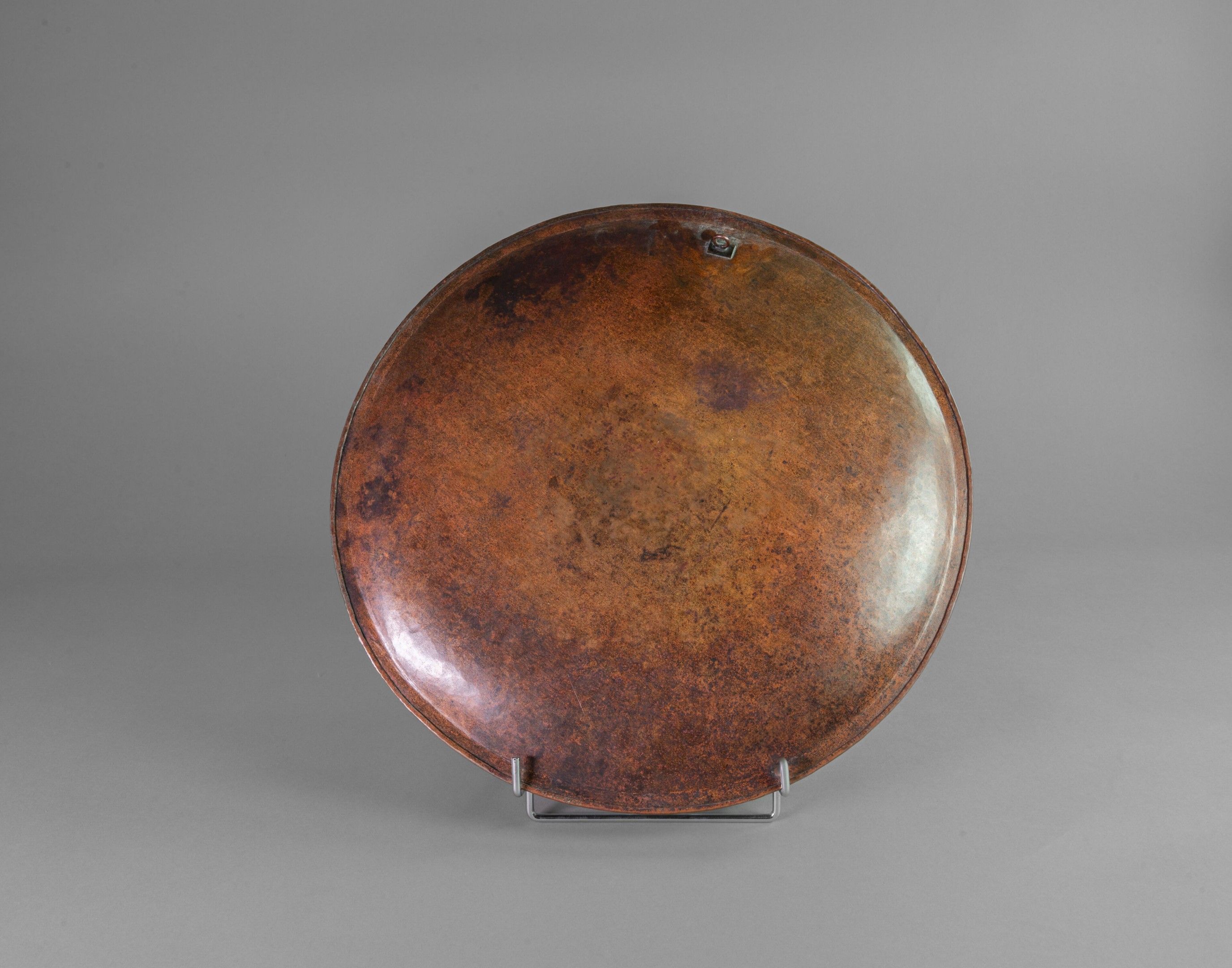A copper dinanderie dish with cast and patinated decoration of a frieze of spirals in the central part surrounded by small lozenges and triangles on a starry background and wave motifs around the rim, signed on the reverse and marked C 25.