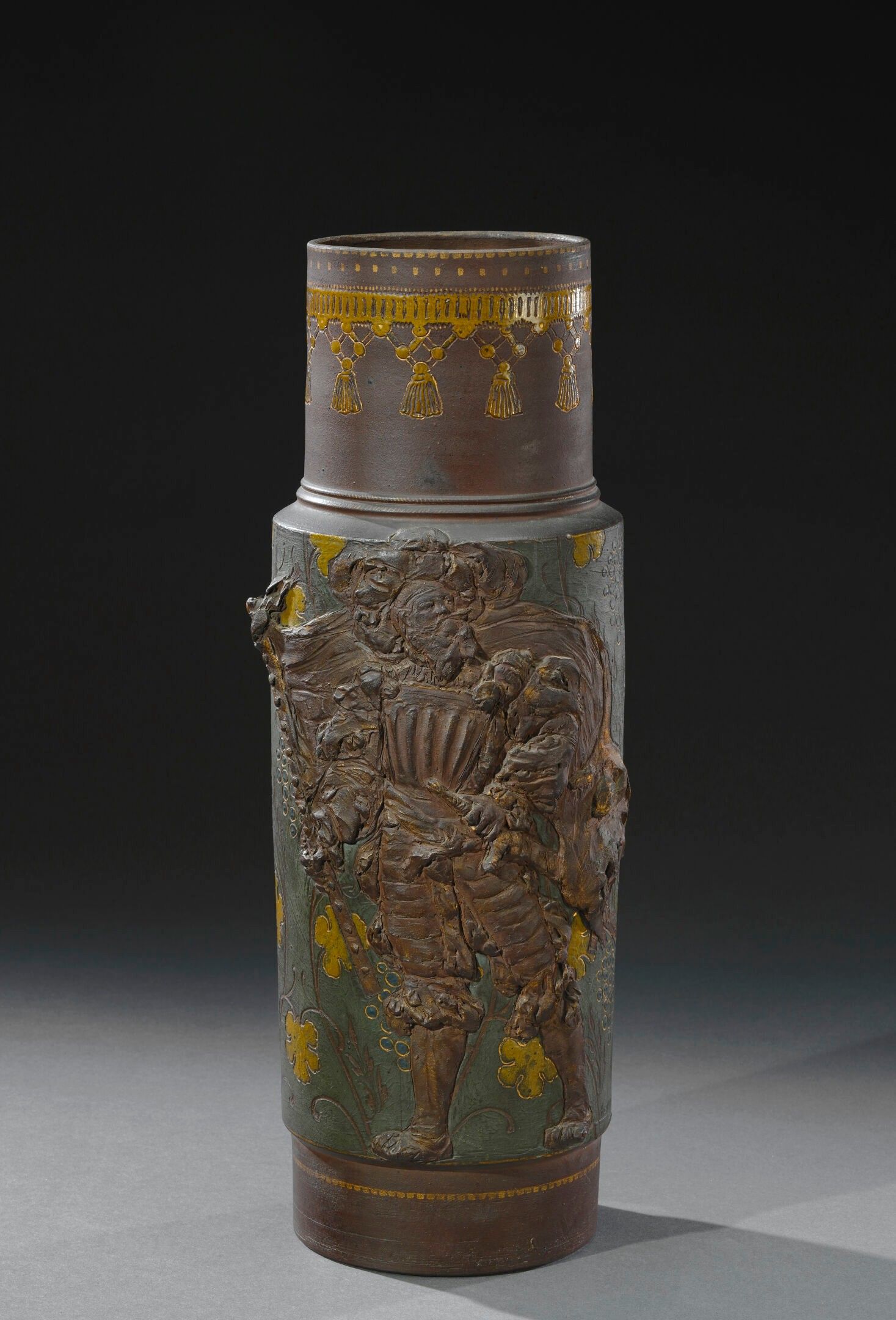 An important and rare brown stoneware scroll vase, decorated on the body with a musketeer in relief holding a flag carried by the wind, on a green ground engraved with foliage and bunches enhanced with yellow and blue engobes and gold; the neck and foot left earth-toned, the neck decorated with a frieze of passementerie