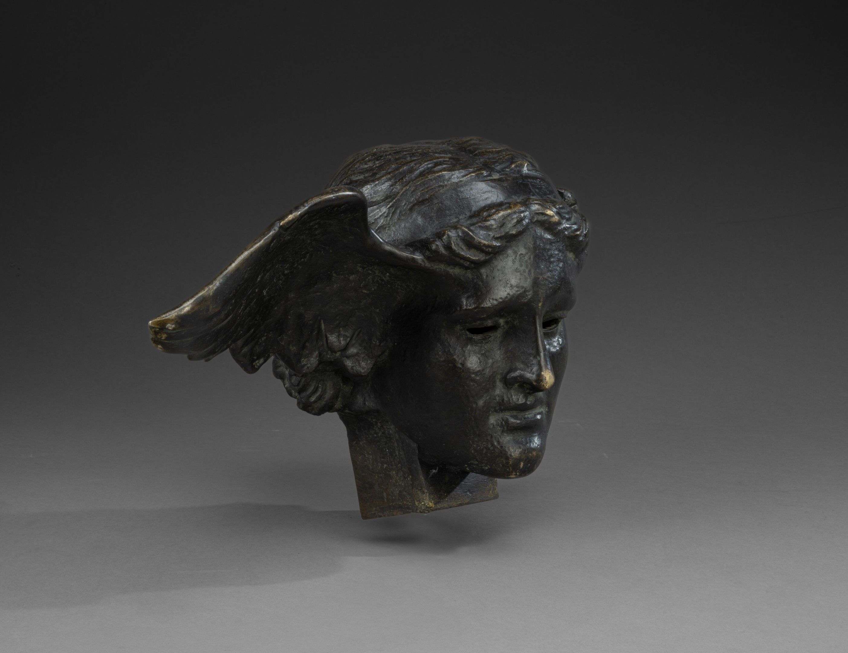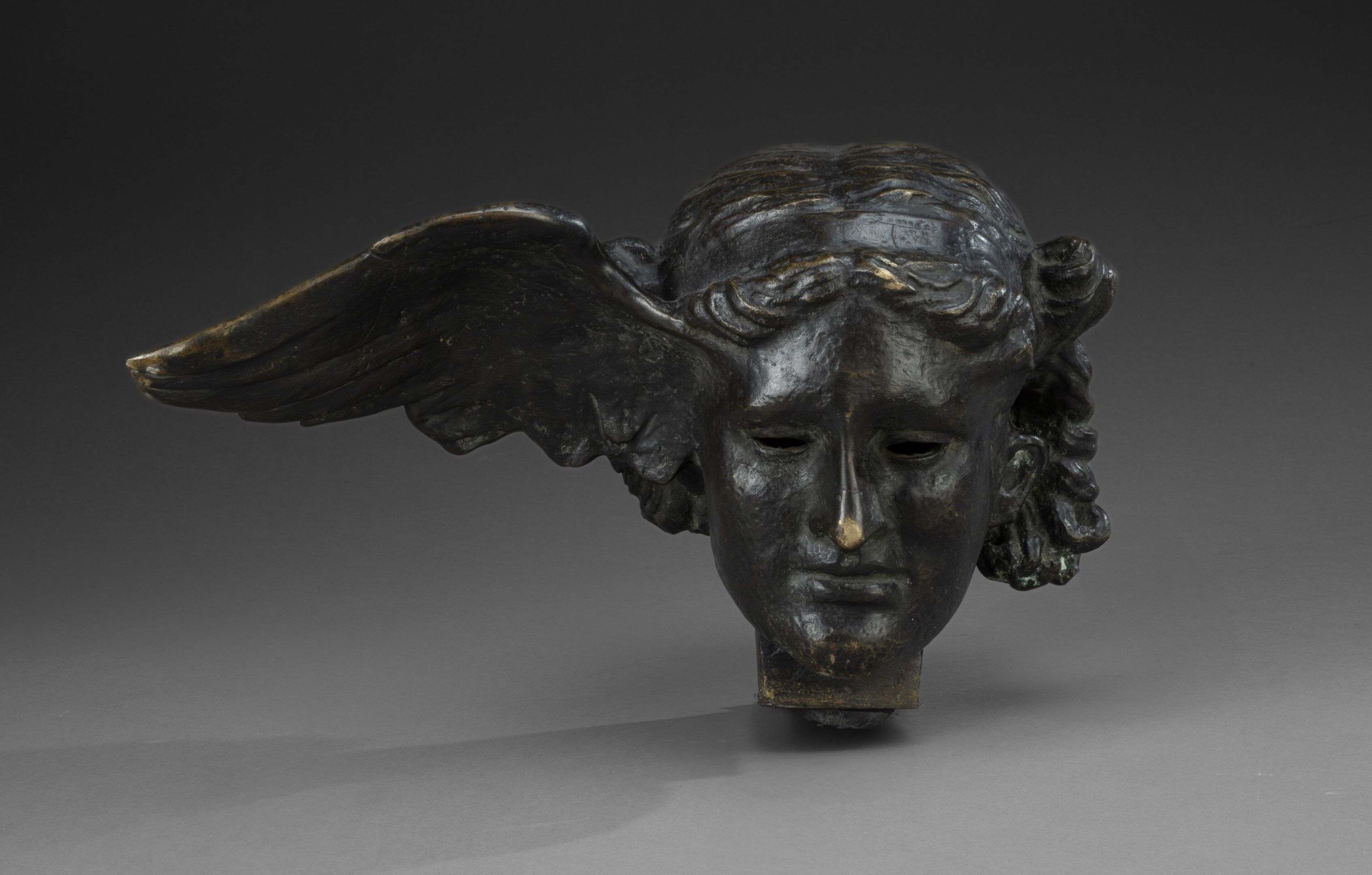 Head of Hypnos in bronze with green patina, wings sprouting from his temples