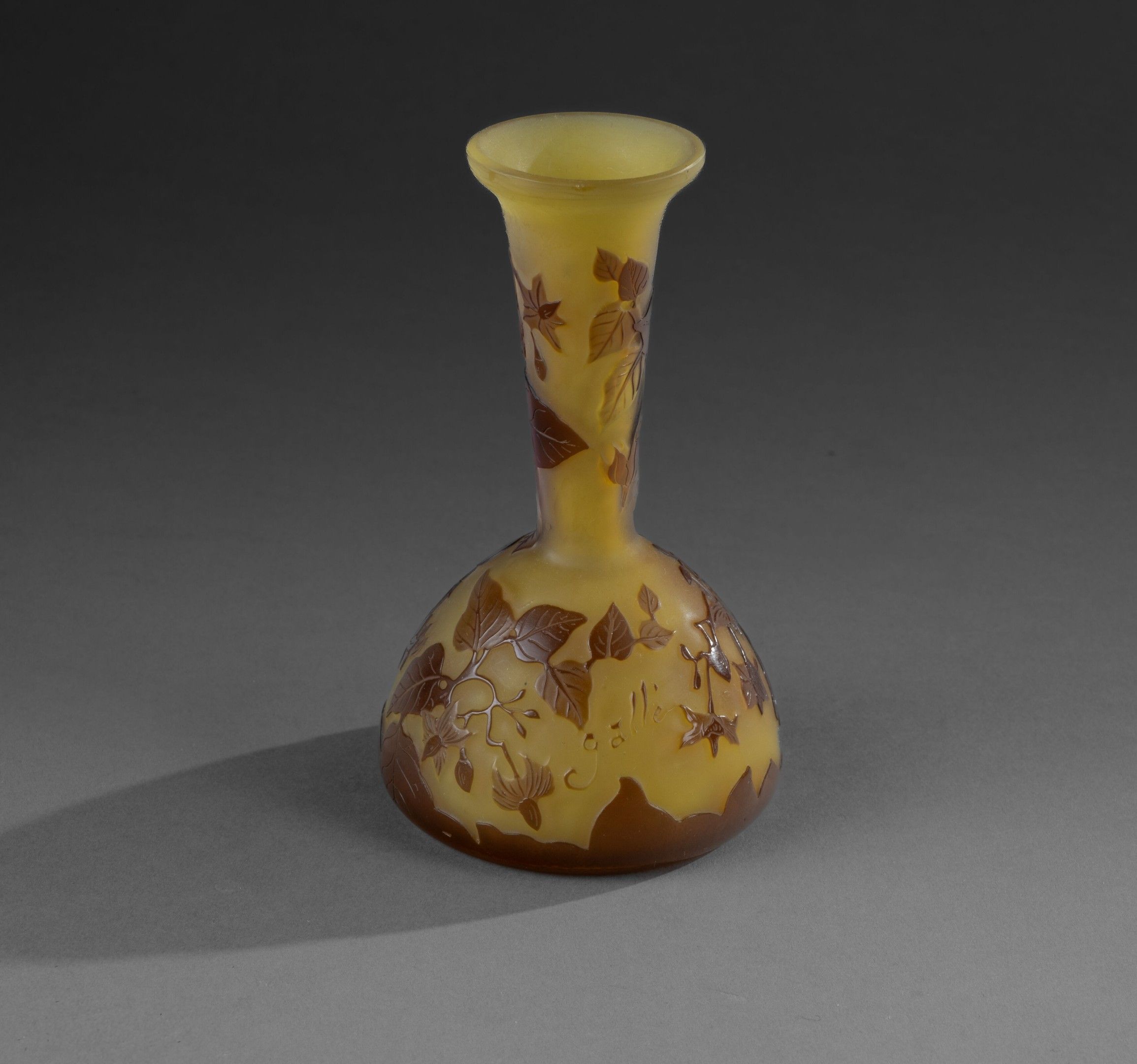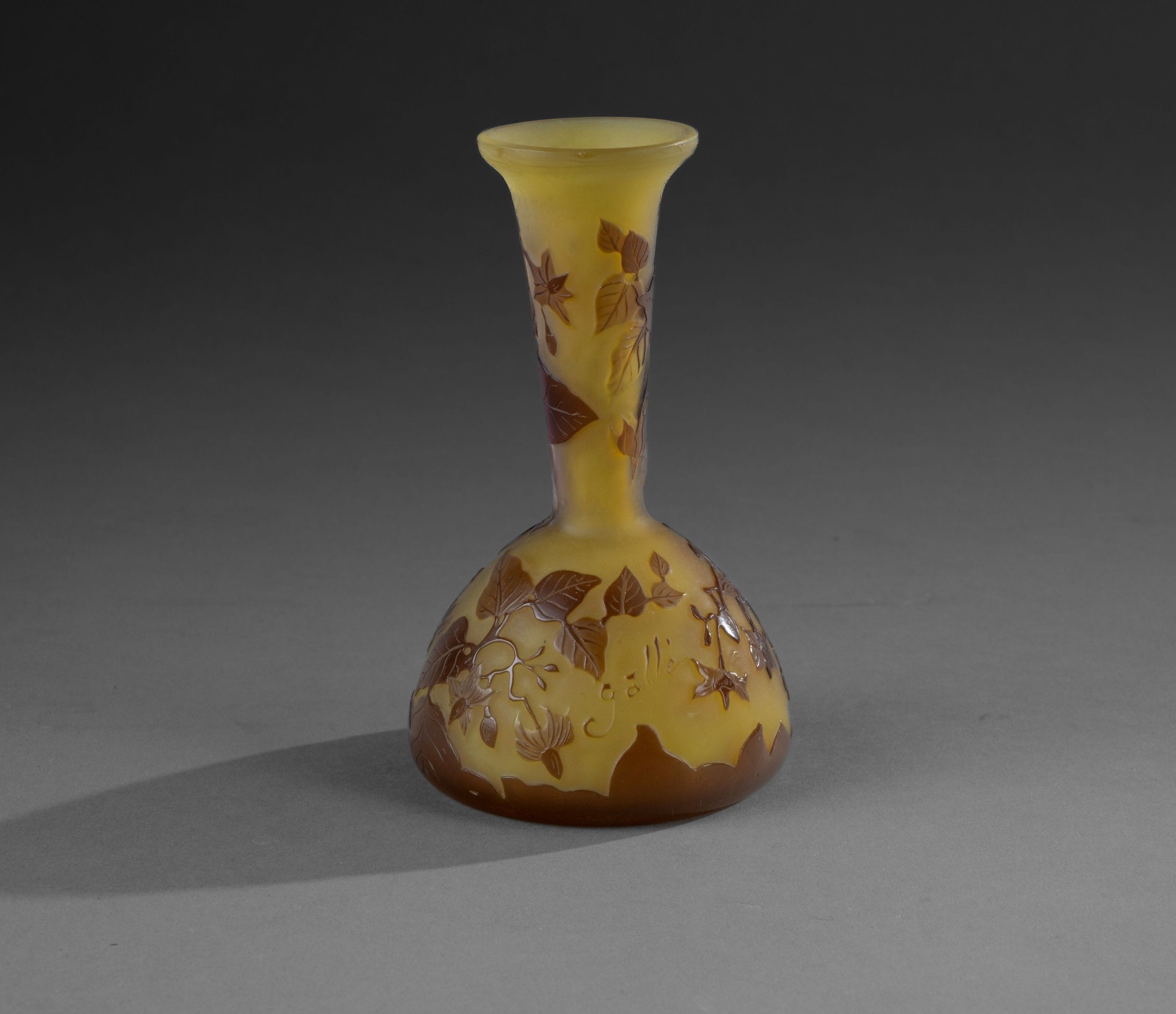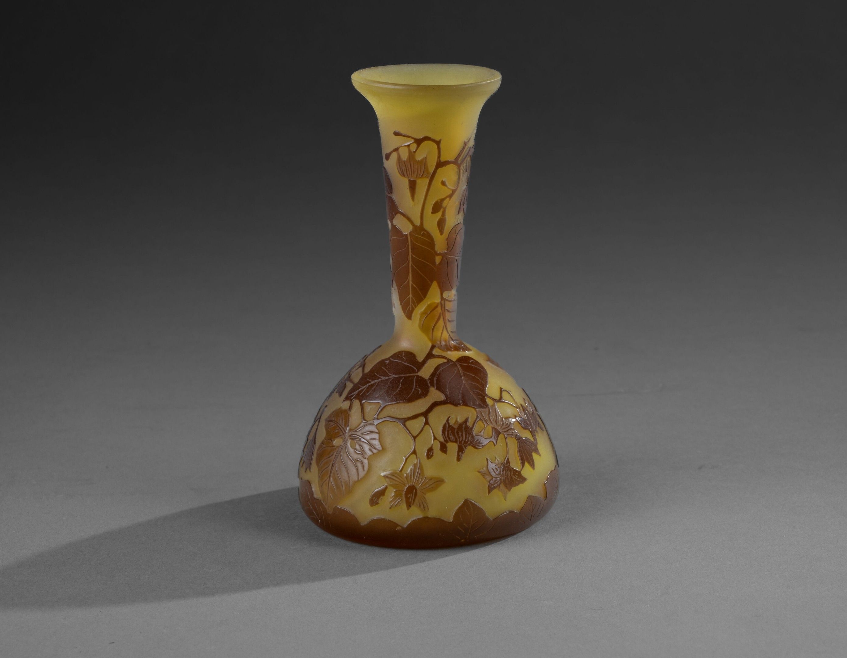 Soliflore with long conical neck on hemispherical base and open neck. Brown lined glass on yellow ground. Décor of flowering branches etched in cameo, signed