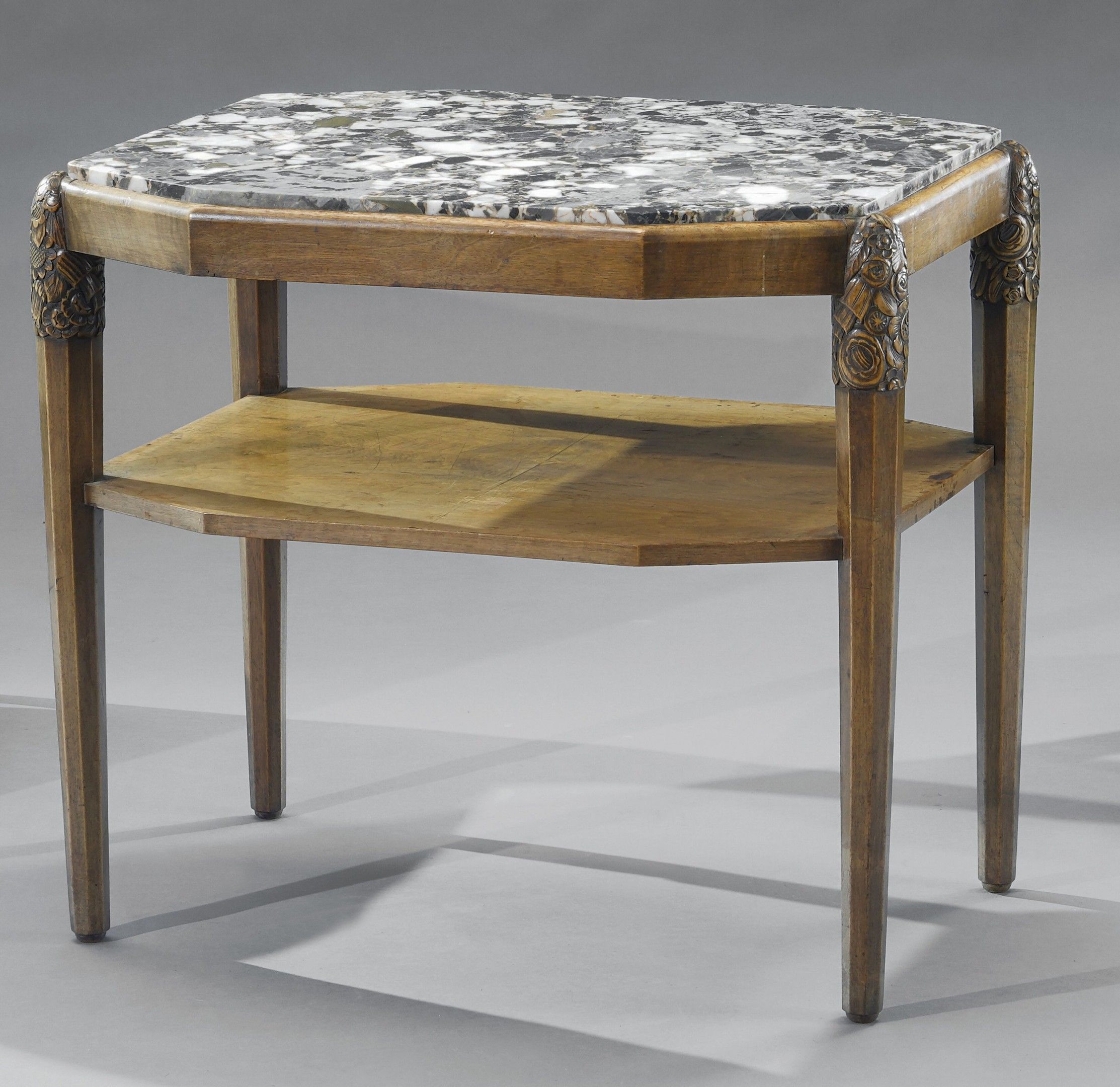 Carved wooden table with two octagonal tops, the upper one in marble slab. The corner legs are carved with a frieze of flowers (cracks and minor restorations).