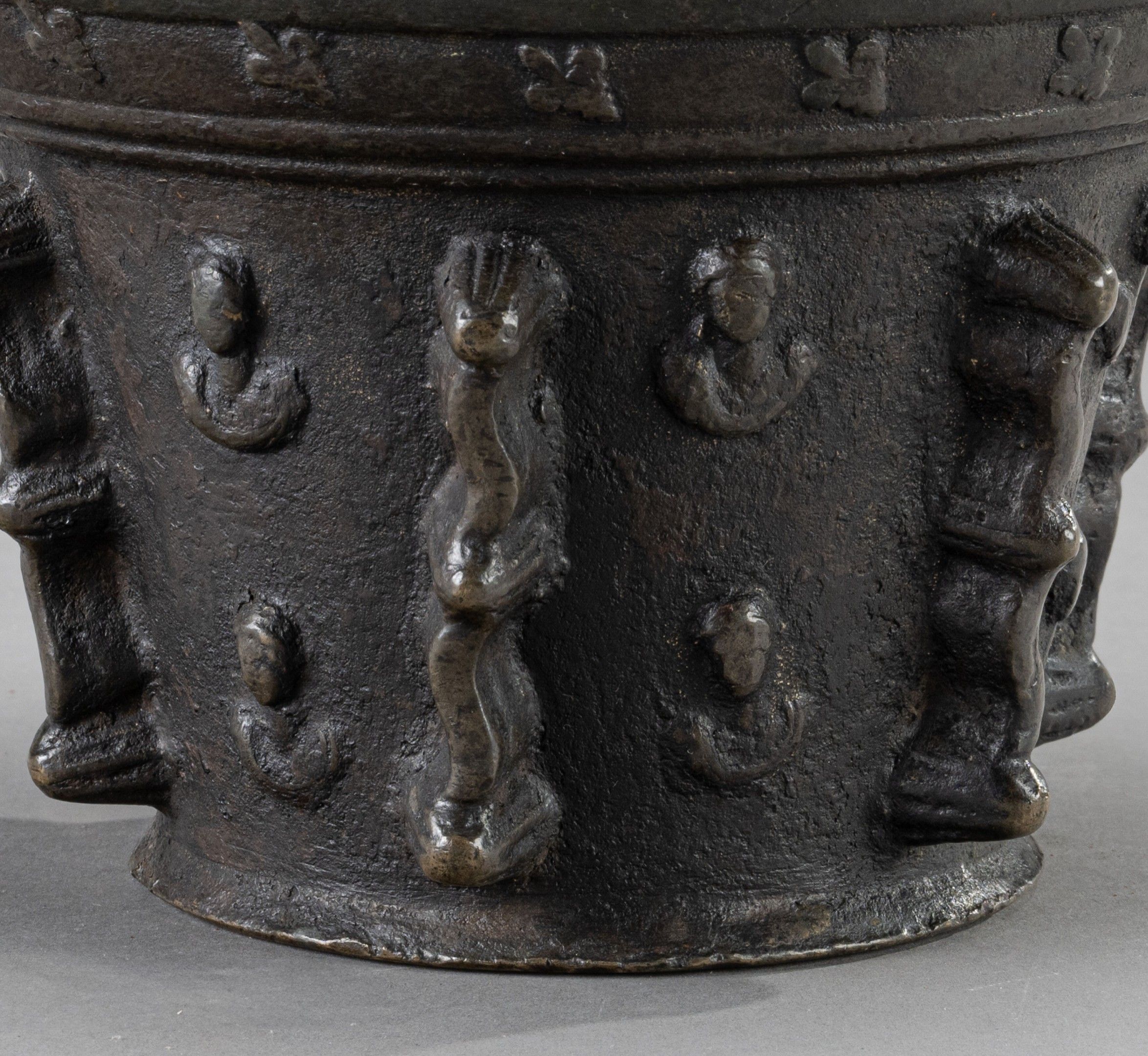 Bronze mortar with intercalary busts and fleurs-de-lys under the neck.
