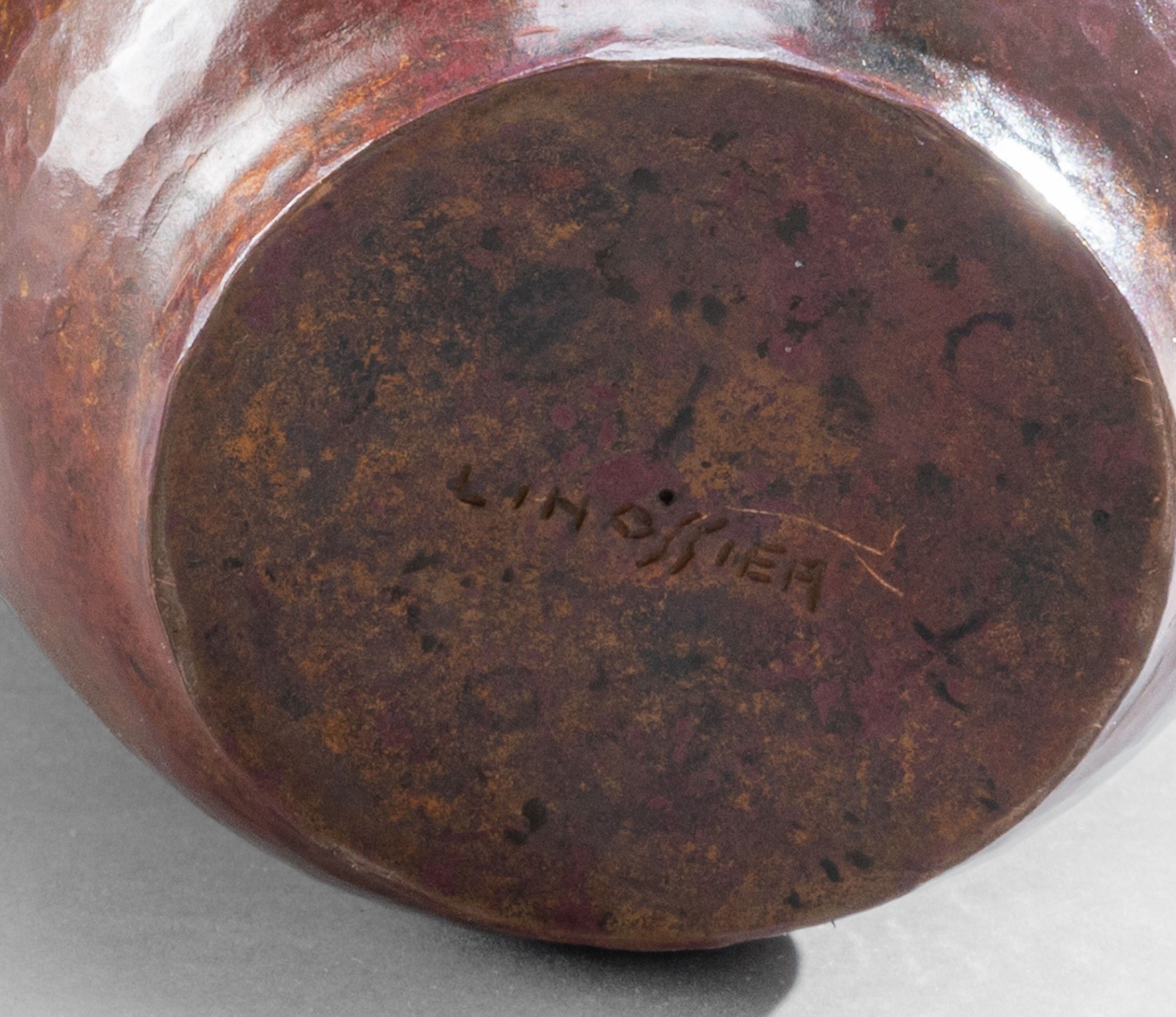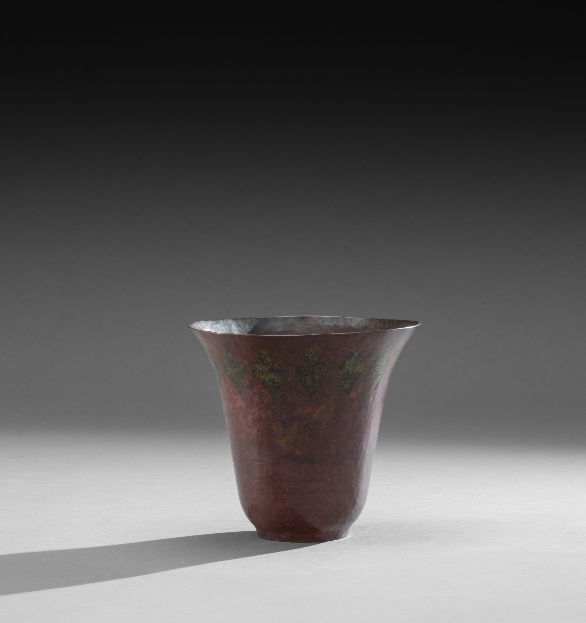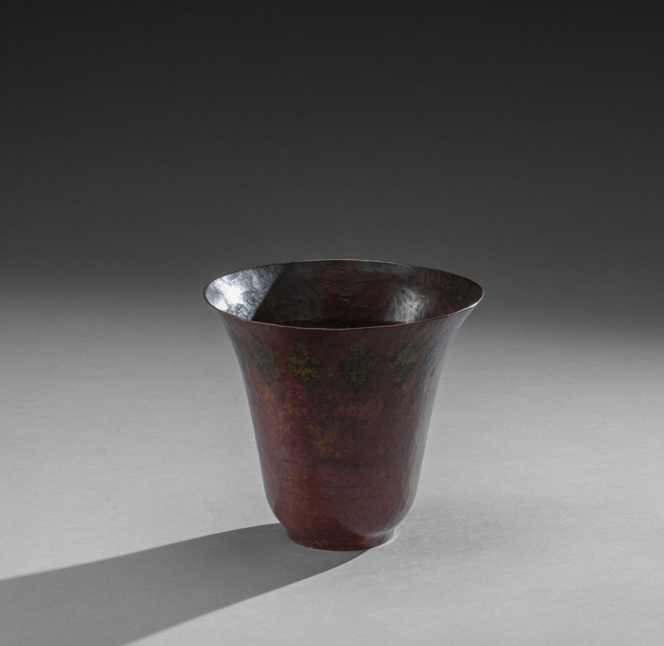 Conical copperware vase on a small ring heel. Decorated in brass with a frieze of lozenges and small dots at the top of the neck on a patinated orange-red background (a small dent near the heel), signed on the reverse.