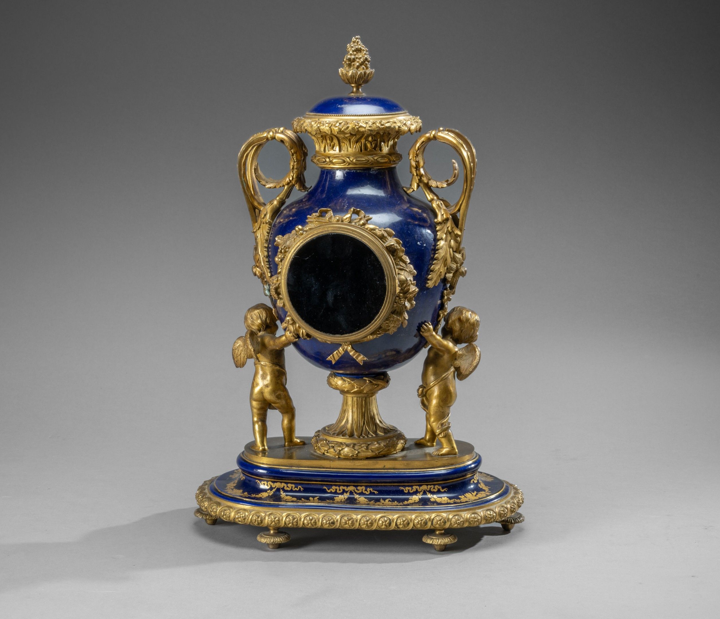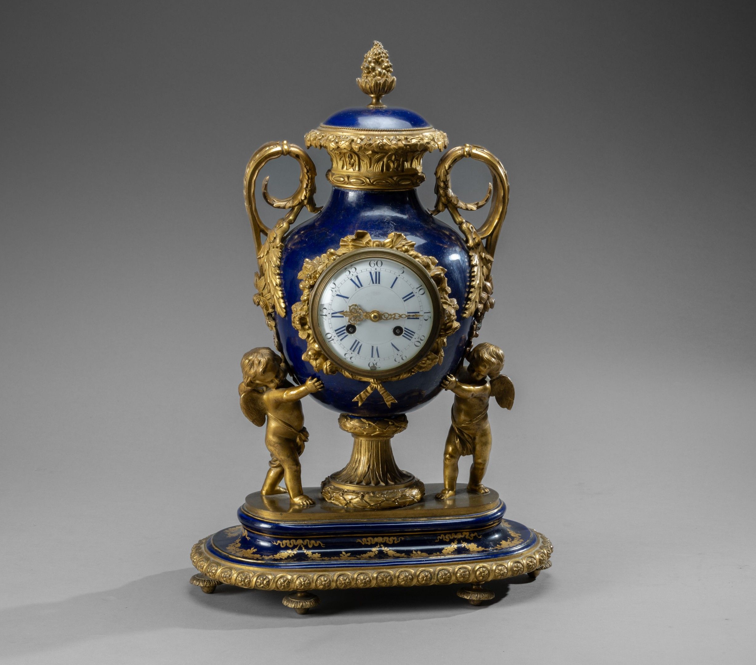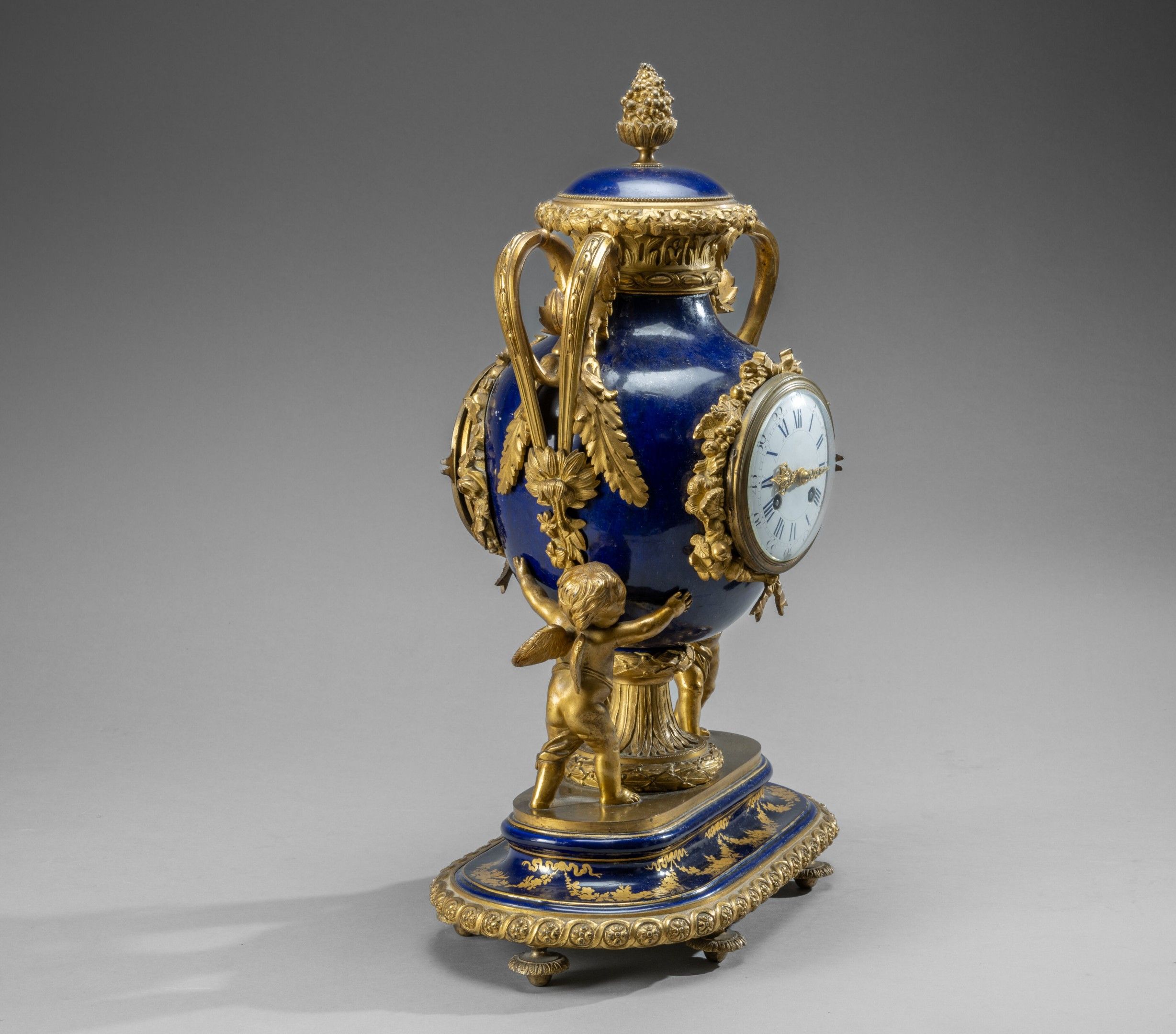 Spectacular blue porcelain clock, the movement contained in a baluster vase supported by two loves. Extensive ormolu decoration: leafy handles, pedestal. The oval base is also in blue porcelain, decorated with falling garlands and strong mouldings of interlacing flowers on six palmettes feet.