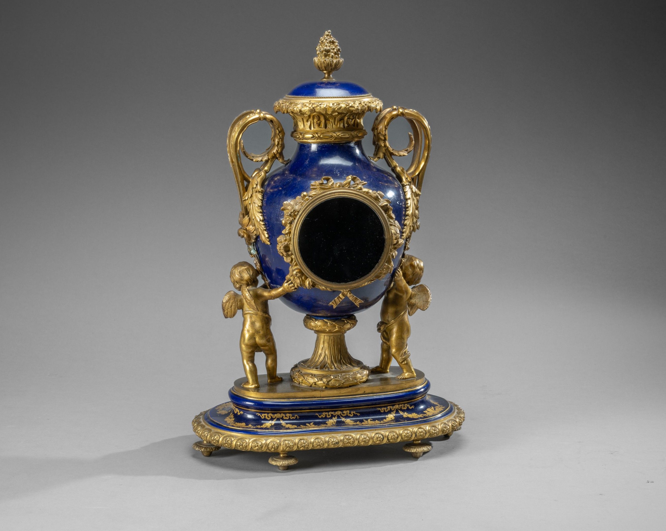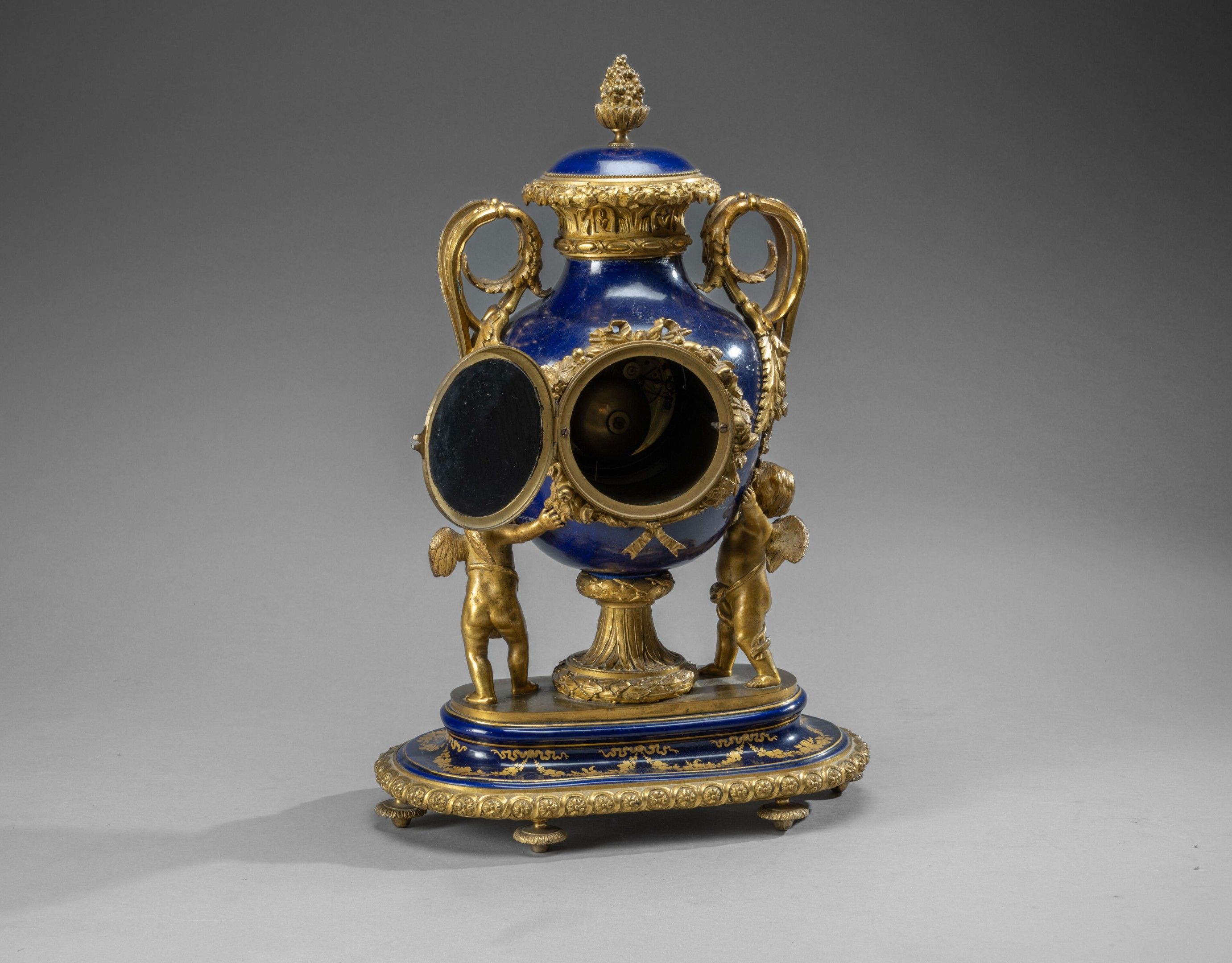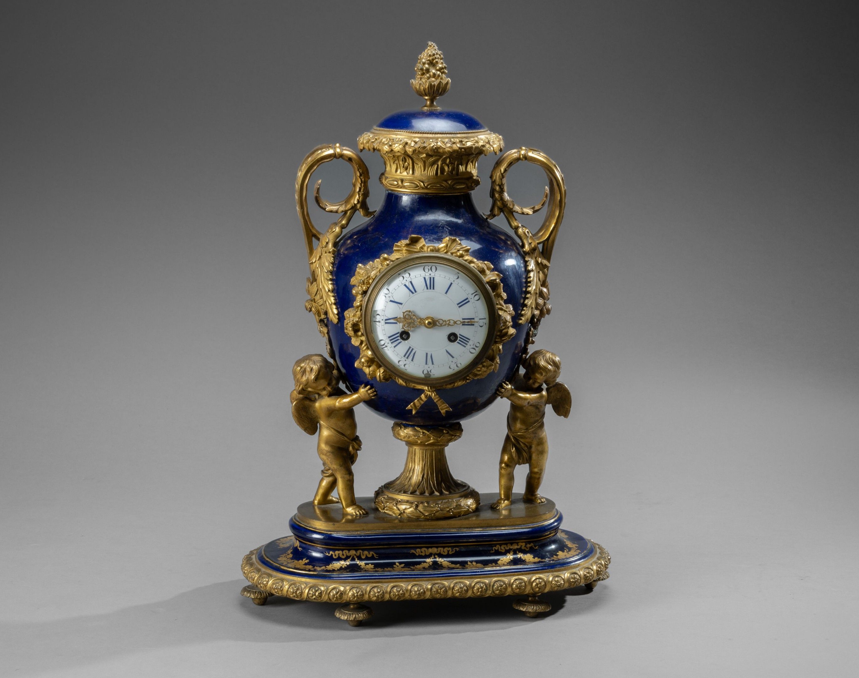 Spectacular blue porcelain clock, the movement contained in a baluster vase supported by two loves. Extensive ormolu decoration: leafy handles, pedestal. The oval base is also in blue porcelain, decorated with falling garlands and strong mouldings of interlacing flowers on six palmettes feet.