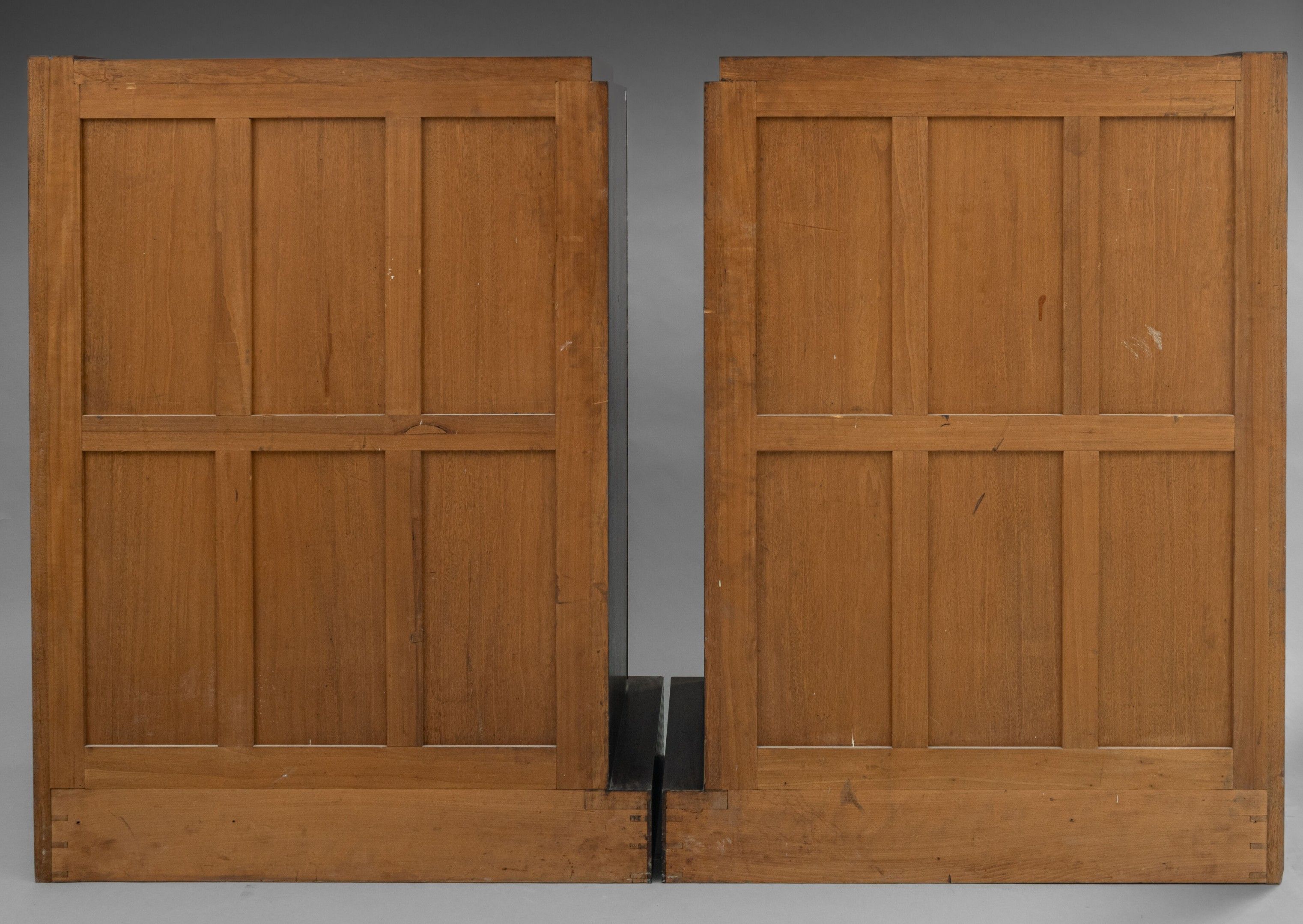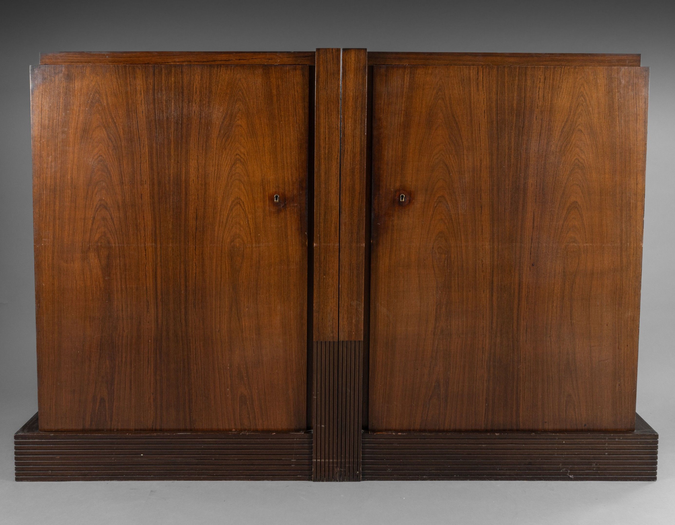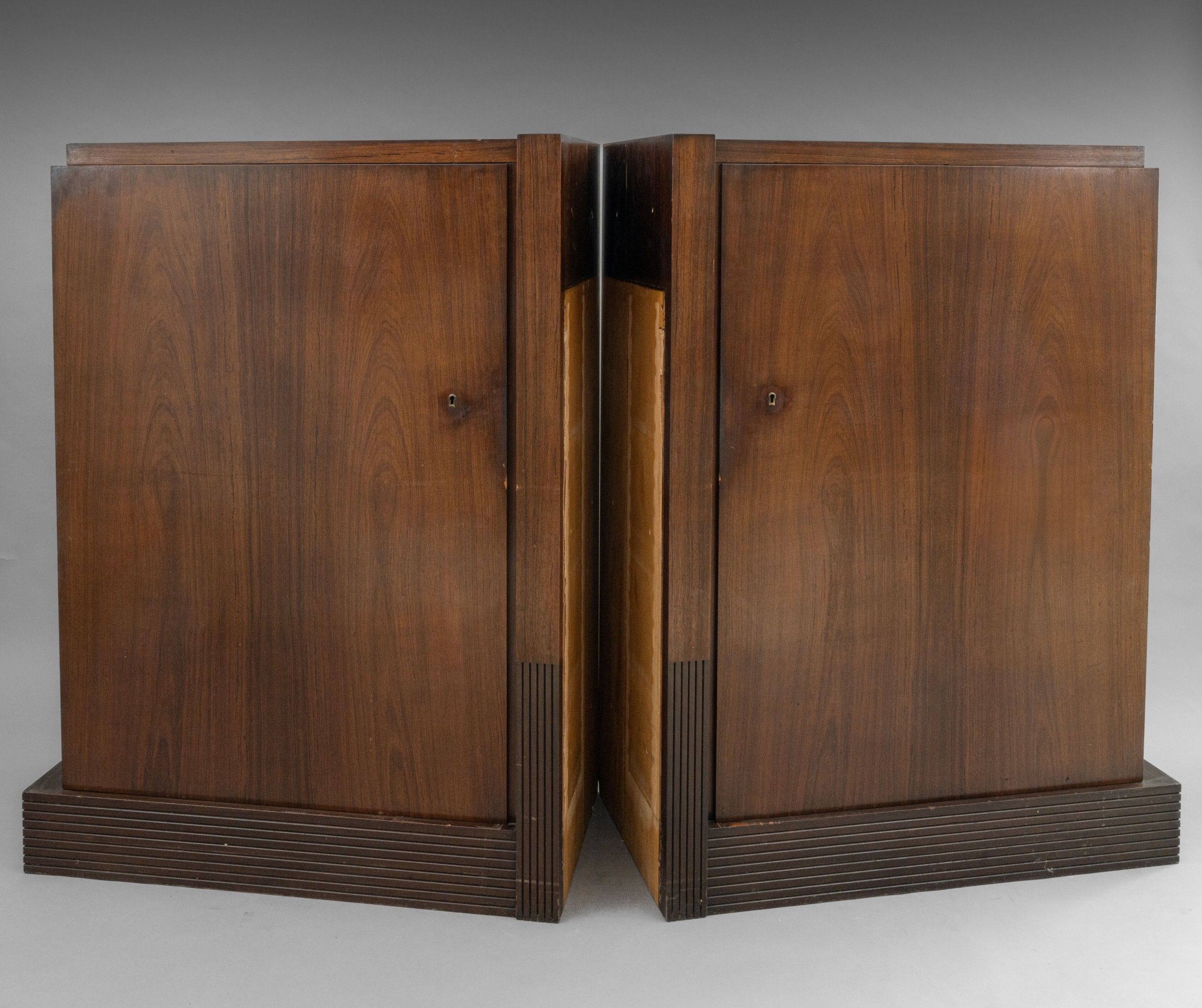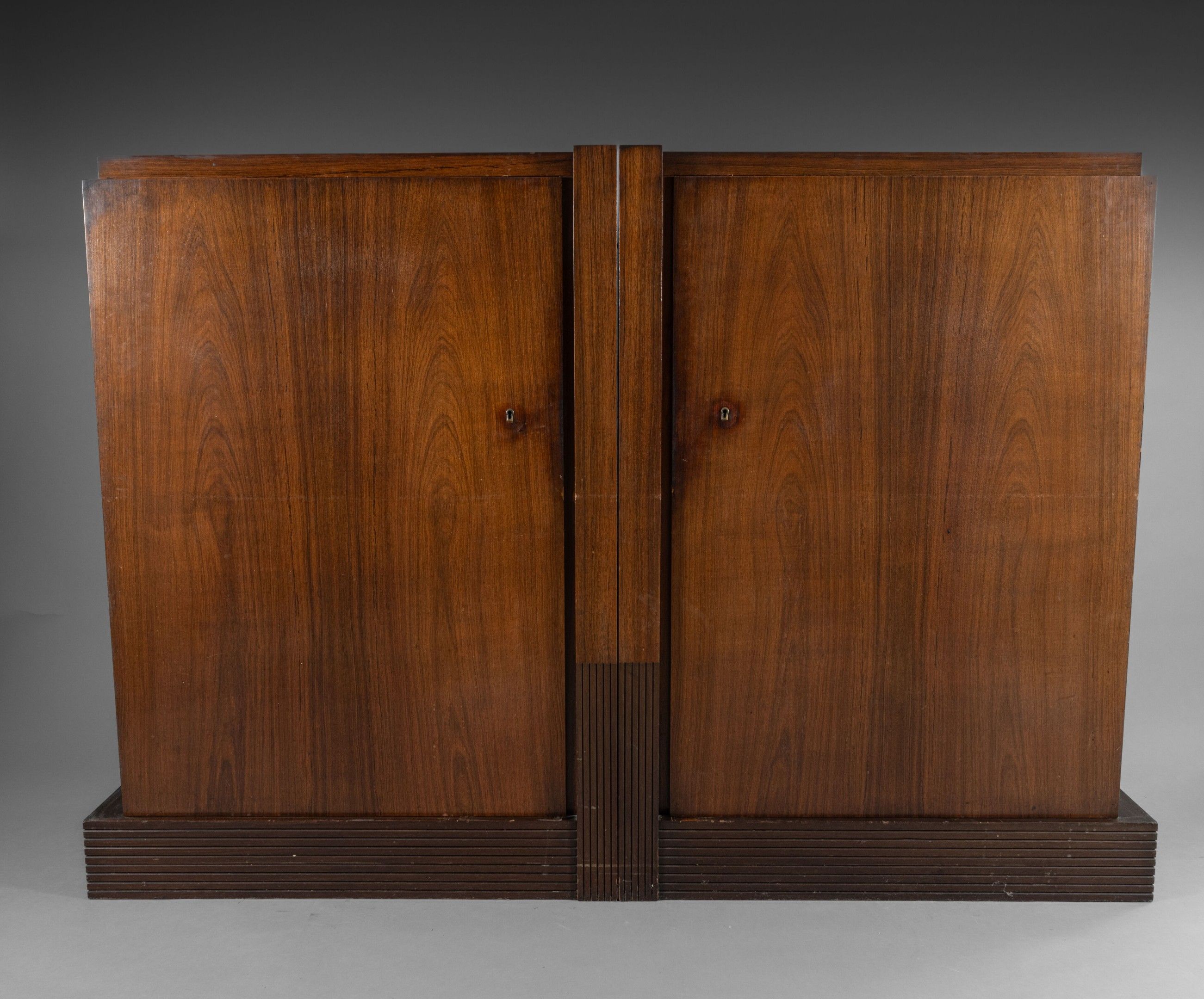 Marcel CHARPENTIER & Victor COURTRAY (in the style of) A large exotic wood and walnut veneered sideboard in two parts with a quadrangular body opening onto a solid door at the front. Full grooved legs. Dimensions of one unit: H. 140 cm - W. 105 cm - D. 53 cm AM