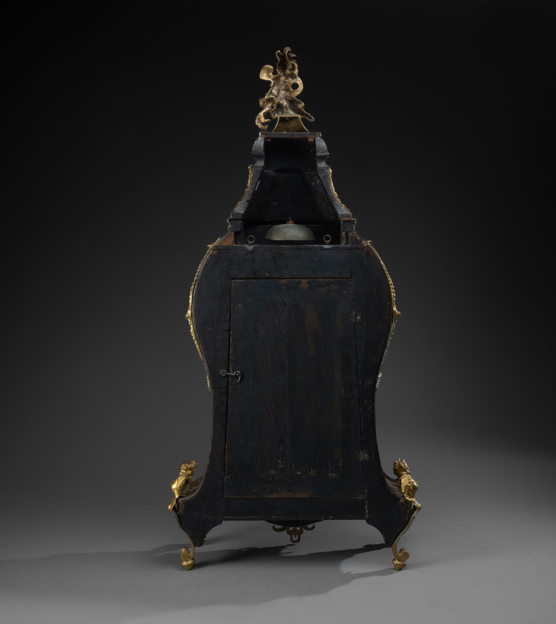 A large Boulle marquetry cartel with stained horns, the dial with twenty-four enamelled cartouches on a gilt bronze background. The frame is surmounted by a figure holding a bird and accompanied by a dog. It stands on four large feet with espagnolette busts. Dial and movement signed Colin de Laglizier, dated 1762 in Paris.