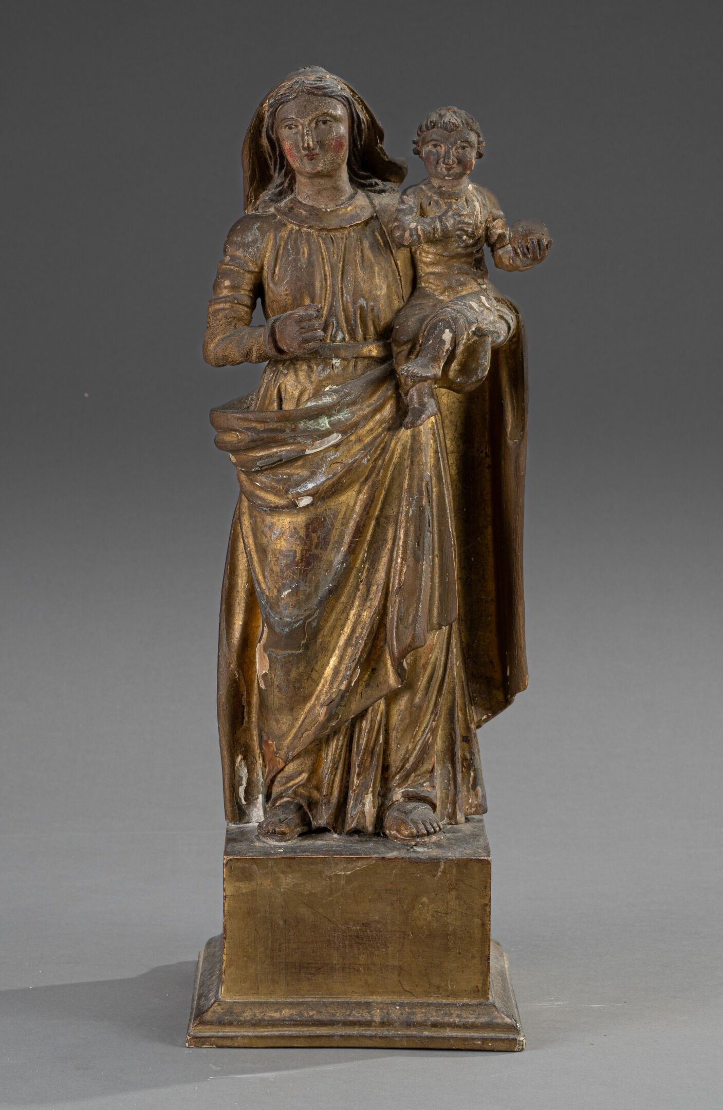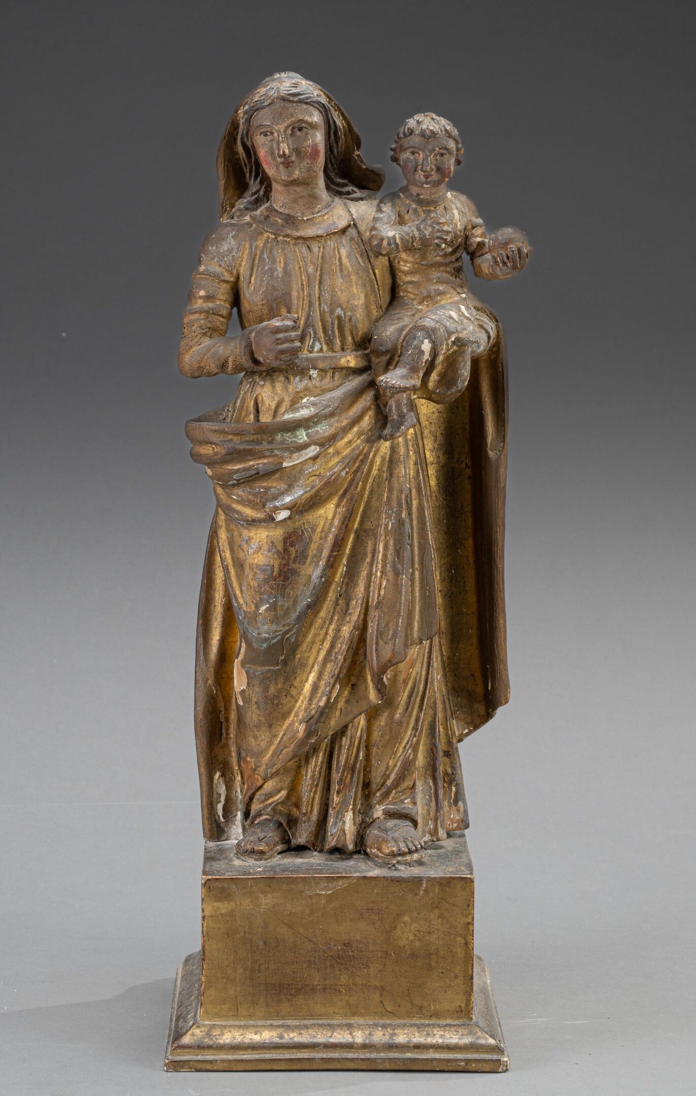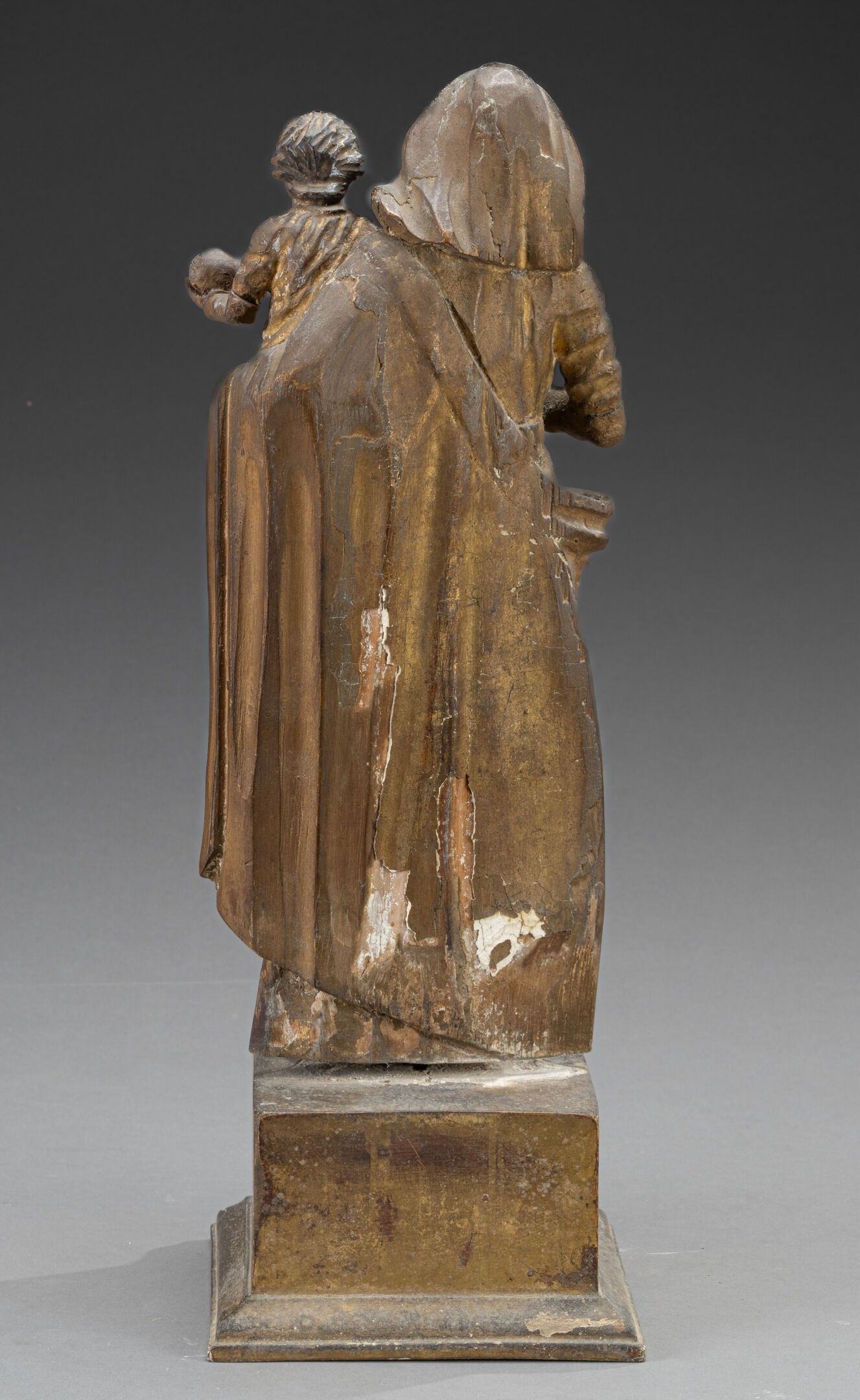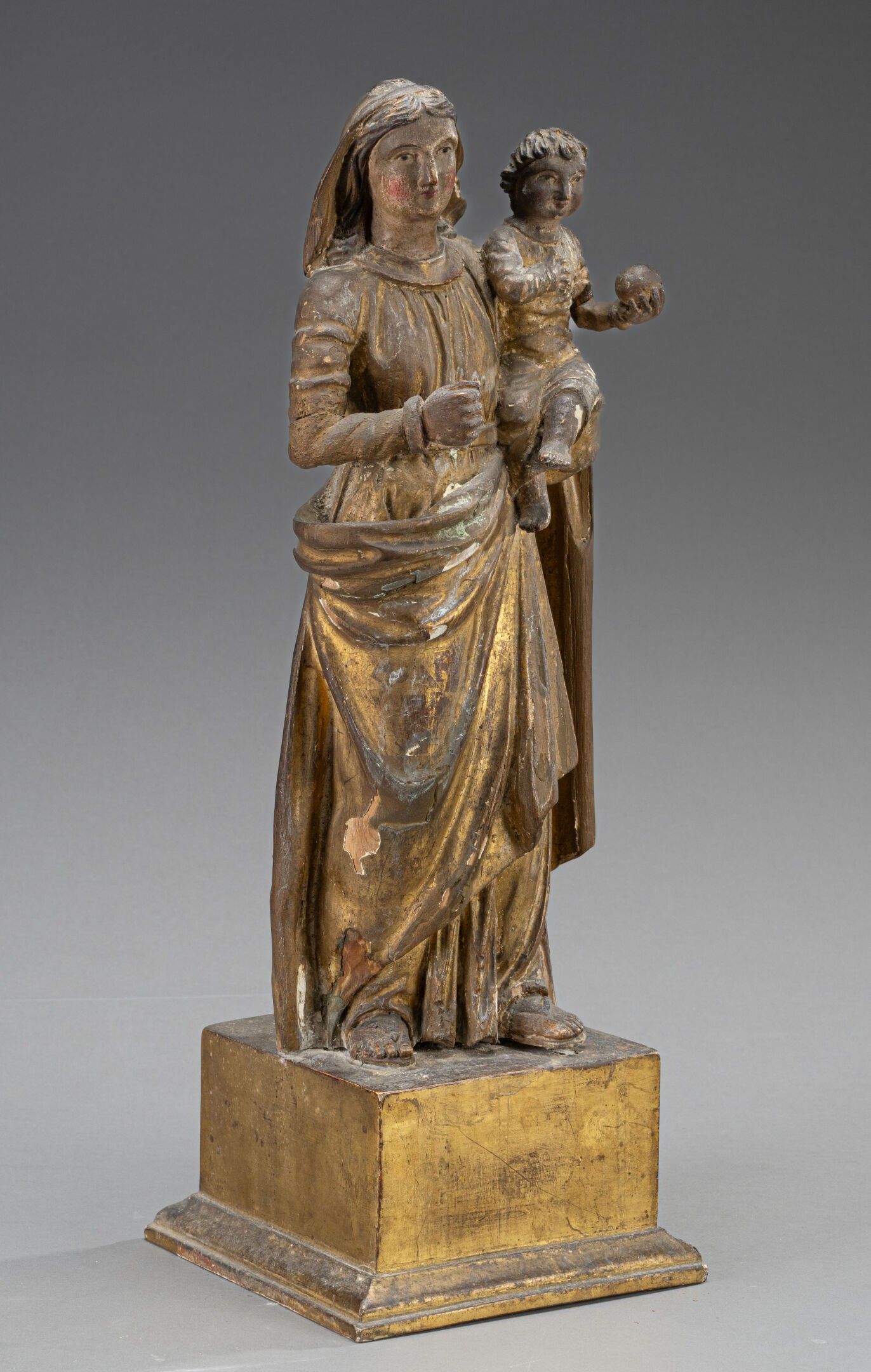 Statuette in carved wood, gilded, the flesh in its natural state, on a pedestal with a square base
