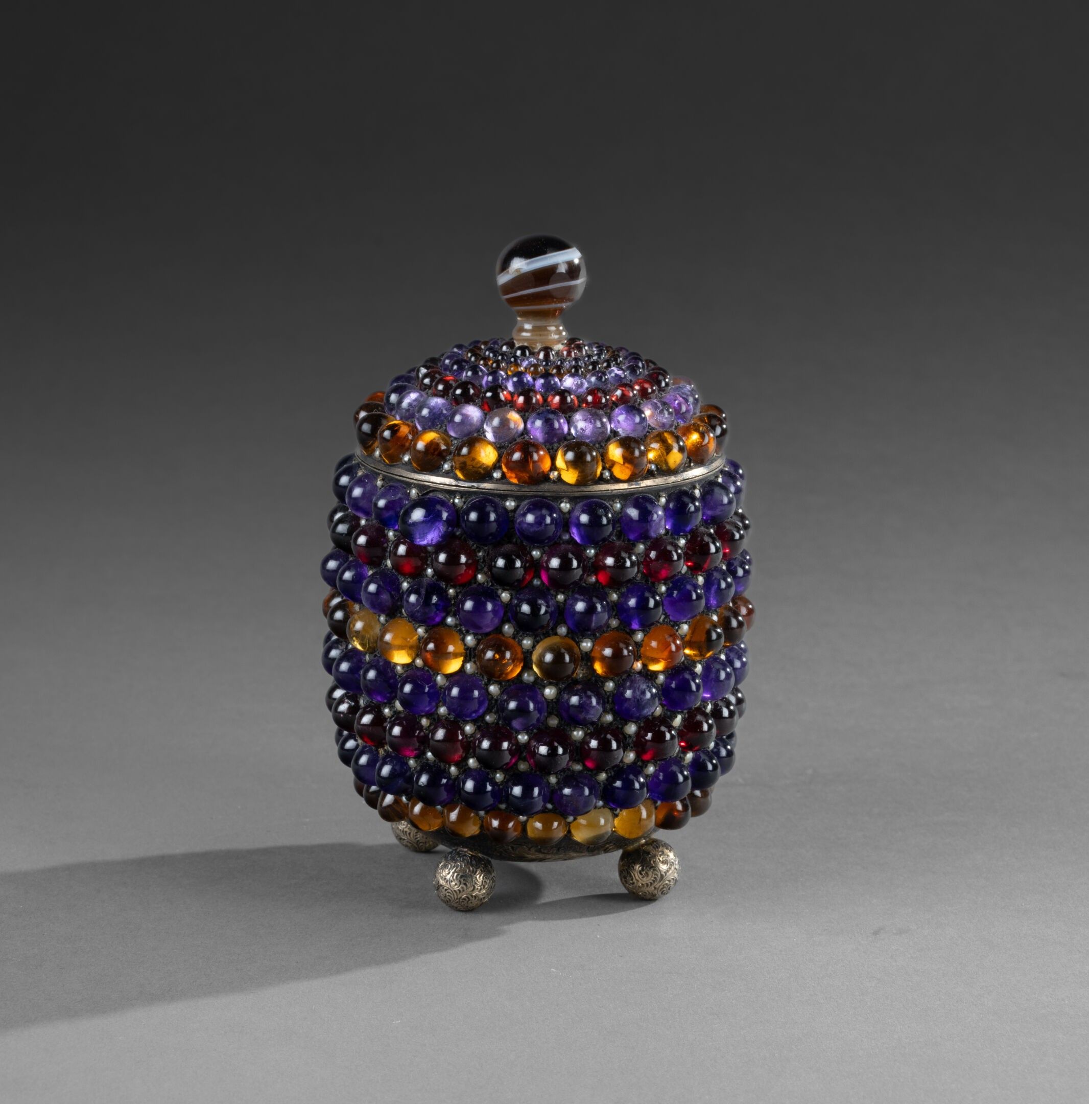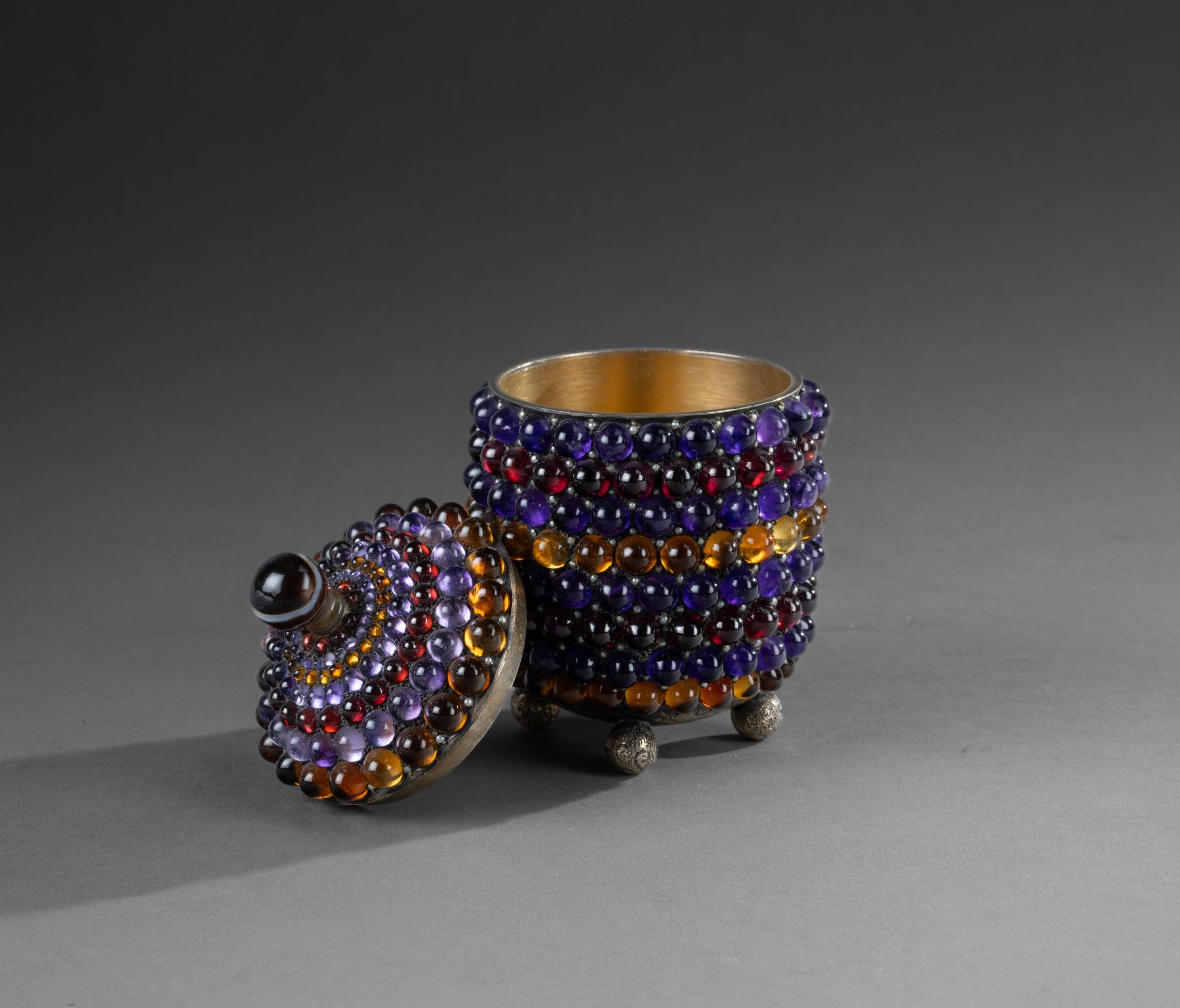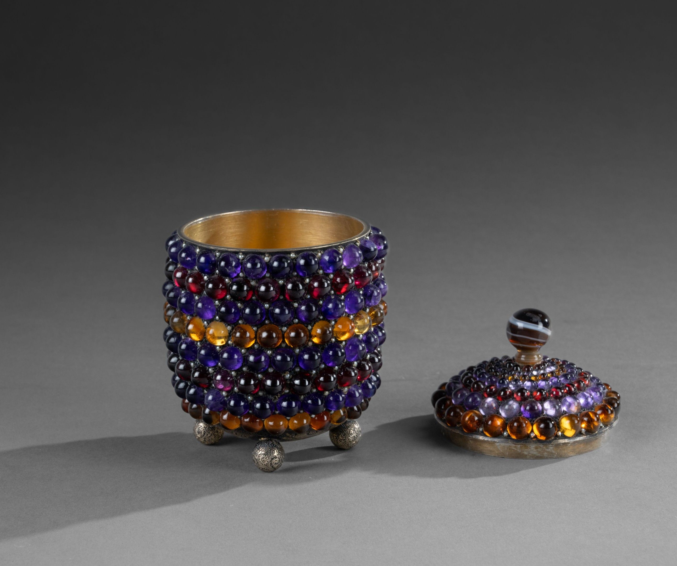 A curious vermeil egg-shaped covered box (800‰) standing on four ball feet, decorated entirely set and inlaid with cabochons of hard stones including amethysts, garnets, citrines and demi-pearls, the base and feet chased with foliate scrolls, the lid grip formed by a ribboned agate sphere Probably Russia, 20th century No apparent hallmark H. 10 cm - D. 6 cm - Weight 258.30g MC Provenance: Daguerre sale, 30 November 2021, lot 139.