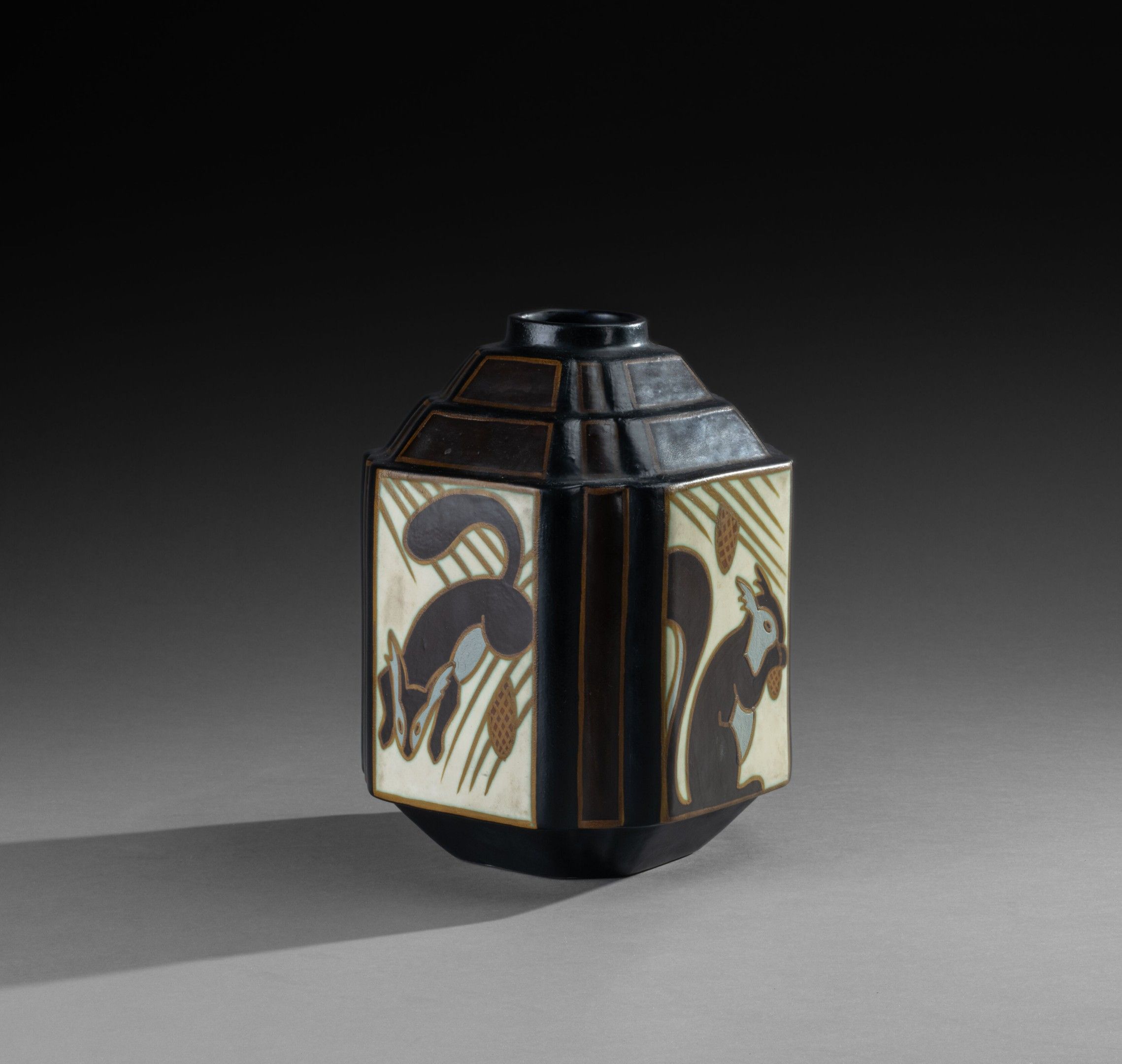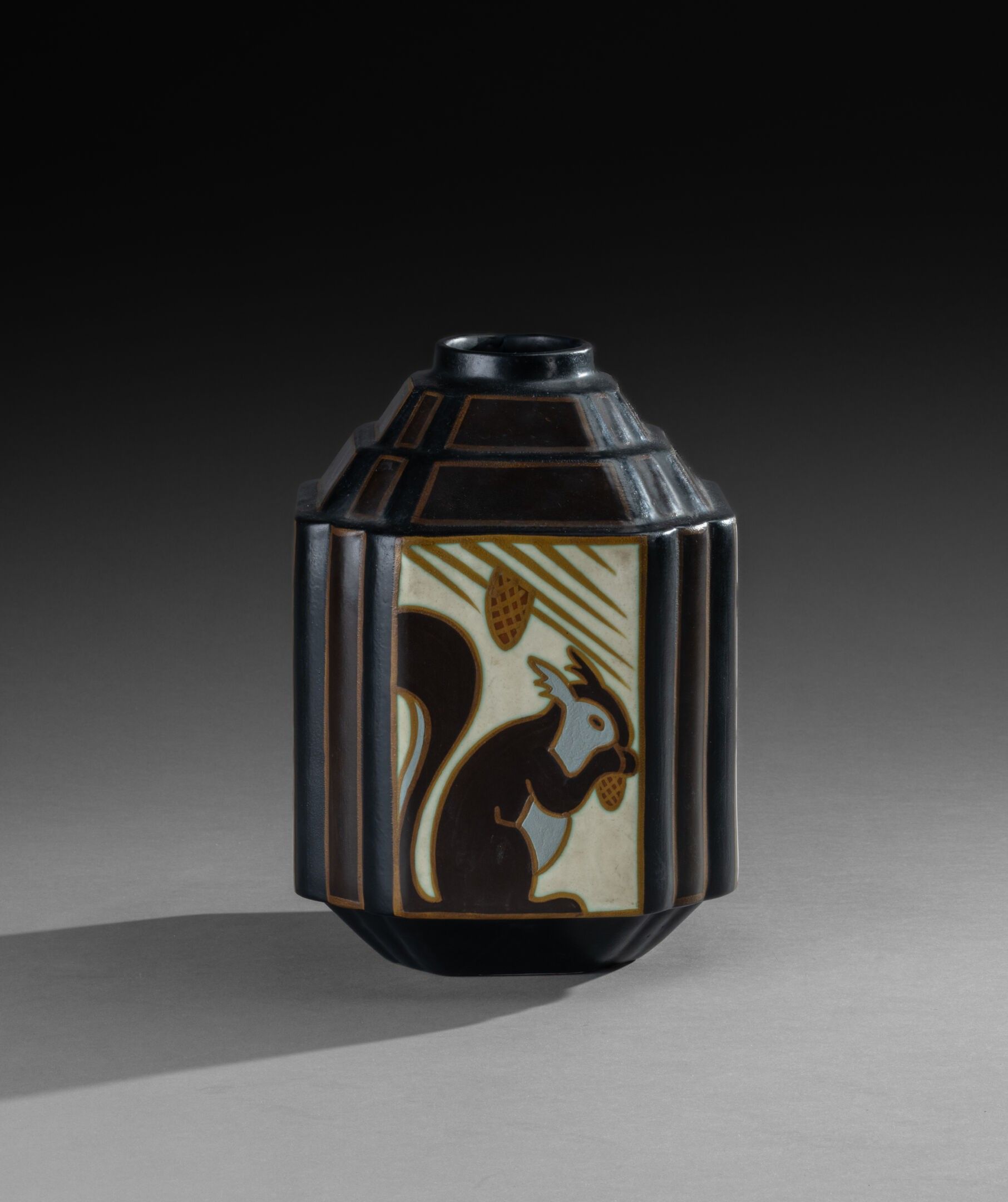 Ceramic vase with quadrangular shouldered body and stepped neck. Decorated with squirrels, acorns, needles and stylised pine cones in medallions in polychrome enamels on a beige, brown and black background. Signed on the reverse and marked D1349 (for the decoration).