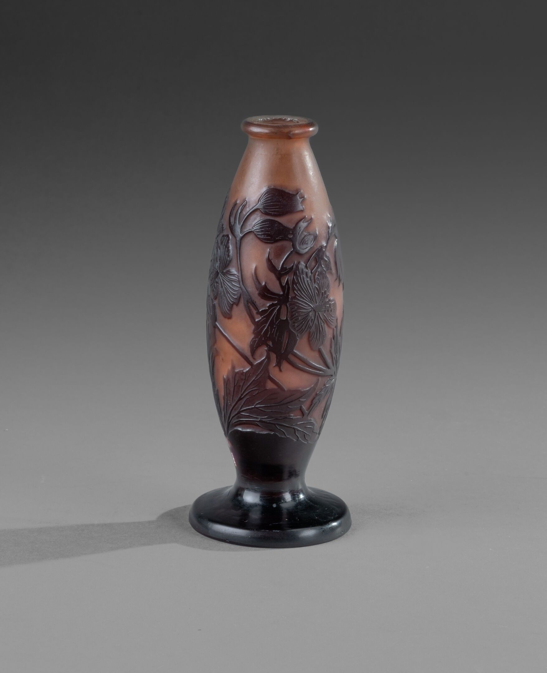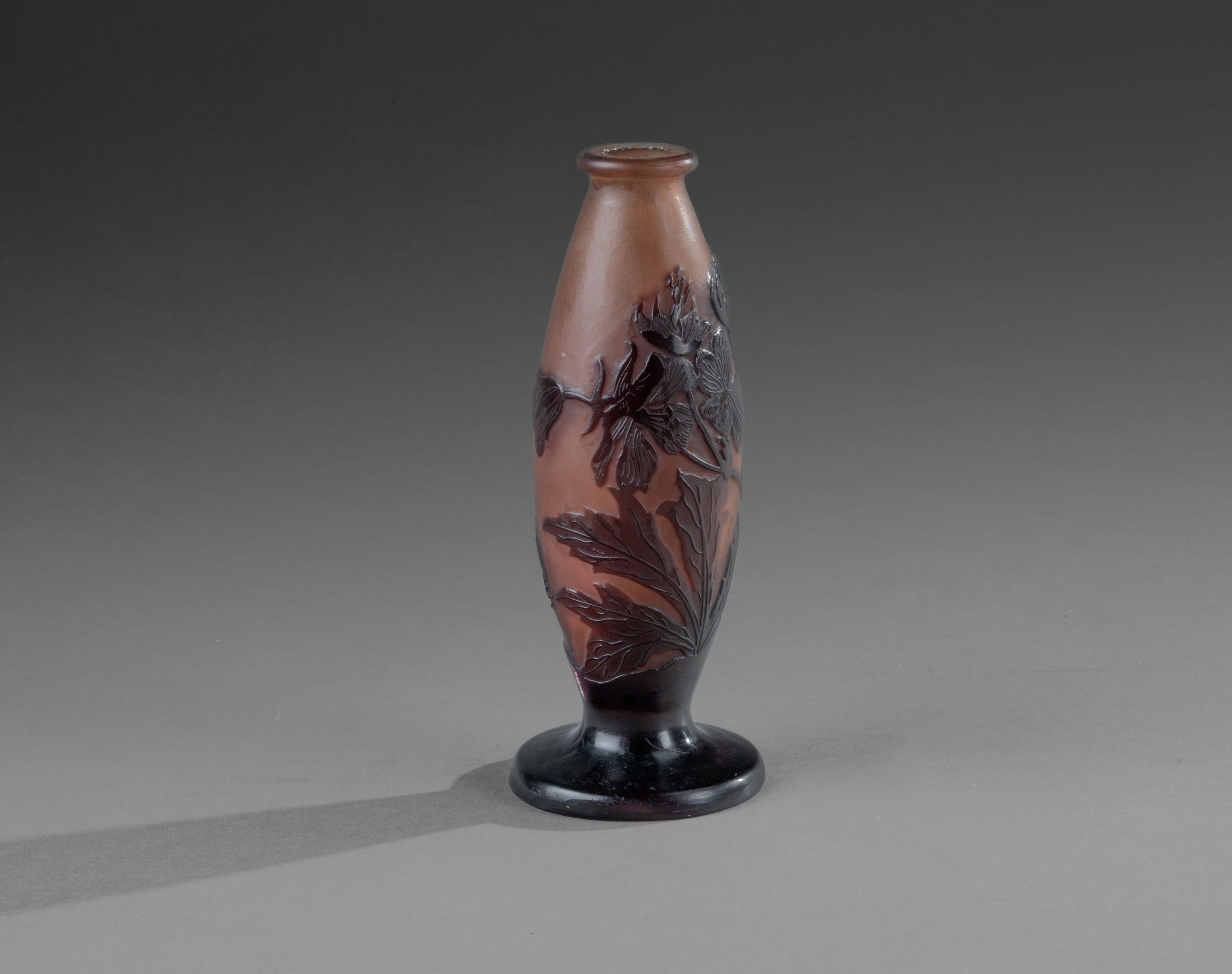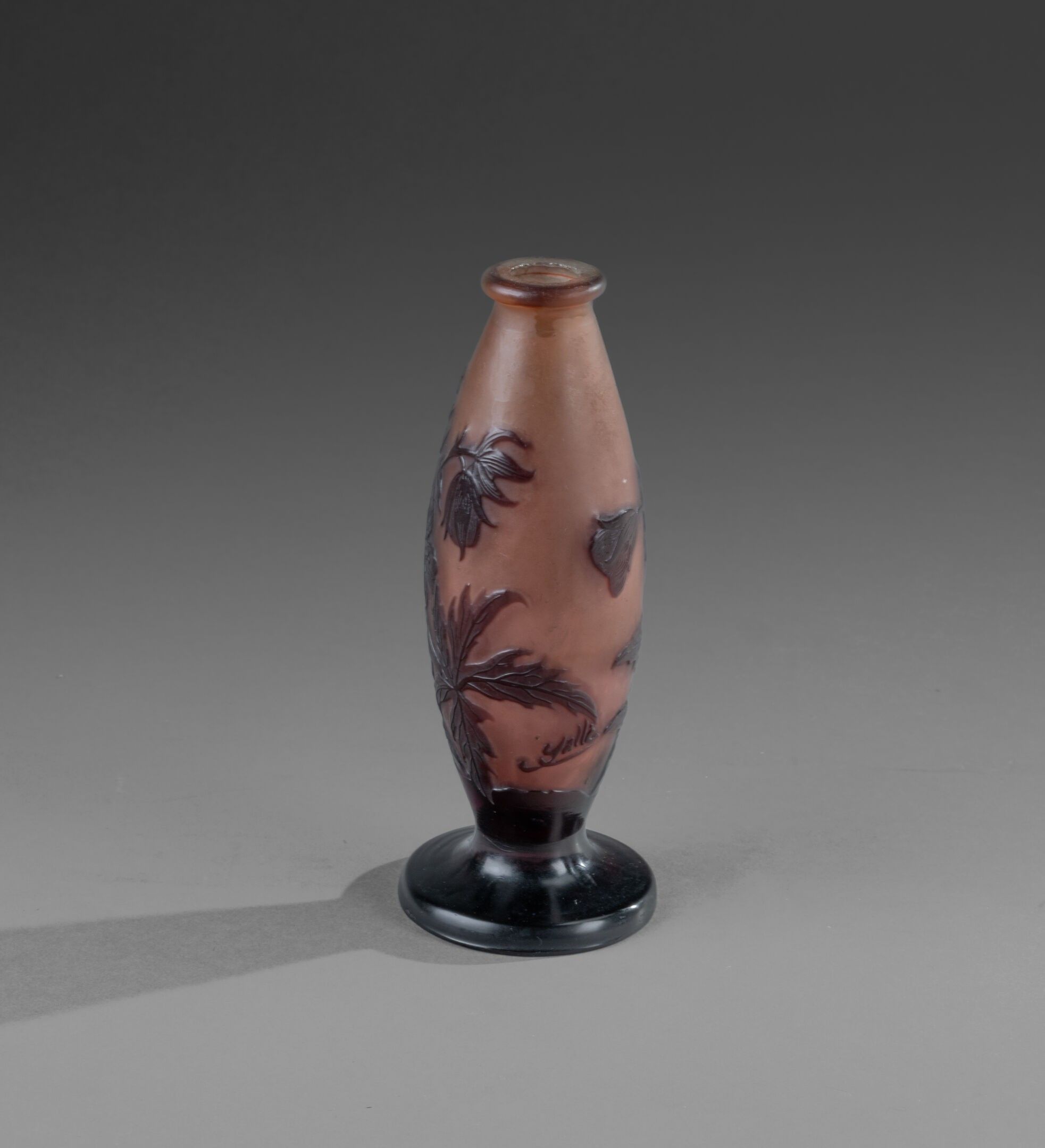 Ovoid soliflore on circular pedestal with hemmed neck. Purple lined glass on a pink ground. Décor of millepertuis engraved in cameo with acid (tiny chips on the neck), signed.