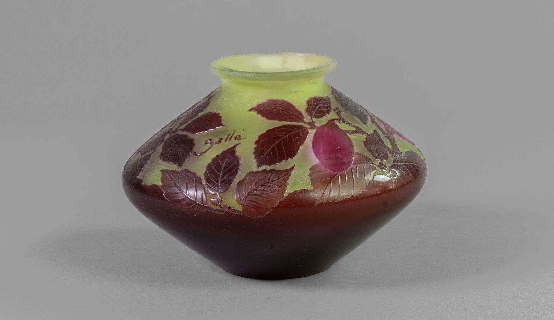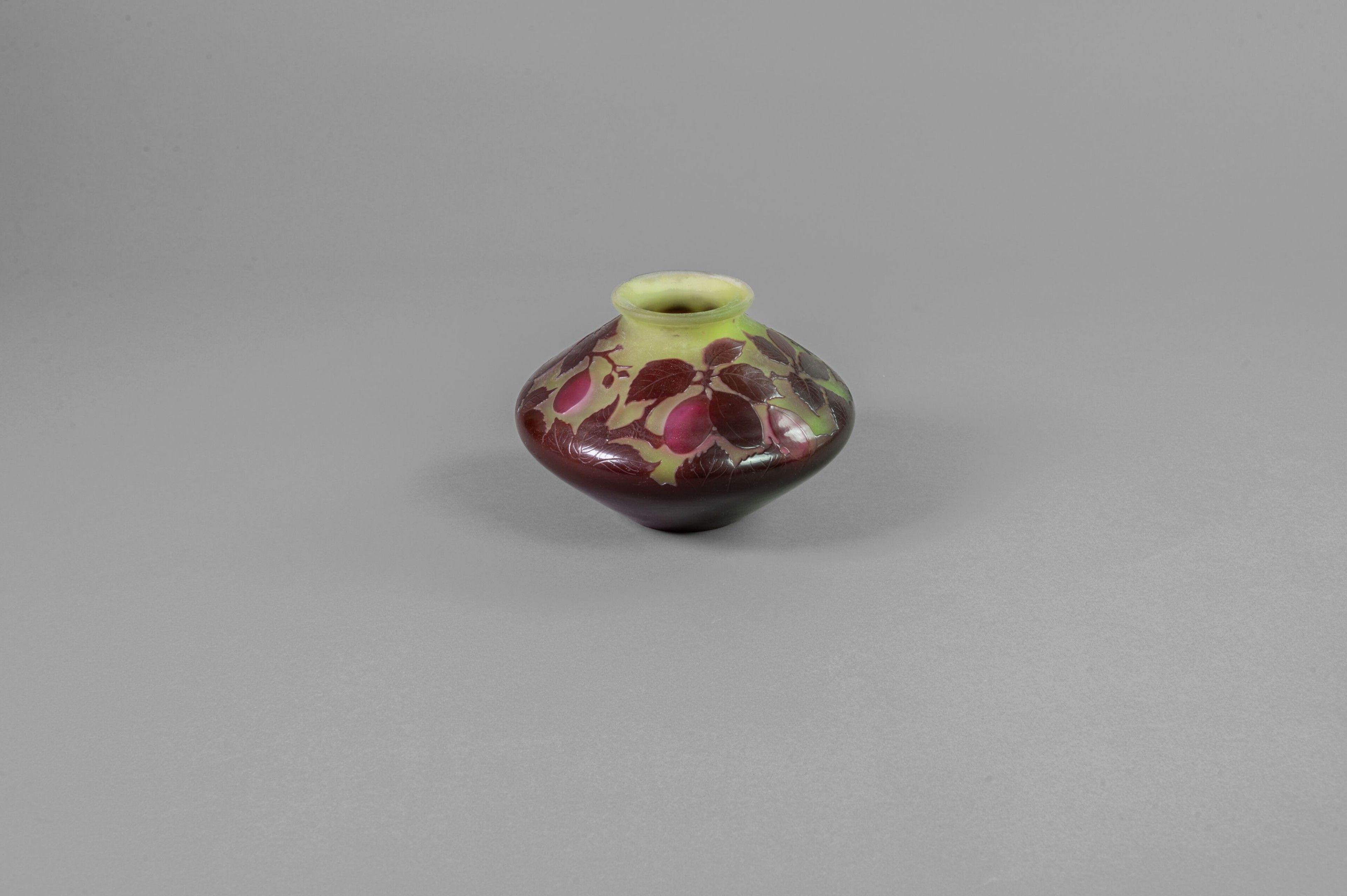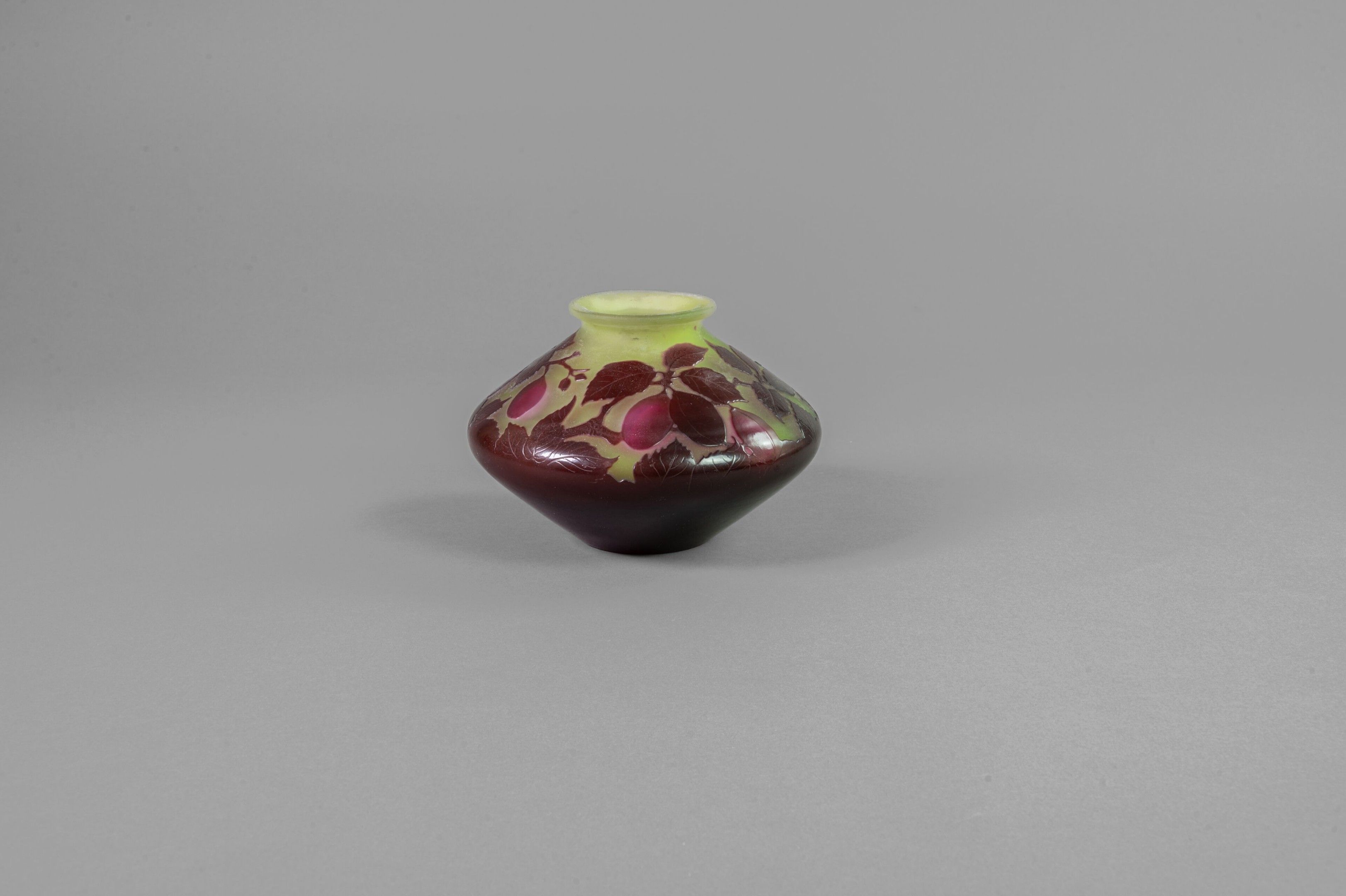 Vase with flattened body and conical neck. Proof in multi-layered violet and red glass on a yellow ground. Acid-etched cameo of plum branches, signed.