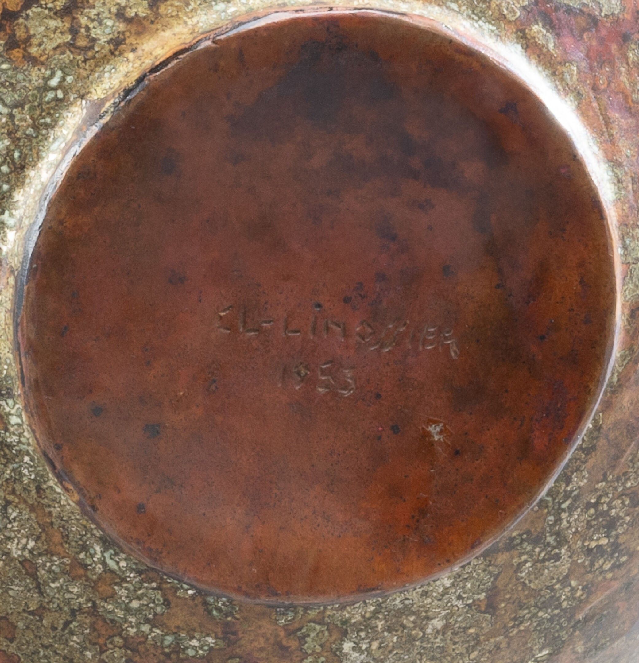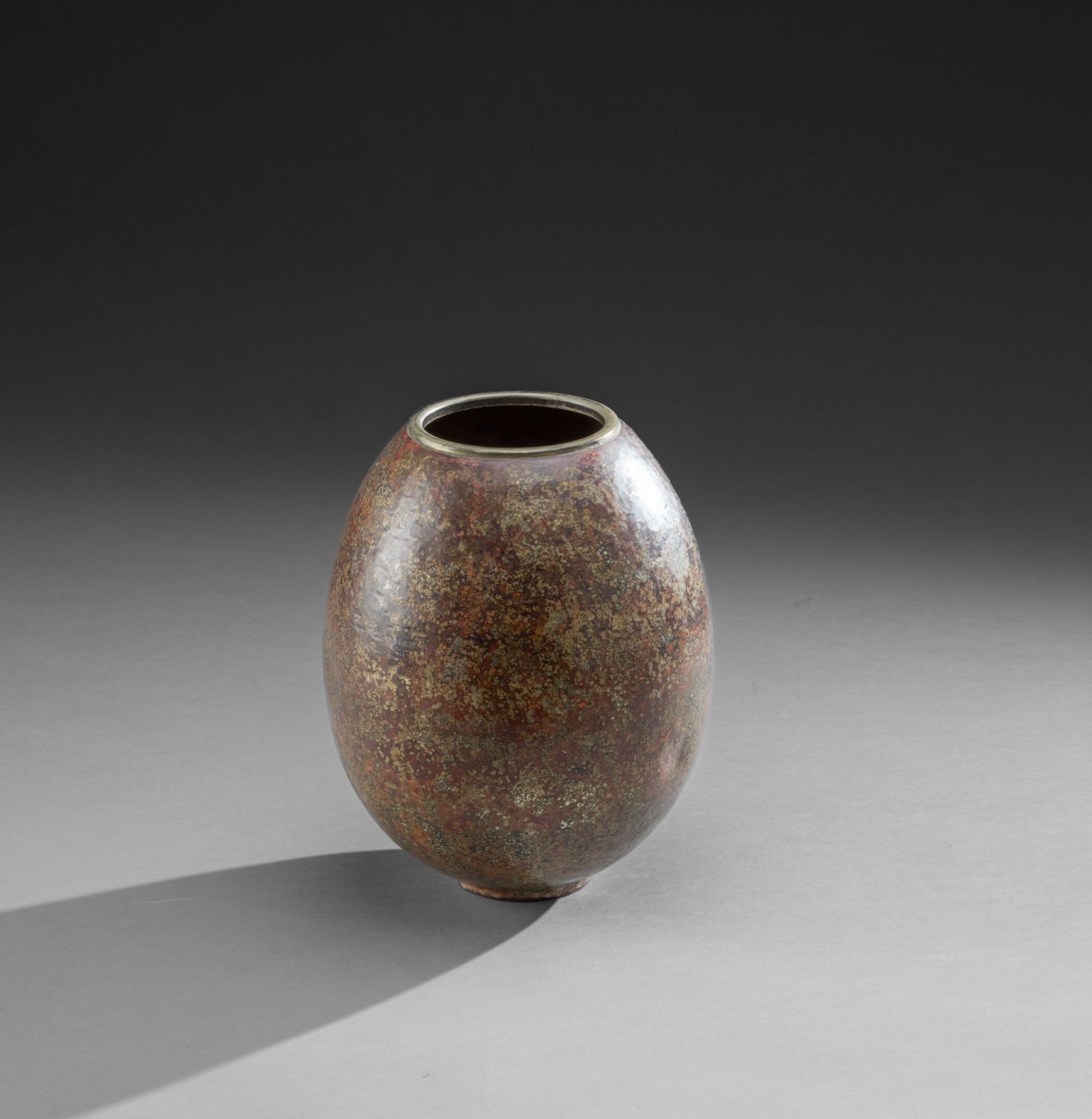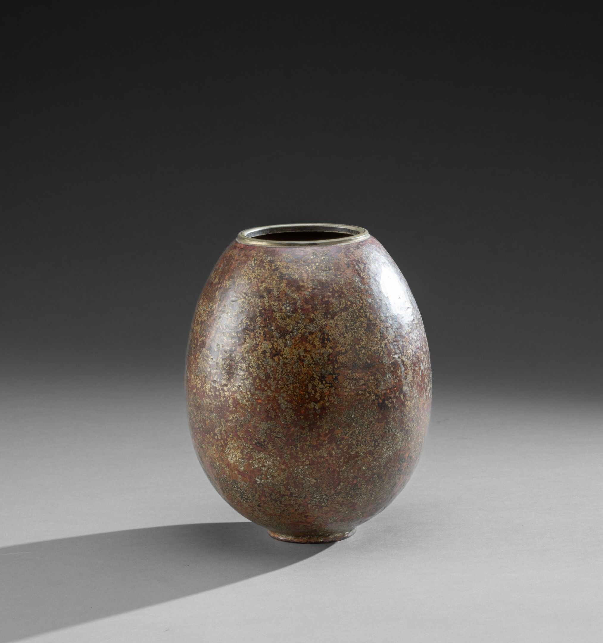 An ovoid vase in copper and brass with an ovoid body on a small annular heel. Entirely patinated in red and brown and jaspée with oxide and a sponge, signed on the reverse and dated 1953.