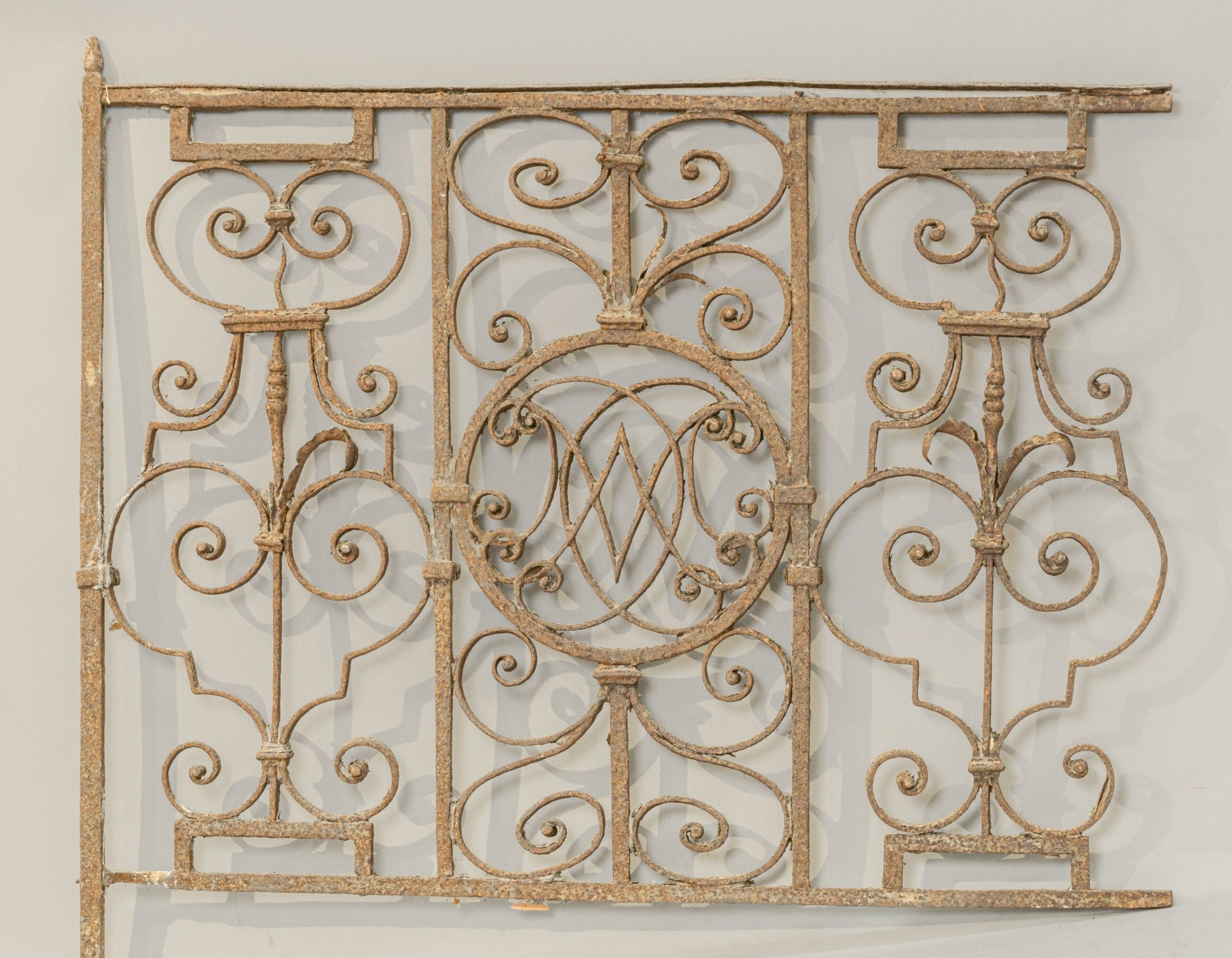 Wrought iron grille with scrolls and central D.A.M. numeral in a medallion