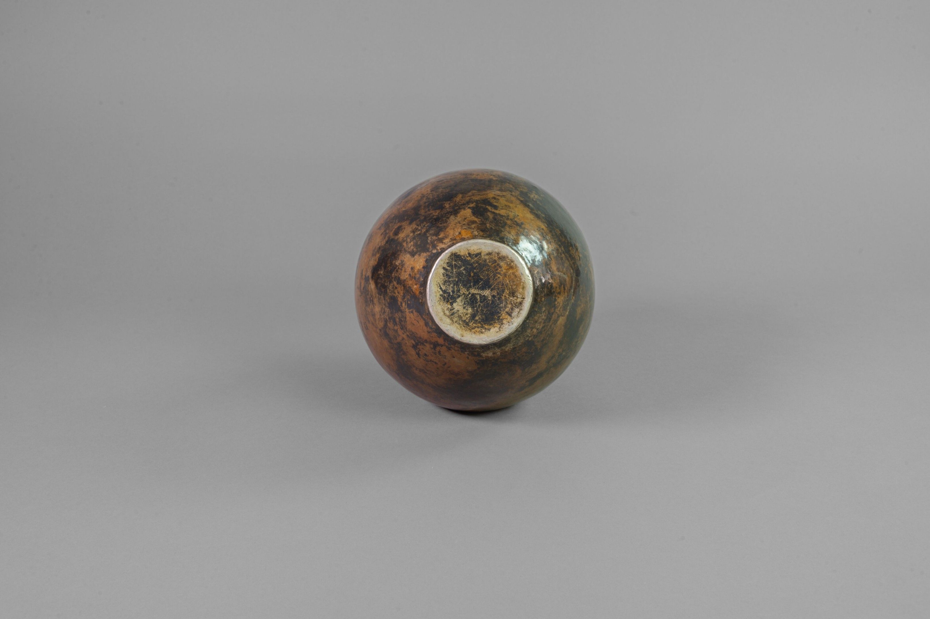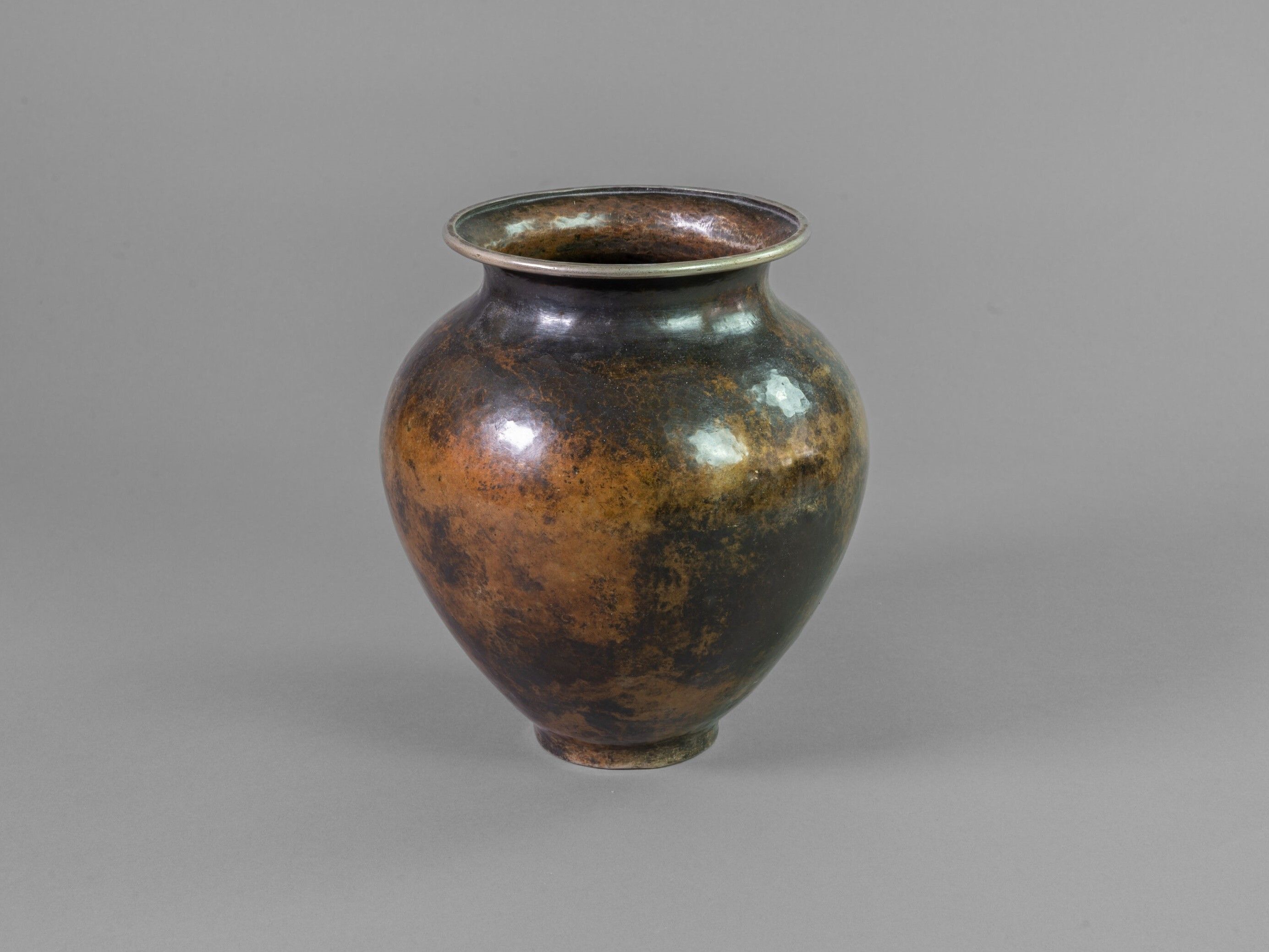Brass brassware vase with ovoid shouldered body and conical neck with brown and ochre patina, signed on the reverse.