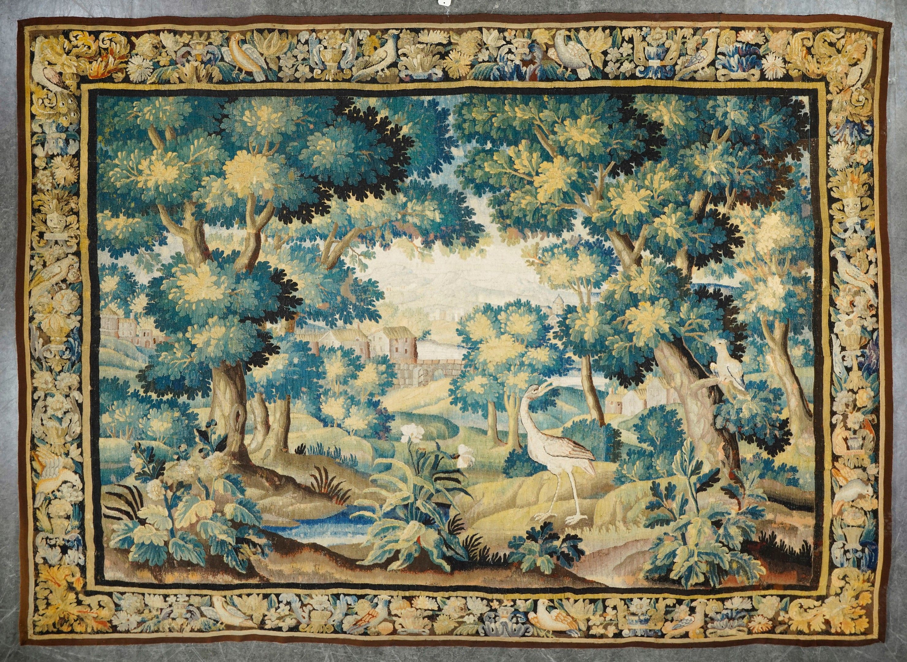AUBUSSON Important green tapestry decorated with landscape and birds in a beautiful border decorated with flowers and birds Early 18th century H. 270 cm - W. 350 cm BL Lined, restorations