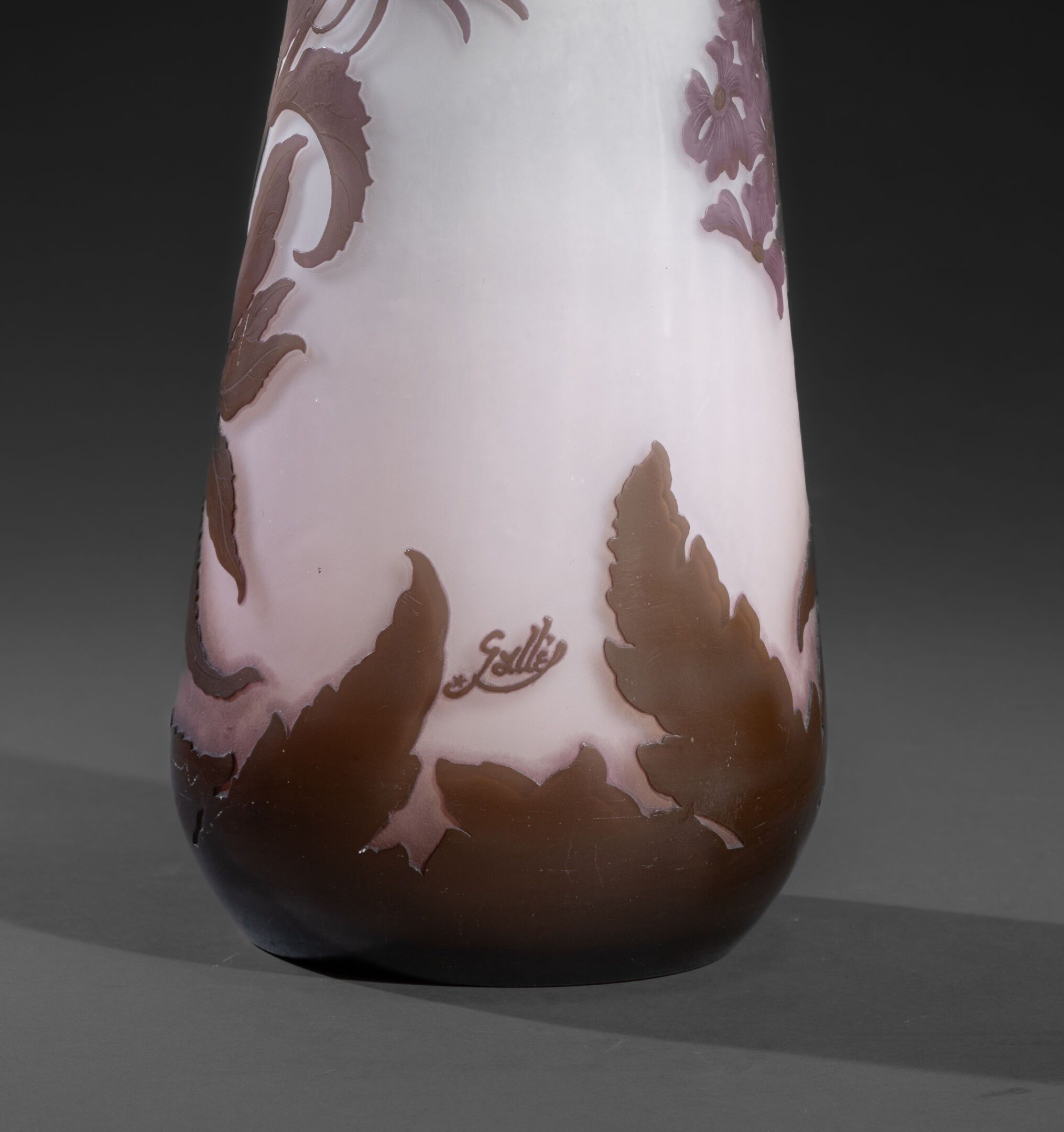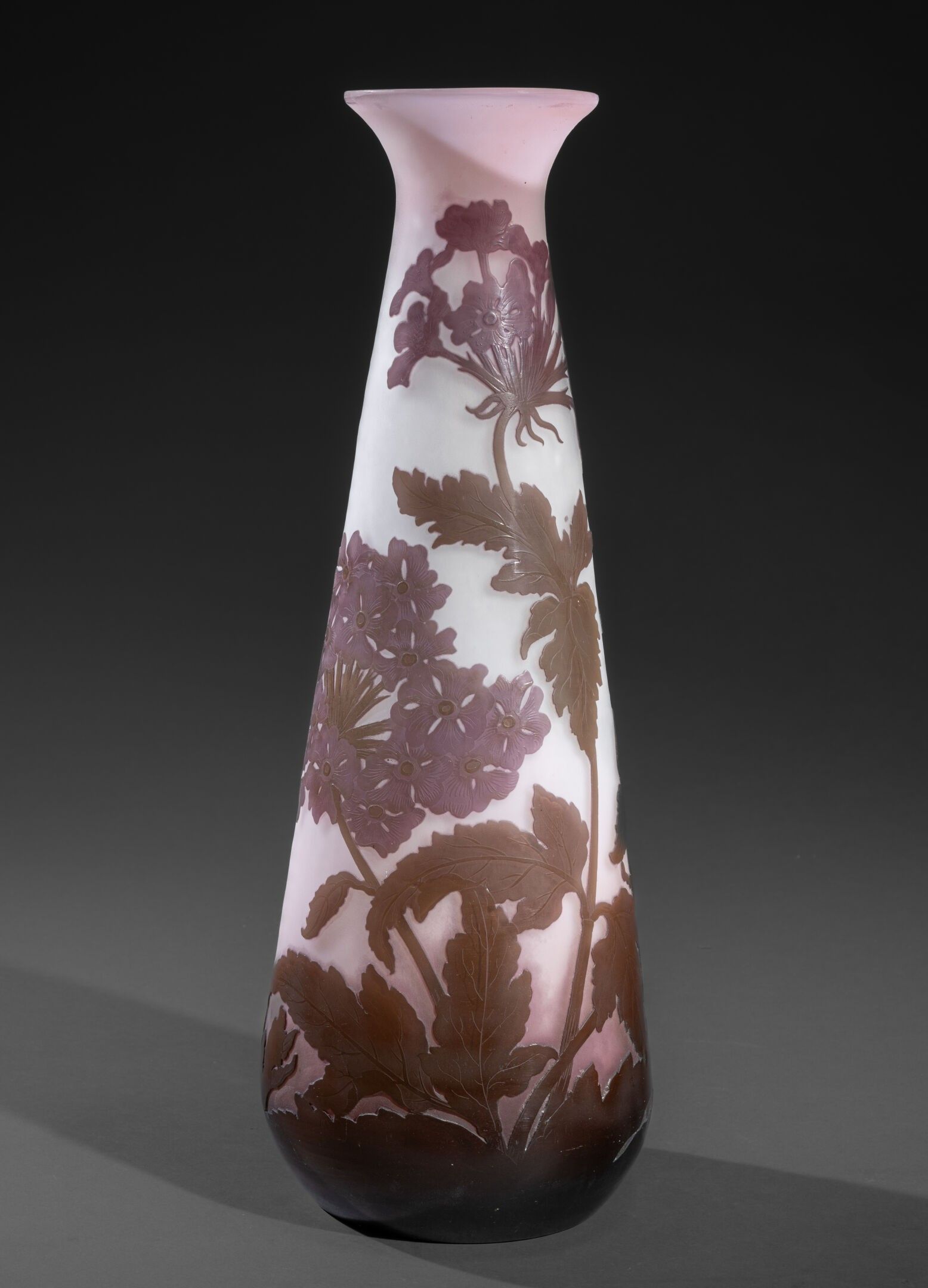 GALLÉ ESTABLISHMENTS (1904-1936) A slightly shouldered conical vase with an open neck. Greenish and violet multi-layered glass on a pinkish-white ground. Decorated with wallflowers engraved in acid cameo. Signed with a star. H. 40 cm AM