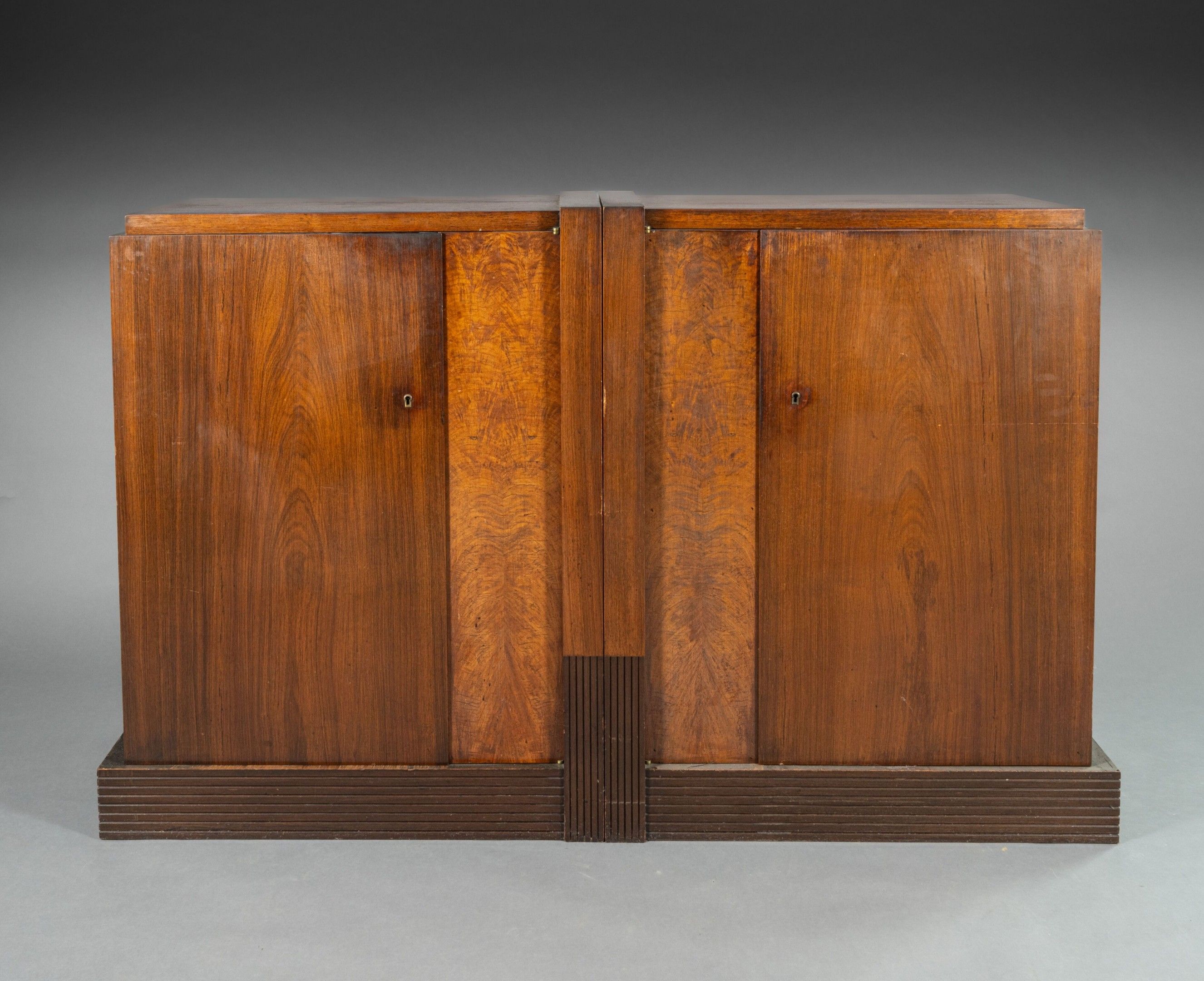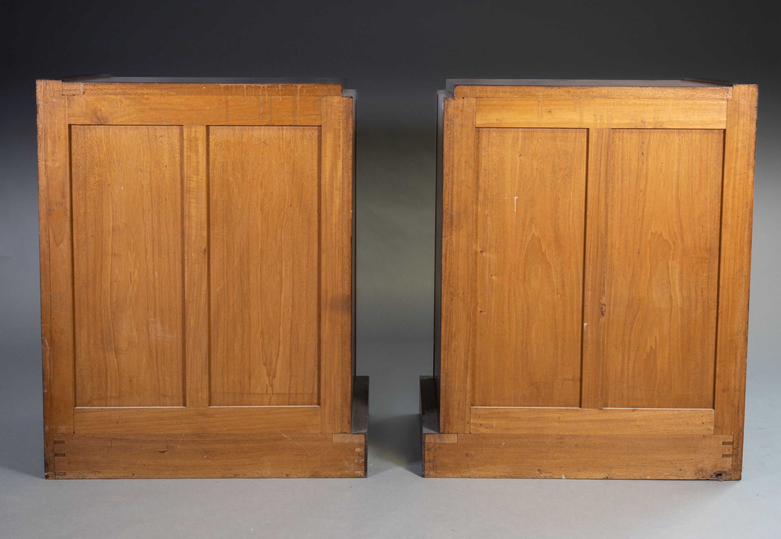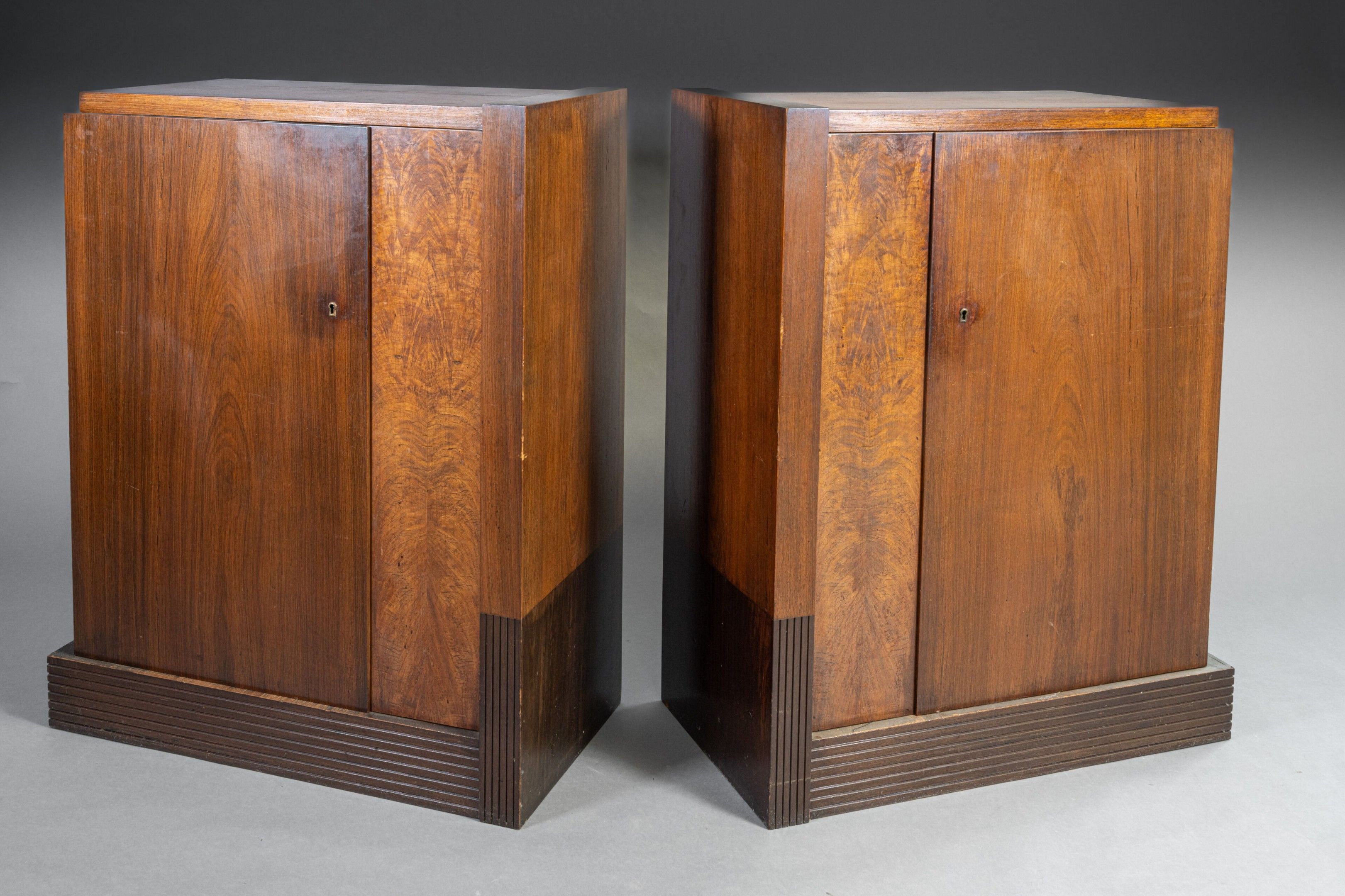 Marcel CHARPENTIER & Victor COURTRAY (in the style of) Pair of exotic wood and walnut veneered bookcases with a quadrangular body opening through a full door onto an oak interior with shelves and three small drawers. The legs are fully grooved with a slight overhang. Unit dimensions: H. 110 cm - W. 90 cm - D. 45 cm AM