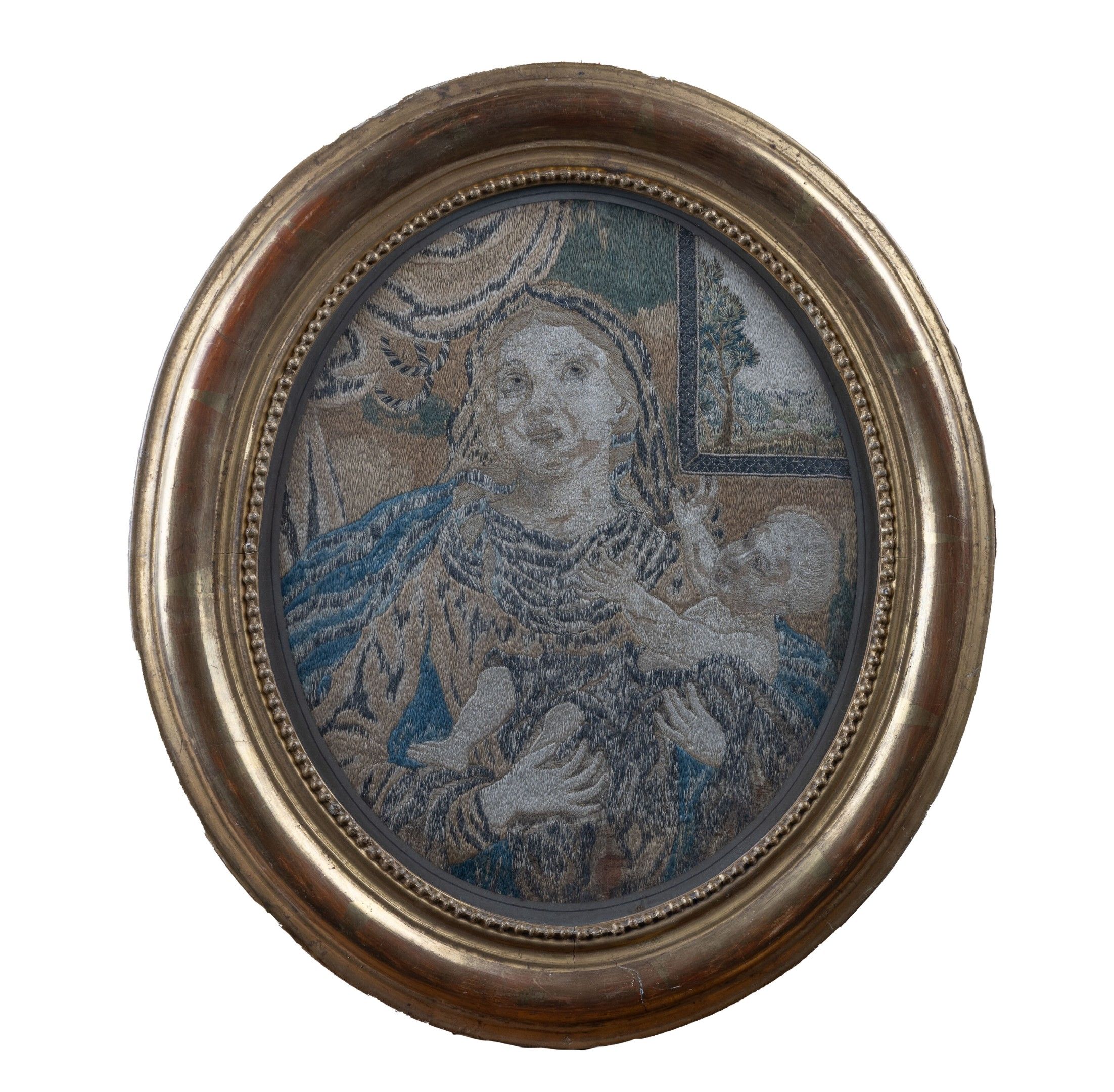 Oval medallion depicting a Virgin and Child in thrown stitch…