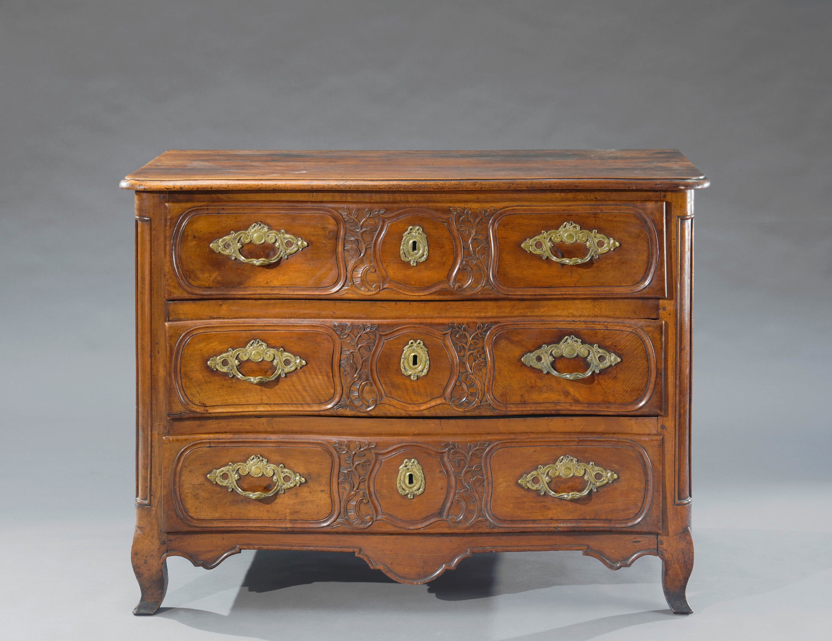 Large moulded walnut chest of drawers, the curved front with three drawers, carved with shells and foliage between the reserves, carved belt and cambered legs, bronze trim