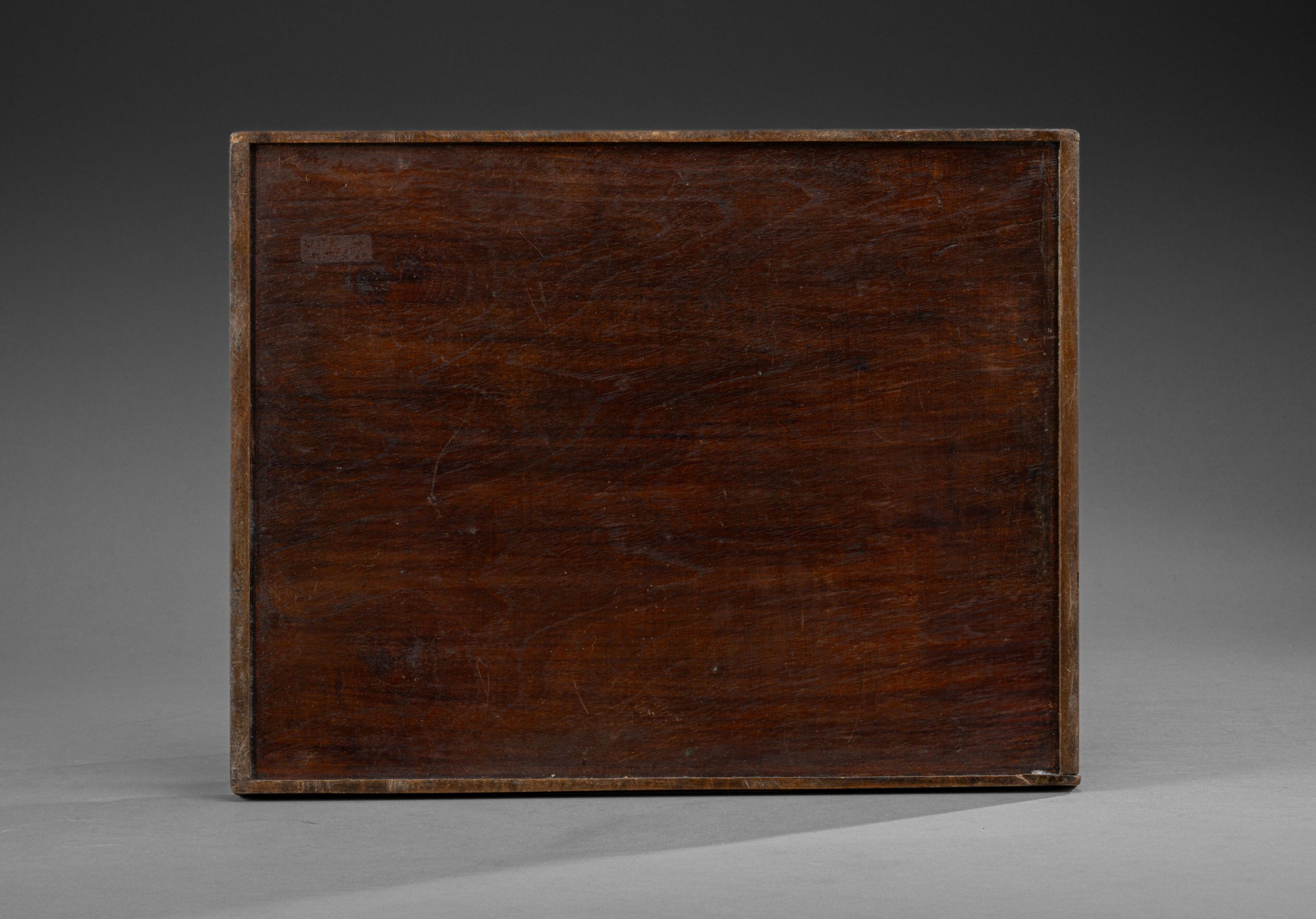 Émile GALLÉ (1846 - 1904) Moulded walnut top with rectangular view in stained oak and marquetry of different woods. Decorated with Lorraine thistles and a Lorraine cross. Hollowed-out side handles (scratches, small cracks, stains). Signed in the marquetry and located in Nancy. H. 7 cm - W. 37 cm - D. 29 cm AM Bibliography: Alastair Duncan & Georges de Bartha, Gallé Furniture, Antique Collectors' Club, Woodbridge, 2012, p. 342 for a tray referenced under no. 9 in the "Tea Trays" section, similar to our model.