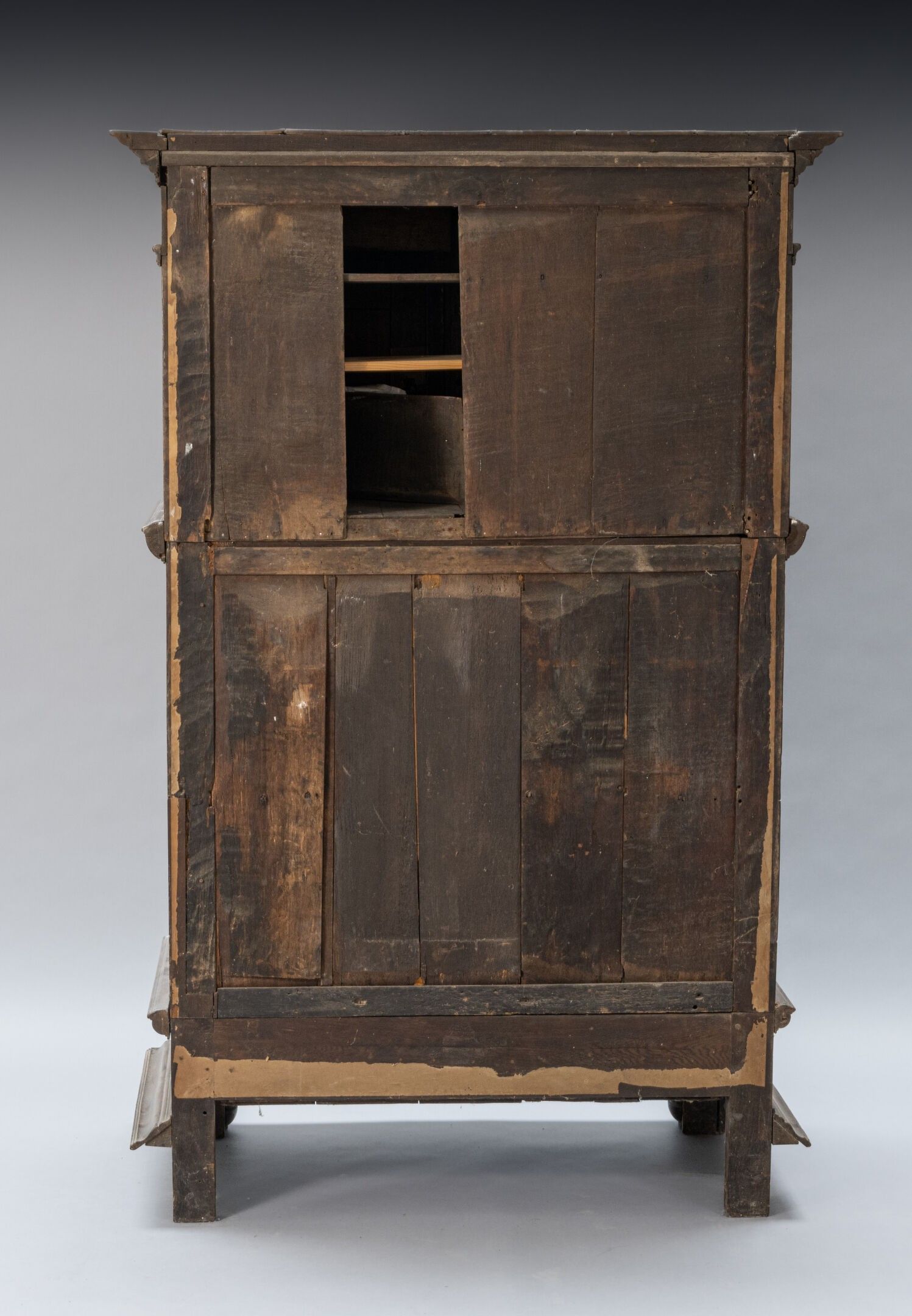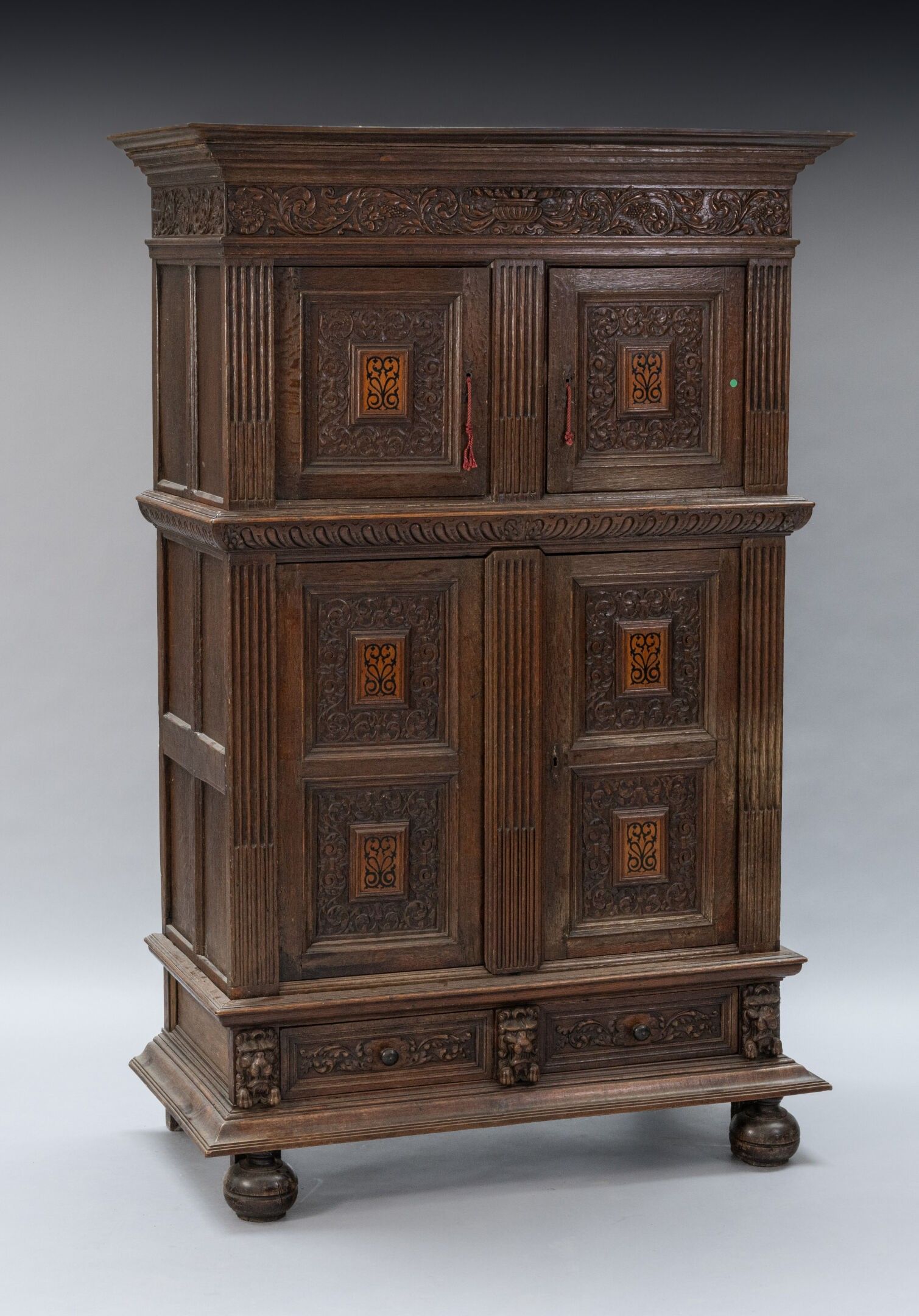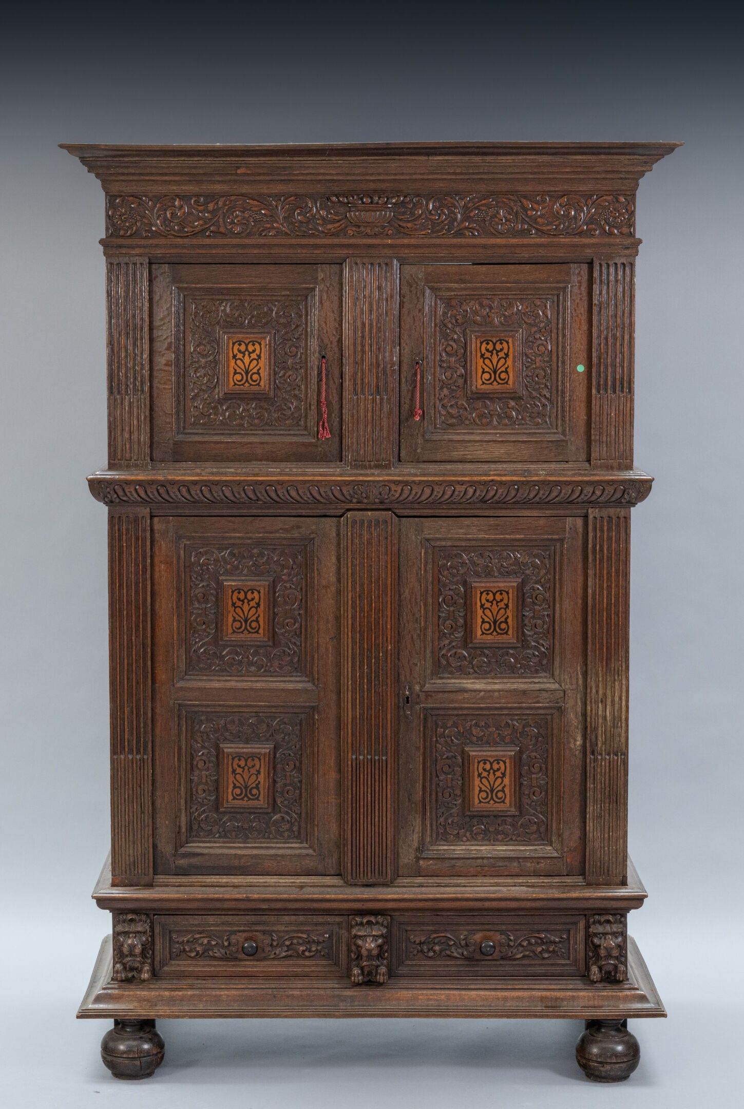 Cabinet in moulded stained oak, opening at the top with two doors carved with scrolls and centred on a rectangular inlaid motif on a light background, and at the bottom with two doors of the same design, each with two panels. The two uprights have curved fluting, the base has two drawers, and the cornice is carved with a gadrooned vase and scrolls of foliage and flowers,