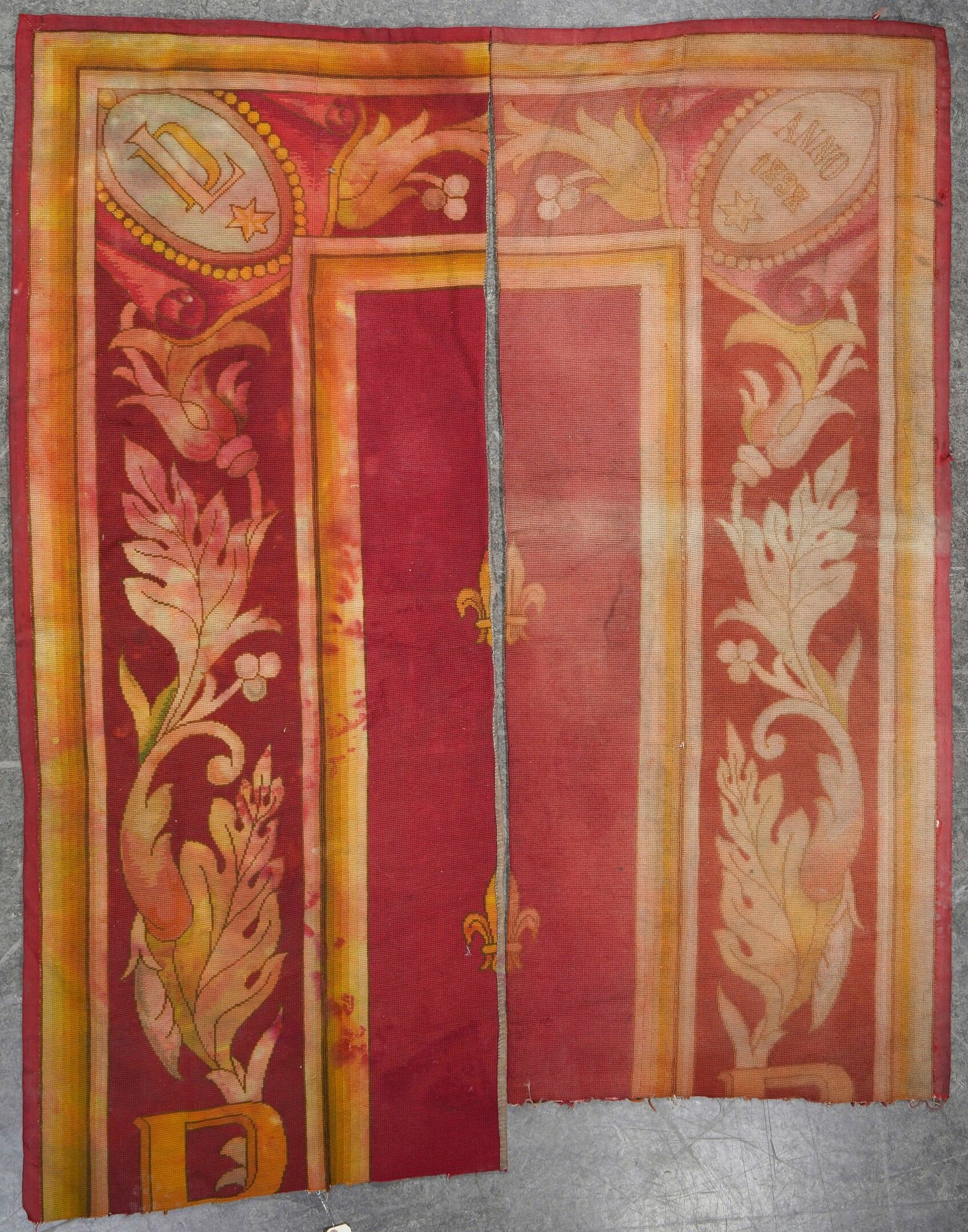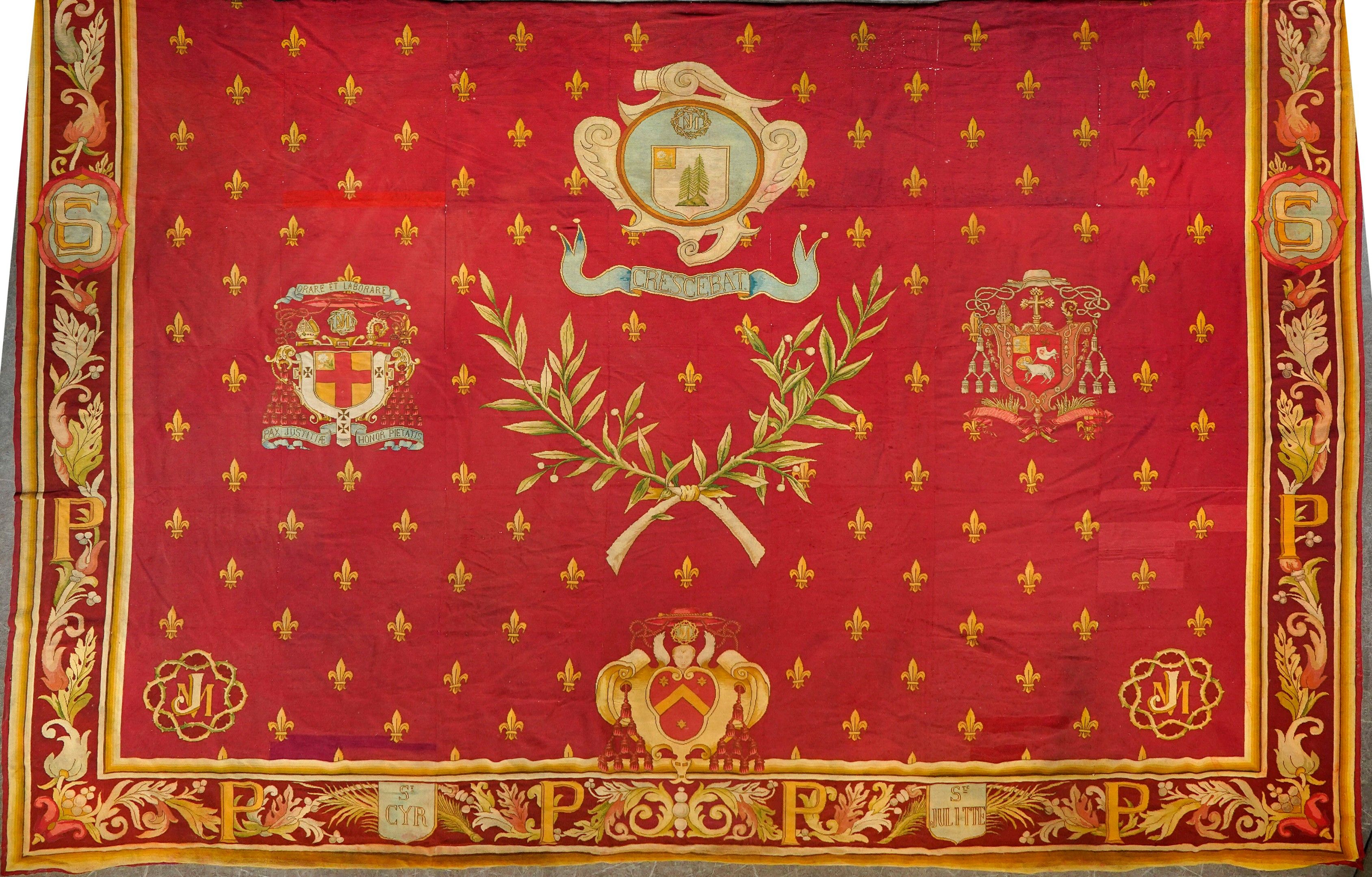 A very important gros point church carpet, with a fleur-de-lys pattern on a red background, featuring palmettes and the coat of arms of Mgr Antoine Etienne Lelong (1834-1903), Bishop of Nevers in 1891; of Cardinal Adolphe Perraud (1828-1906) and Cardinal Pierre de Bérulle (1575-1629), the figures "JM" in the lower spandrels, the border with polychrome foliate scrolls bearing the inscriptions "St Cyr" and "Ste Julitte" in coats of arms, and the letters "P" and "SC" interlaced.