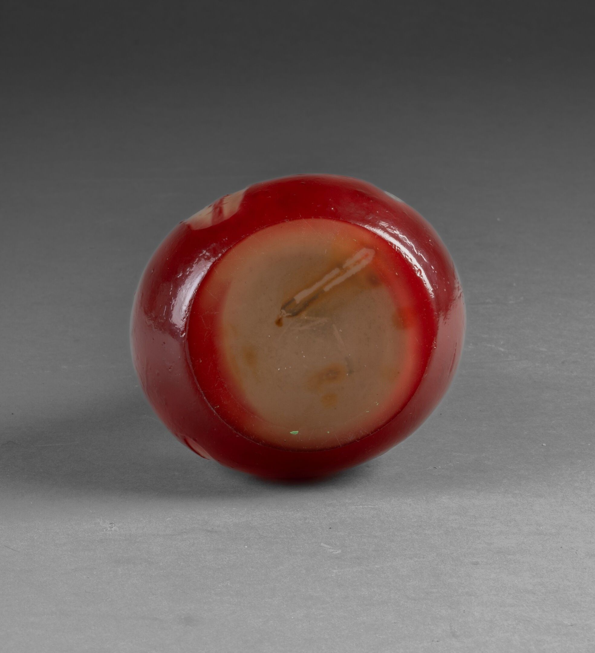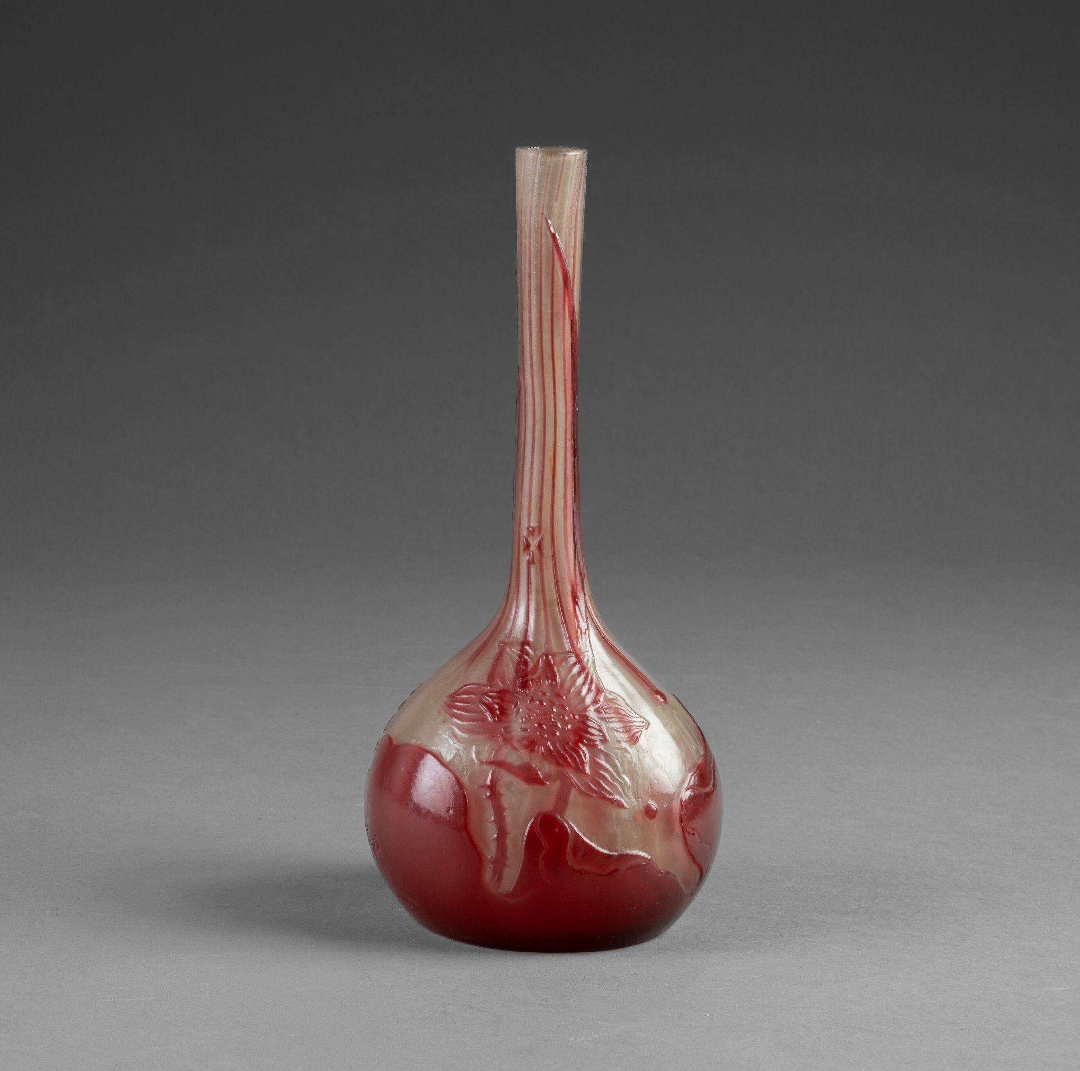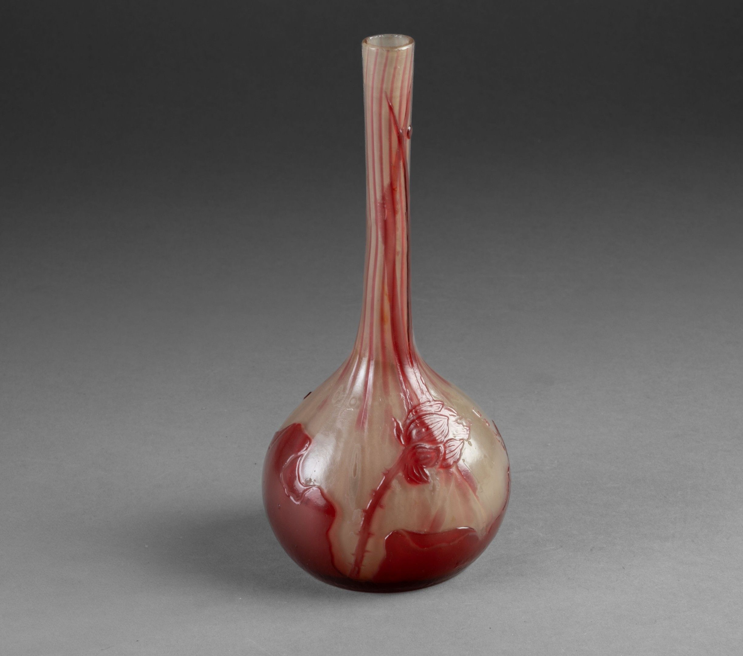 Émile GALLÉ (1846 - 1904) Soliflore with ovoid base and long, slightly curved neck. Red lined glass on a yellowish white ground. Décor of lotus flowers engraved in cameo with acid and neck with curved ribbons (tiny chips on the neck), signed. H. 21 cm AM