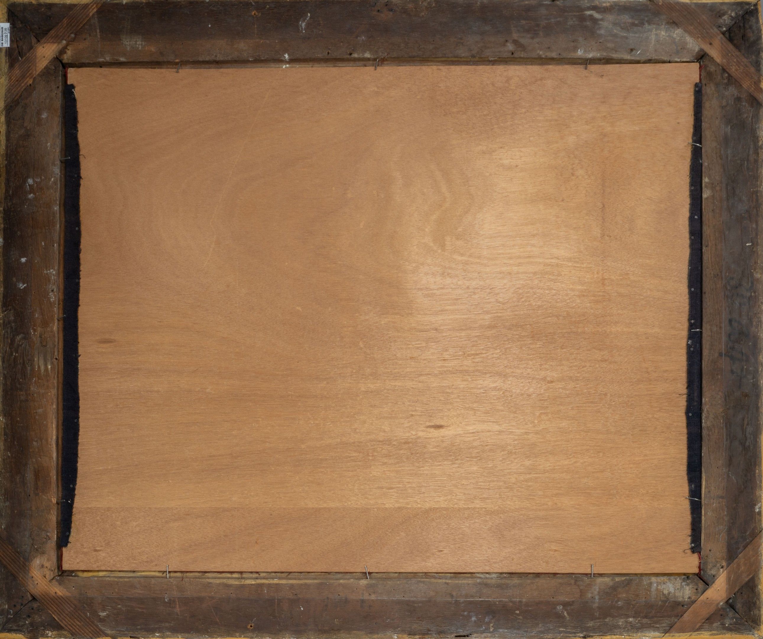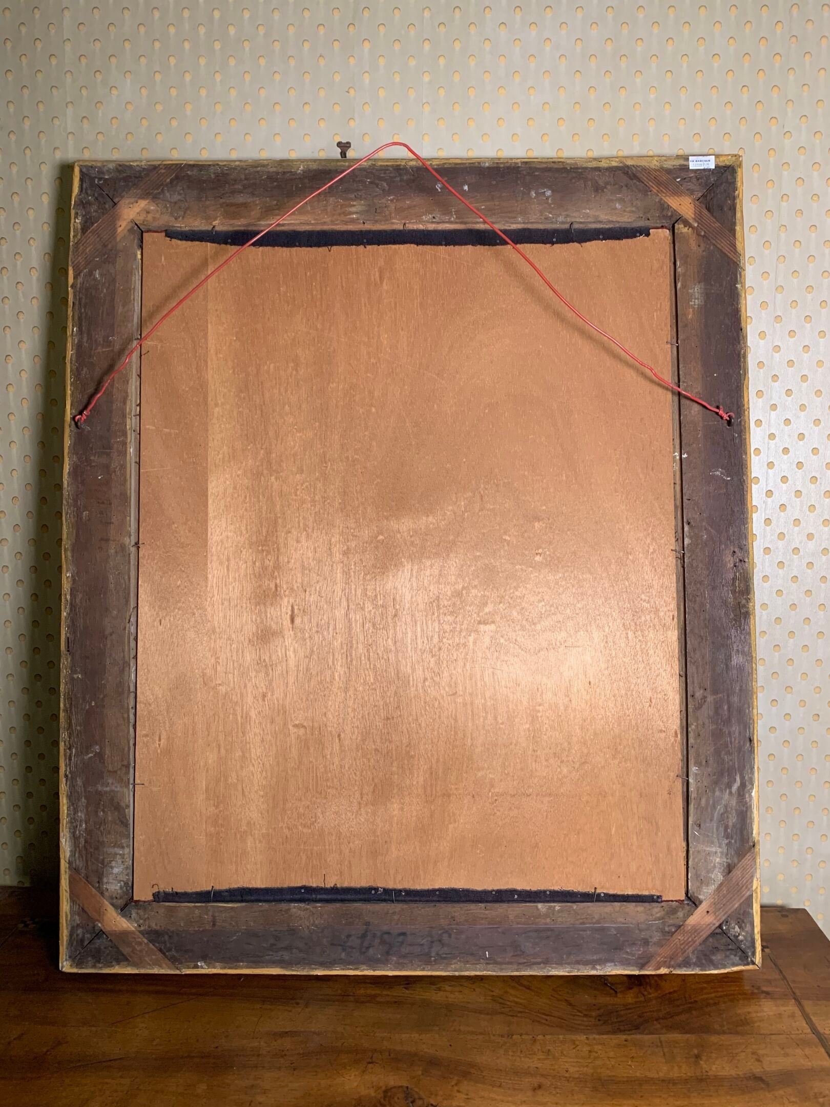 In a carved and gilded wooden frame with palmettes motif and cordial spandrels