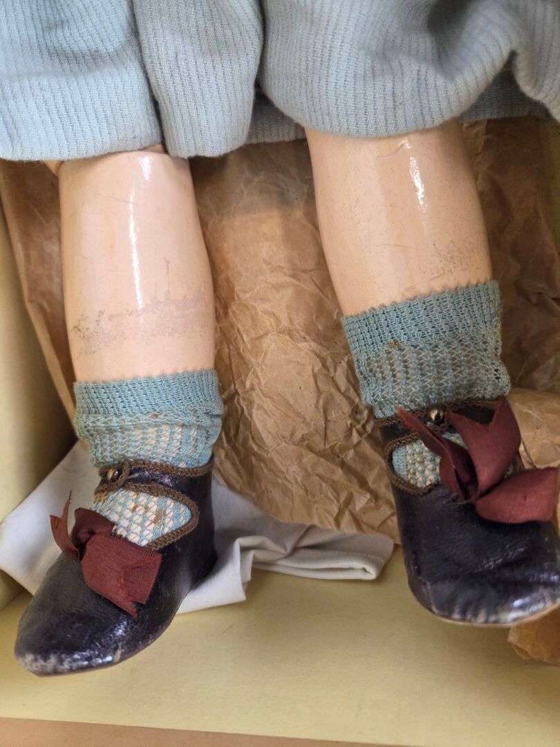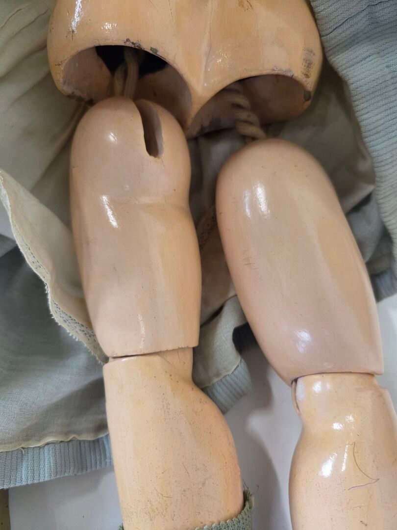 JUMEAU - Late Jumeau doll manufactured after 1900 by the SFBJ. Jumeau head in bisque, good condition. Articulated body in painted wood, open mouth, visible teeth, pierced ears. Original clothes, in original box. - model clothes are attached, length: 57 cm