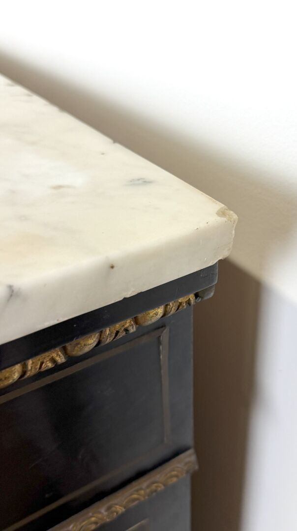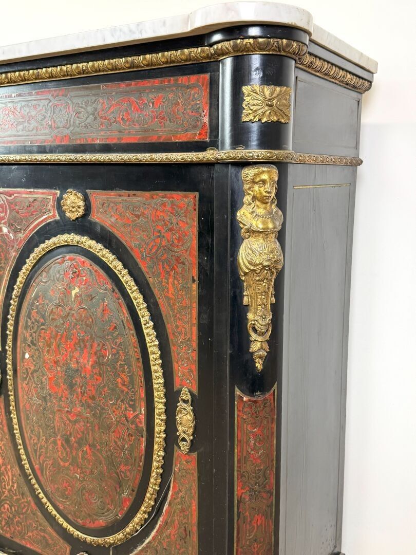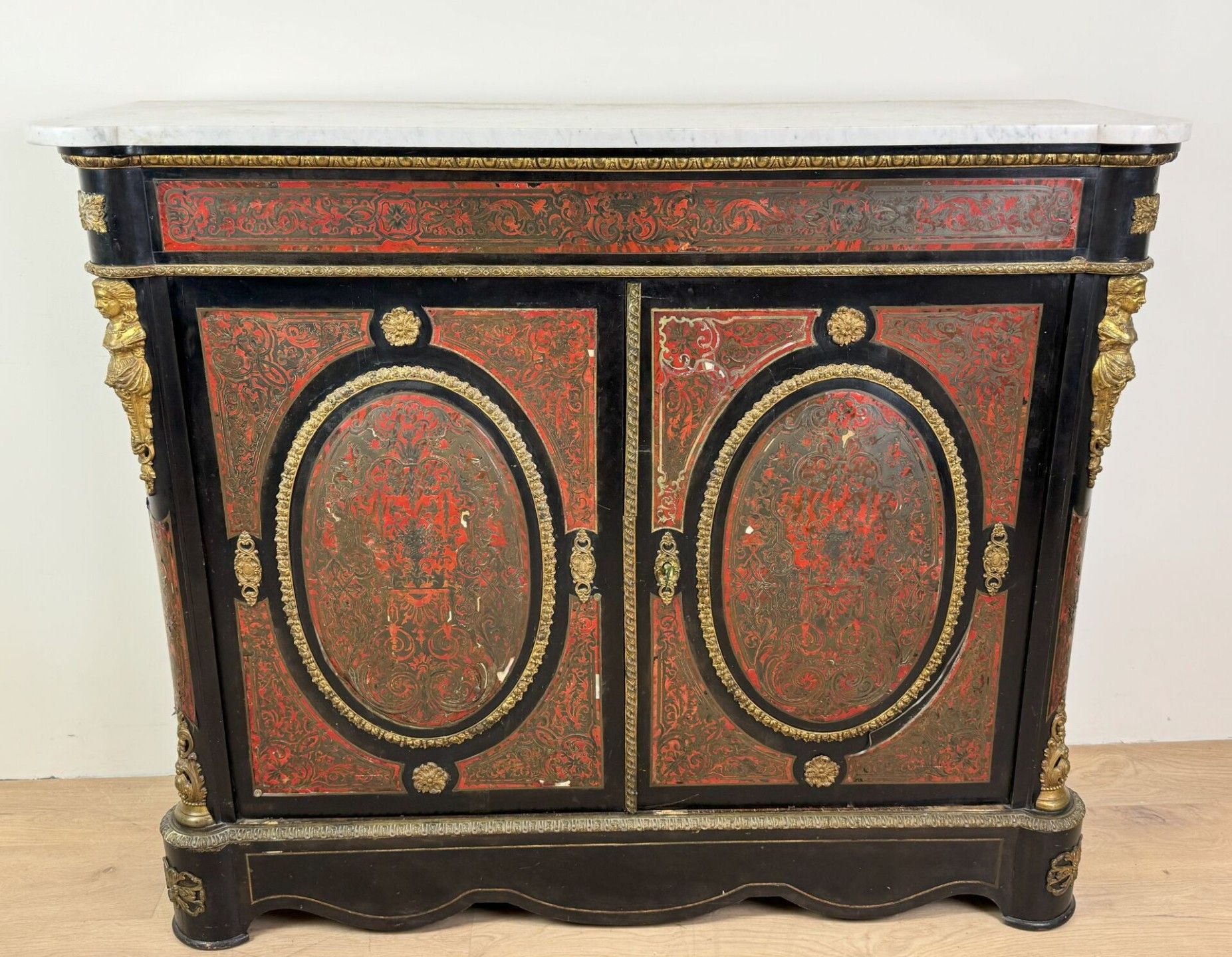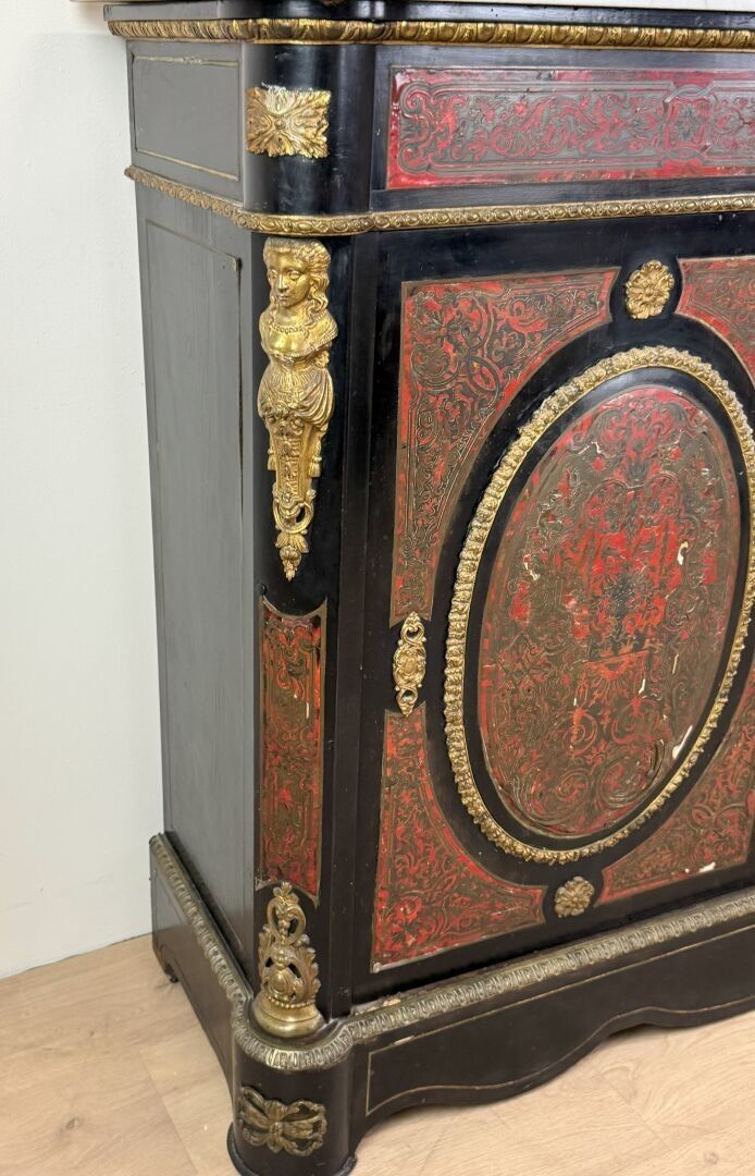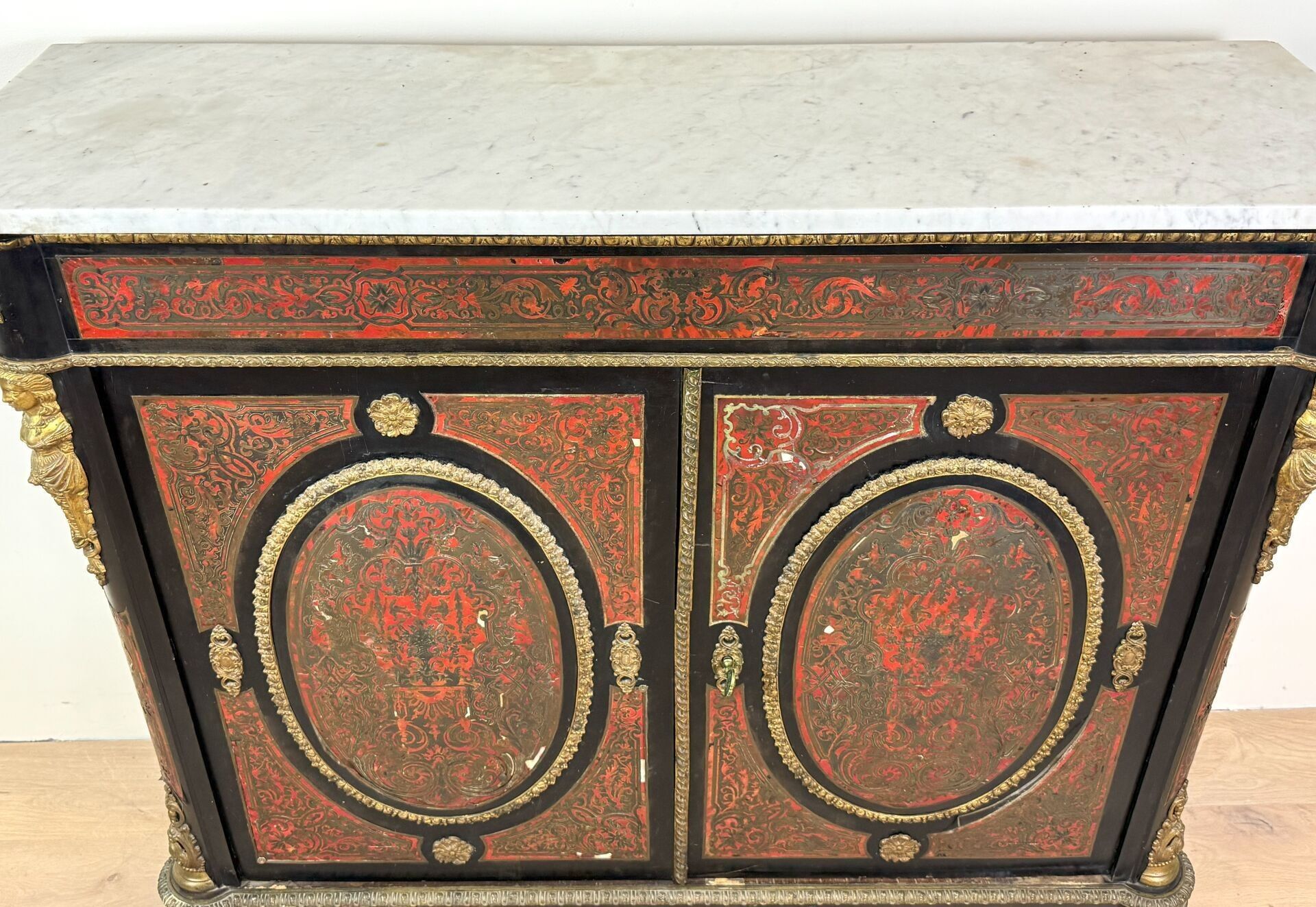 Napoleon III style Boulle marquetry cabinet opening with two doors, the two doors with curved medallion motifs, white marble top (chip), gilt bronze trim - 131 x 110 x 42 cm Misses and accidents (notably to the marquetry)