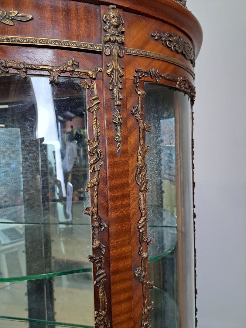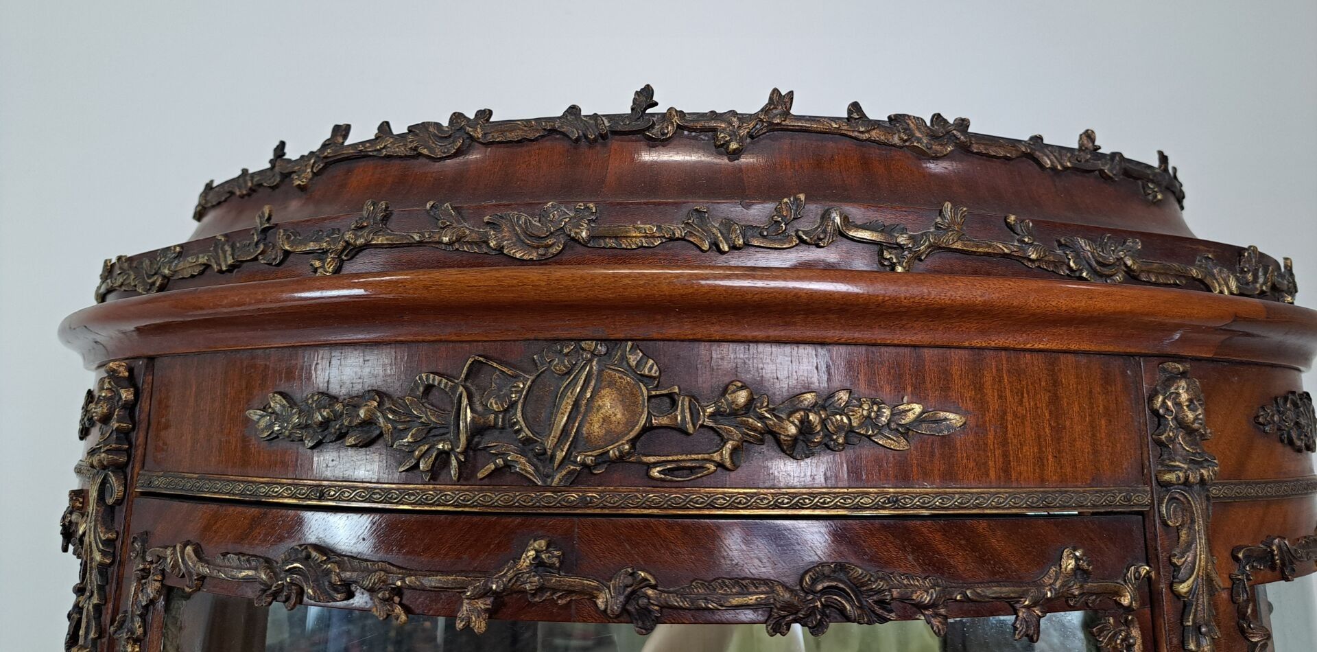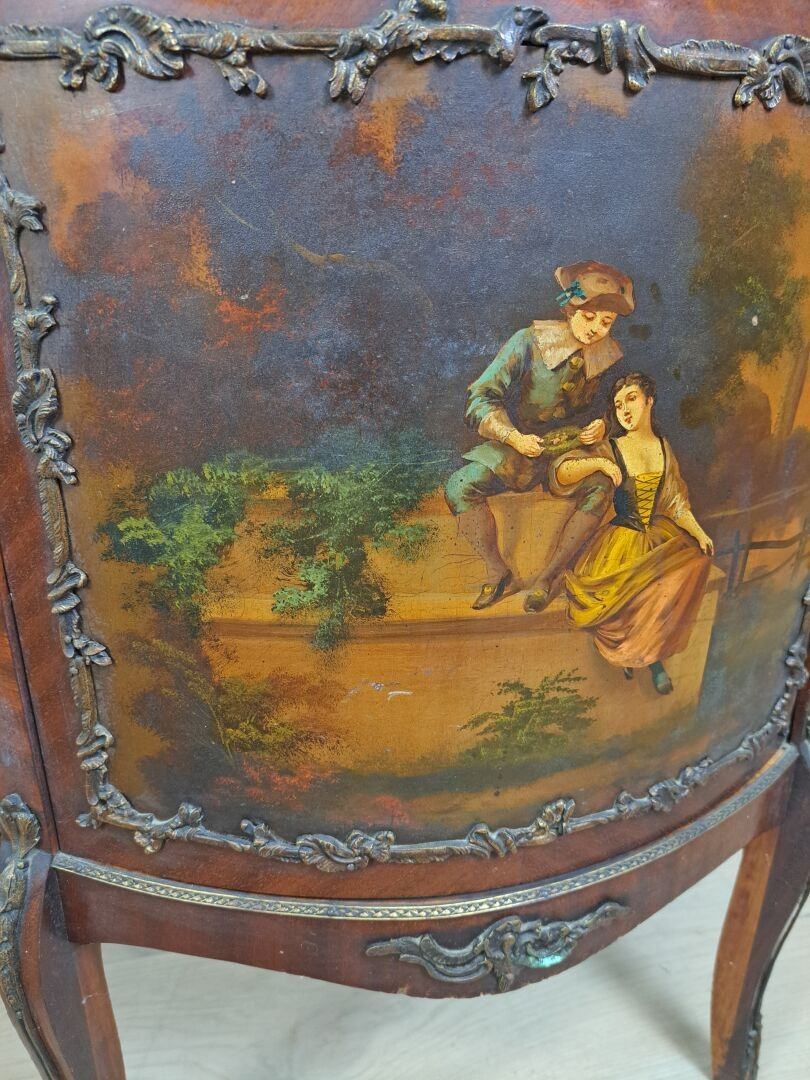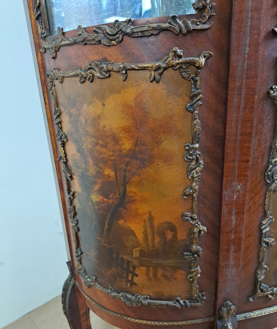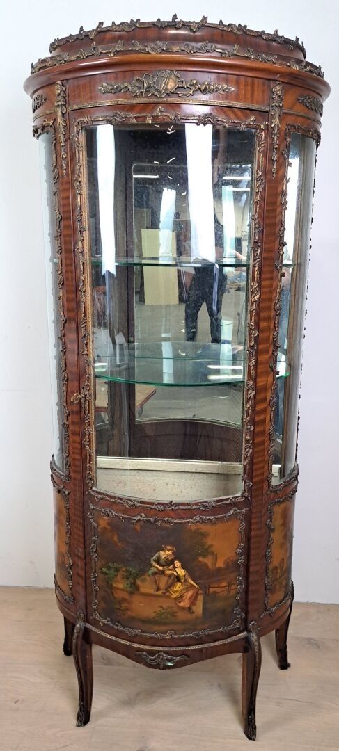 Napoleon III display case in inlaid wood, decorated with a painted galant scene, gilded bronze trim - 67.5 x 165 x 38 cm (veneer missing)