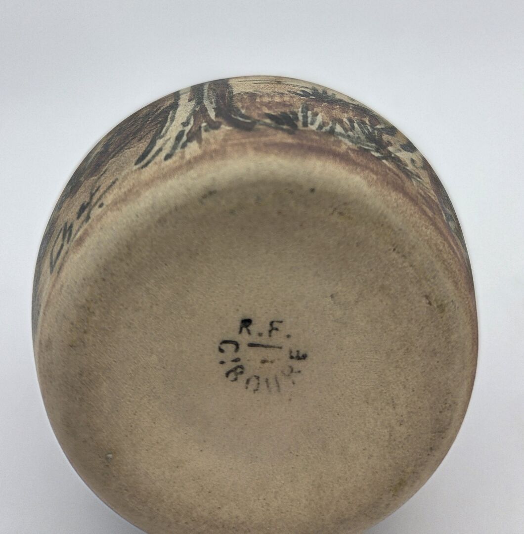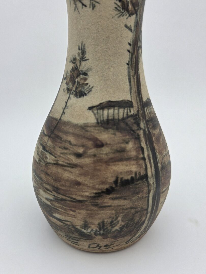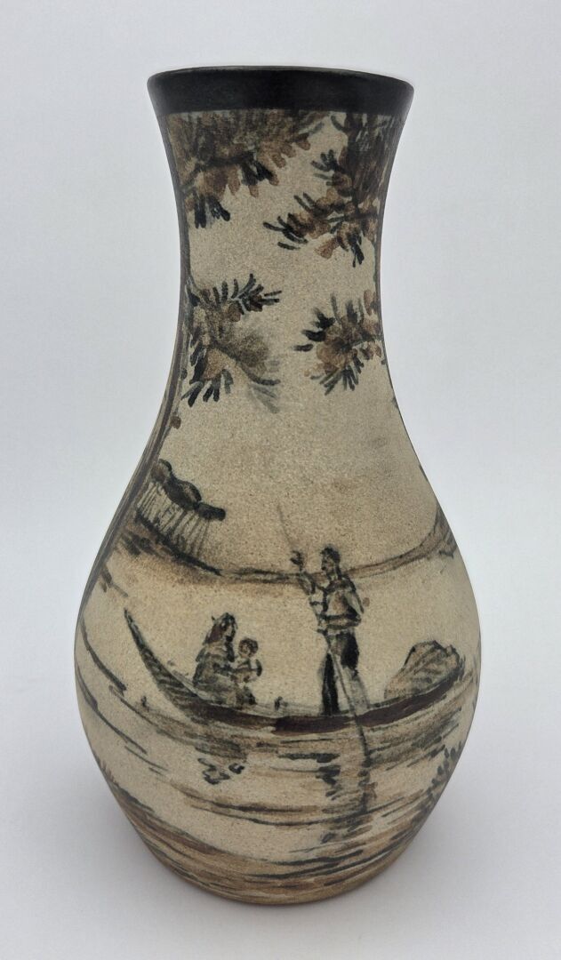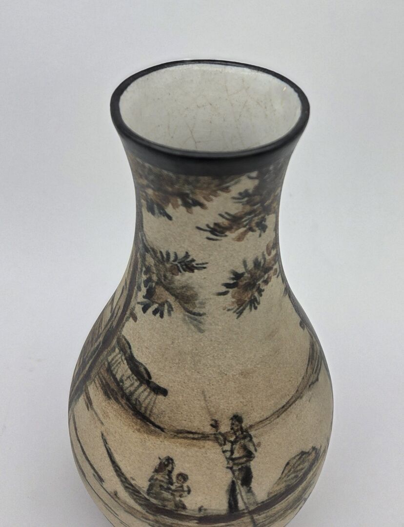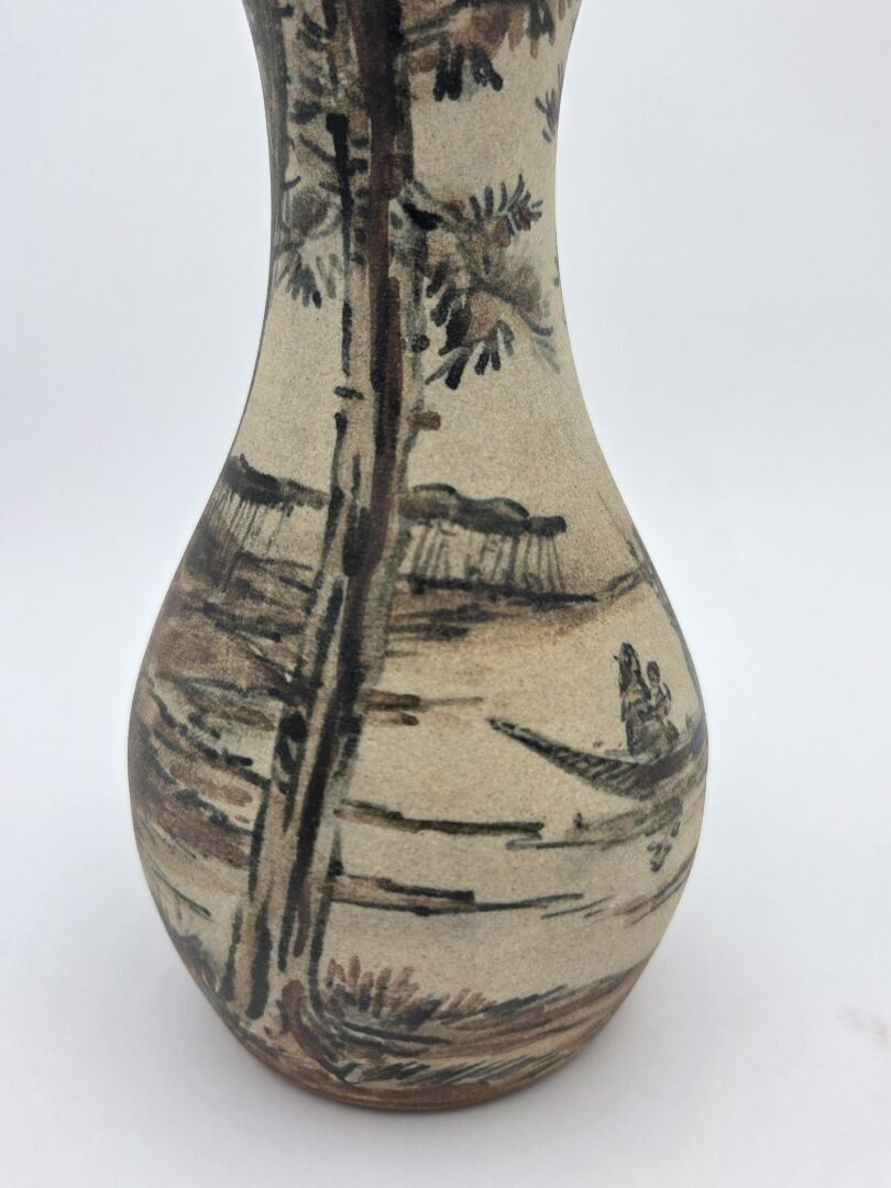 A stoneware vase decorated with a scene of life by a lake, height: 17 cm (one crack)