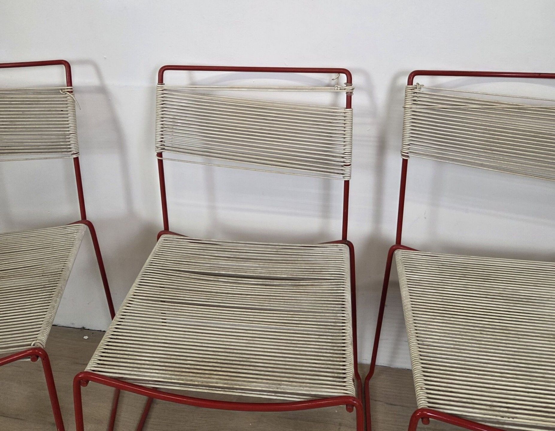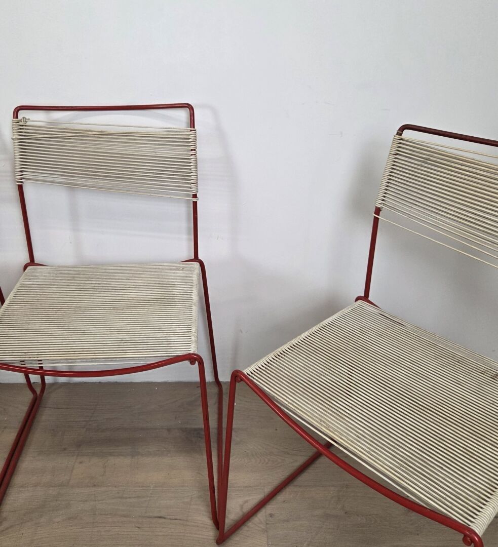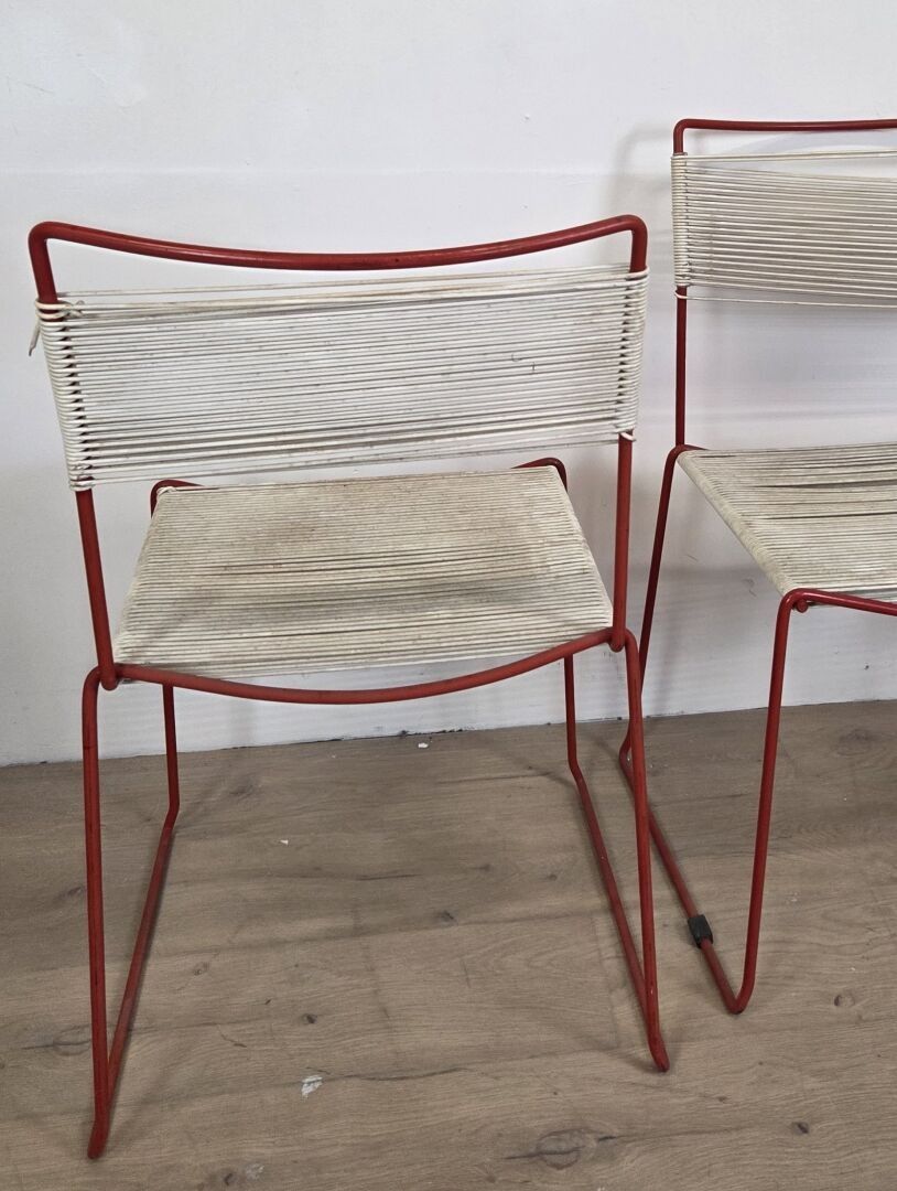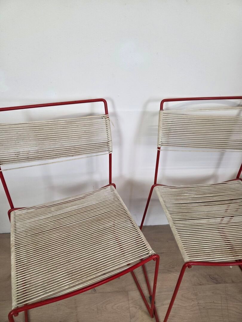Four chairs in red tubular steel. Seats and backrests in transparent vinyl thread.