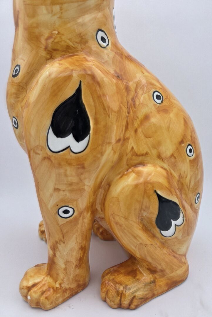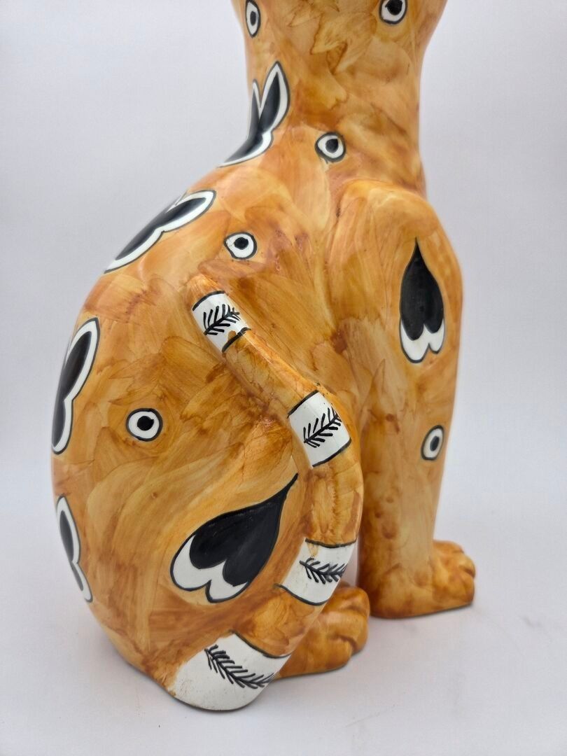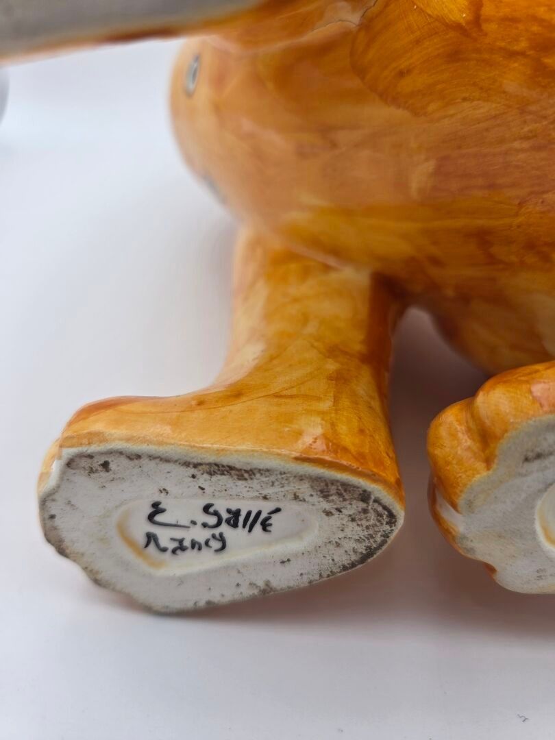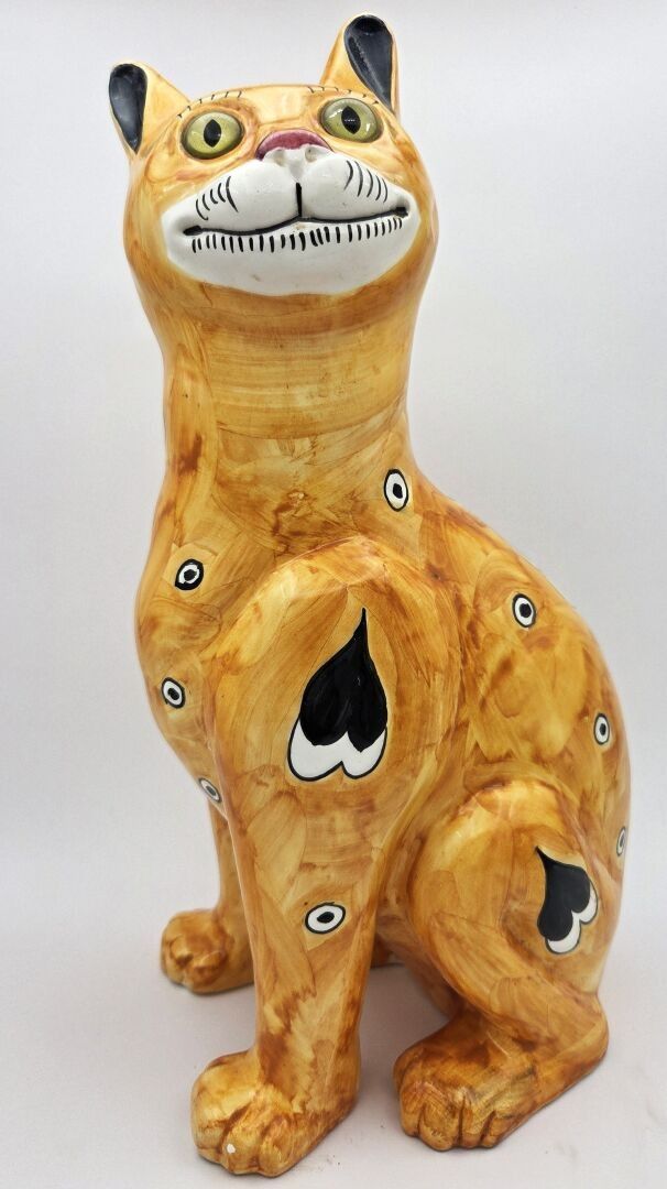 Emile GALLE (1846-1904), Enamelled earthenware cat decorated with hearts, circles and shapes in black on a yellow-orange ground, the eyes in green and black sulphur. Signed "E.Gallé Nancy" under one paw. Height : 32 cm Jump to a front paw