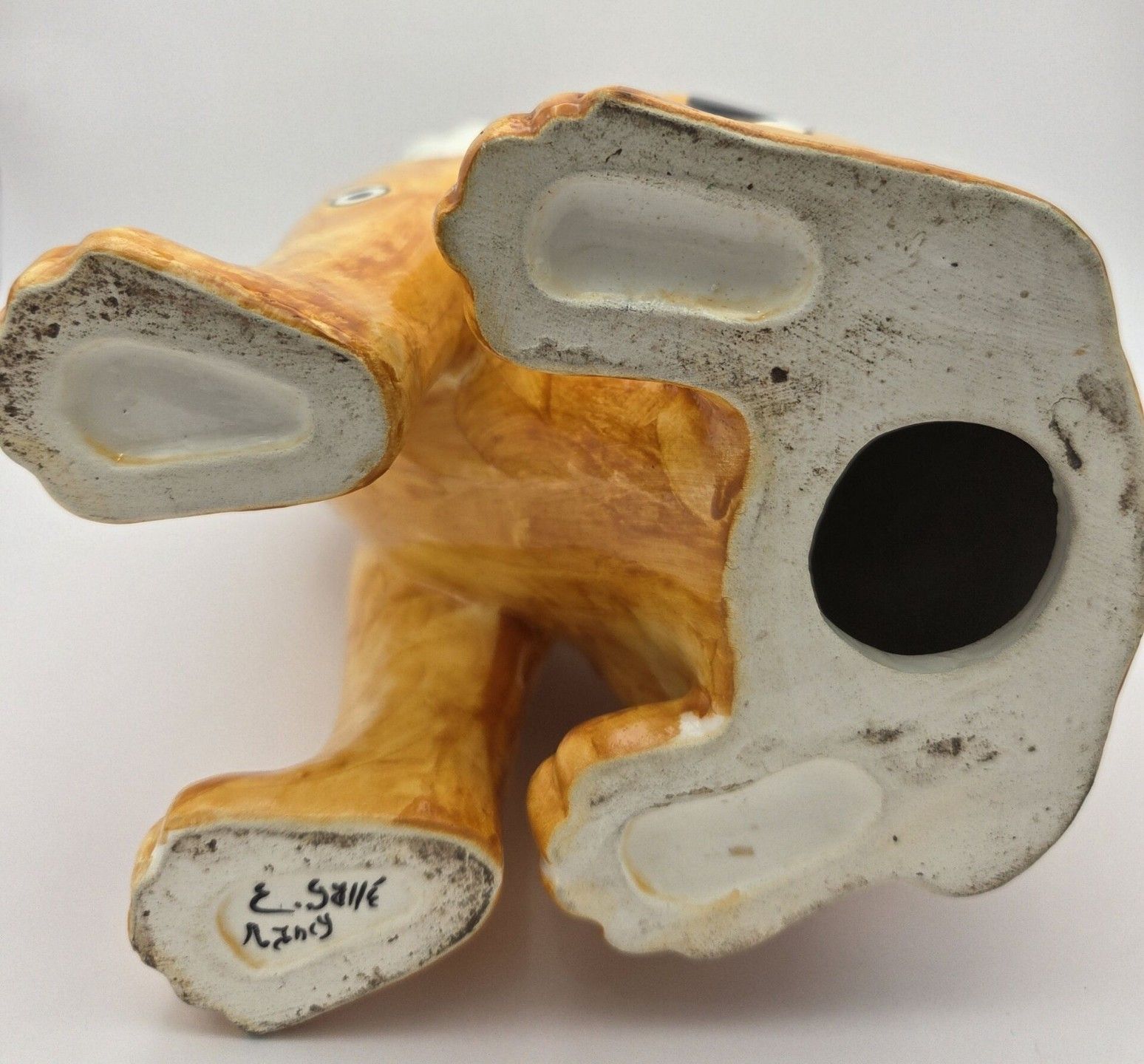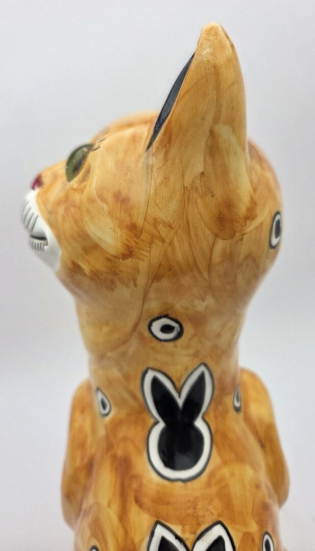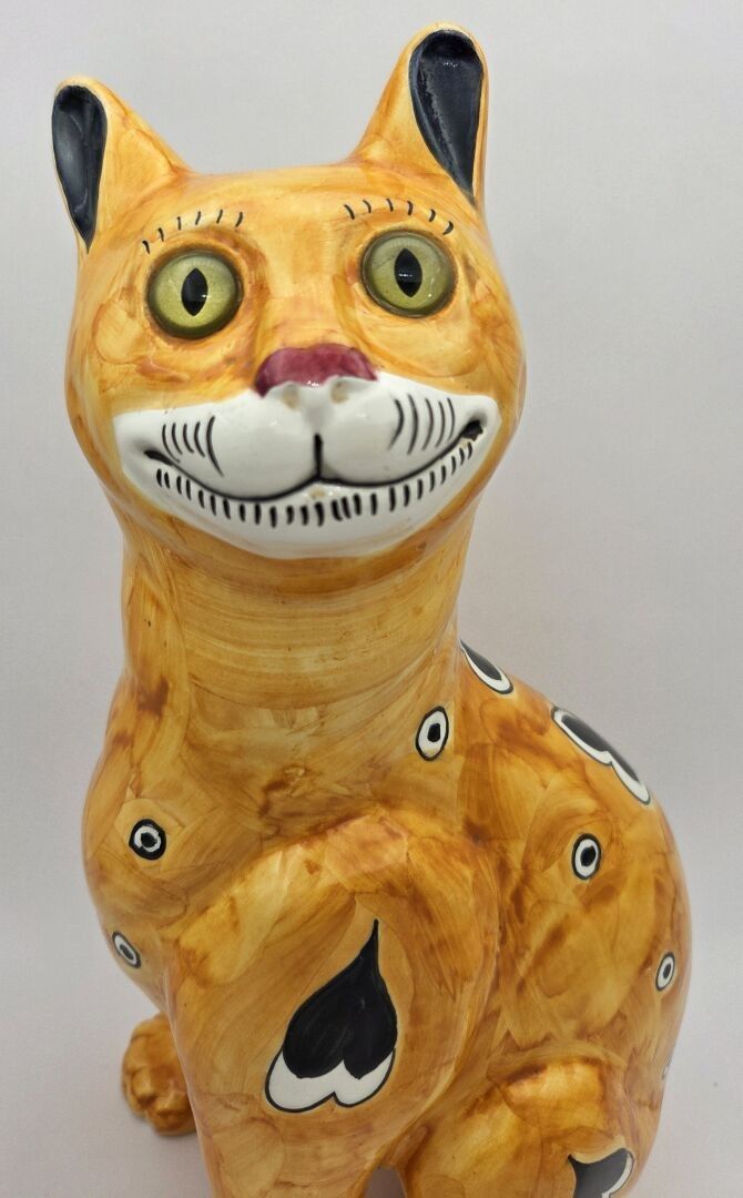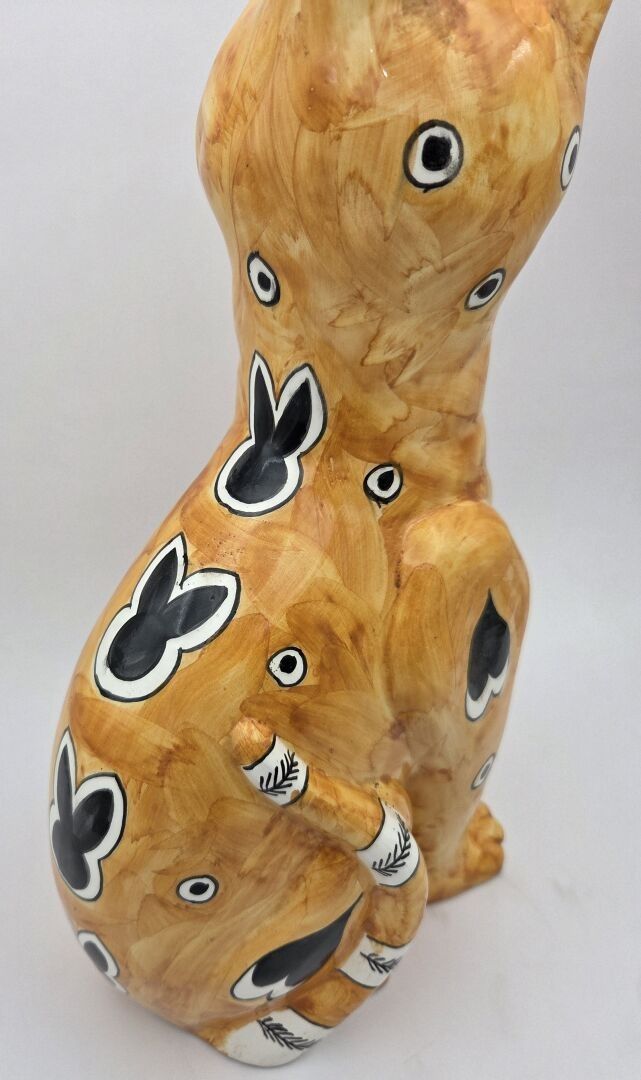 Emile GALLE (1846-1904), Enamelled earthenware cat decorated with hearts, circles and shapes in black on a yellow-orange ground, the eyes in green and black sulphur. Signed "E.Gallé Nancy" under one paw. Height : 32 cm Jump to a front paw