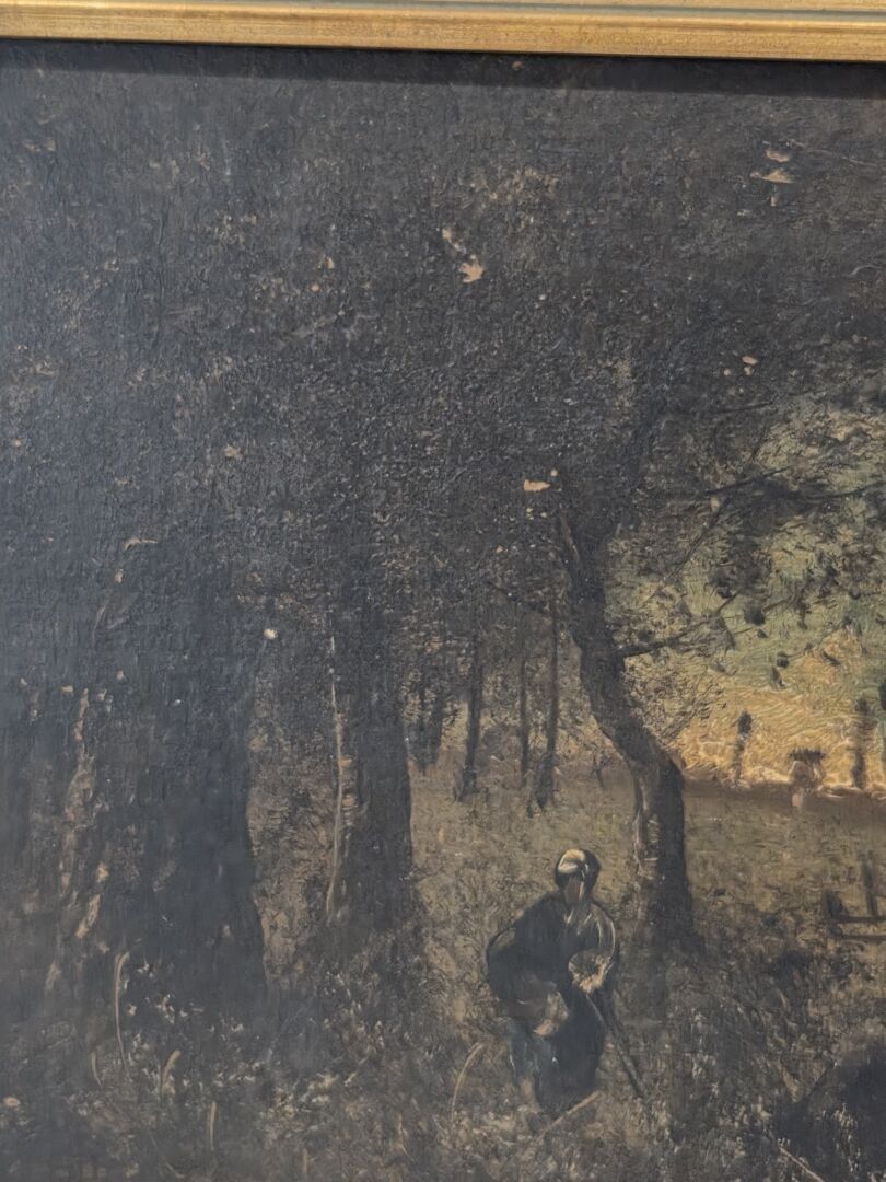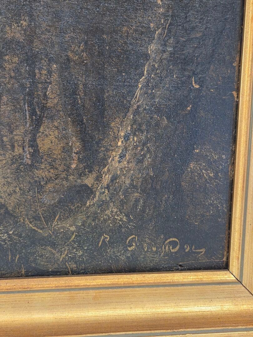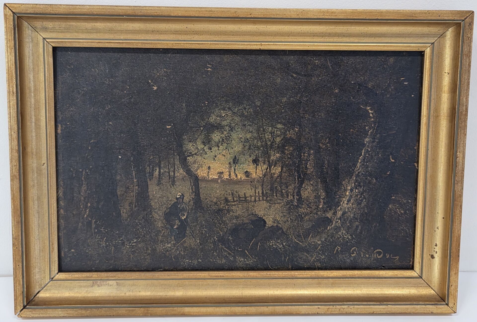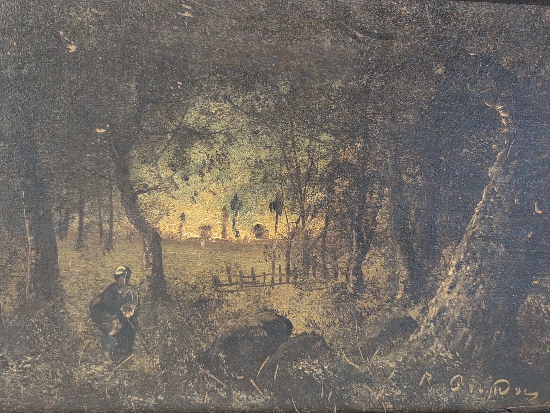 René GOURDON (1855-?), Paysage animé au sous-bois, oil on panel, signed lower right, 24.5 x 39.5 cm -slips of paint