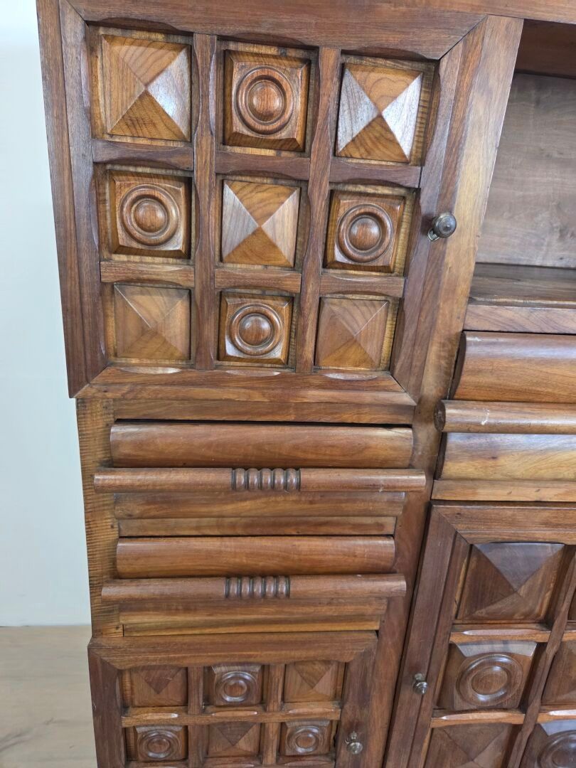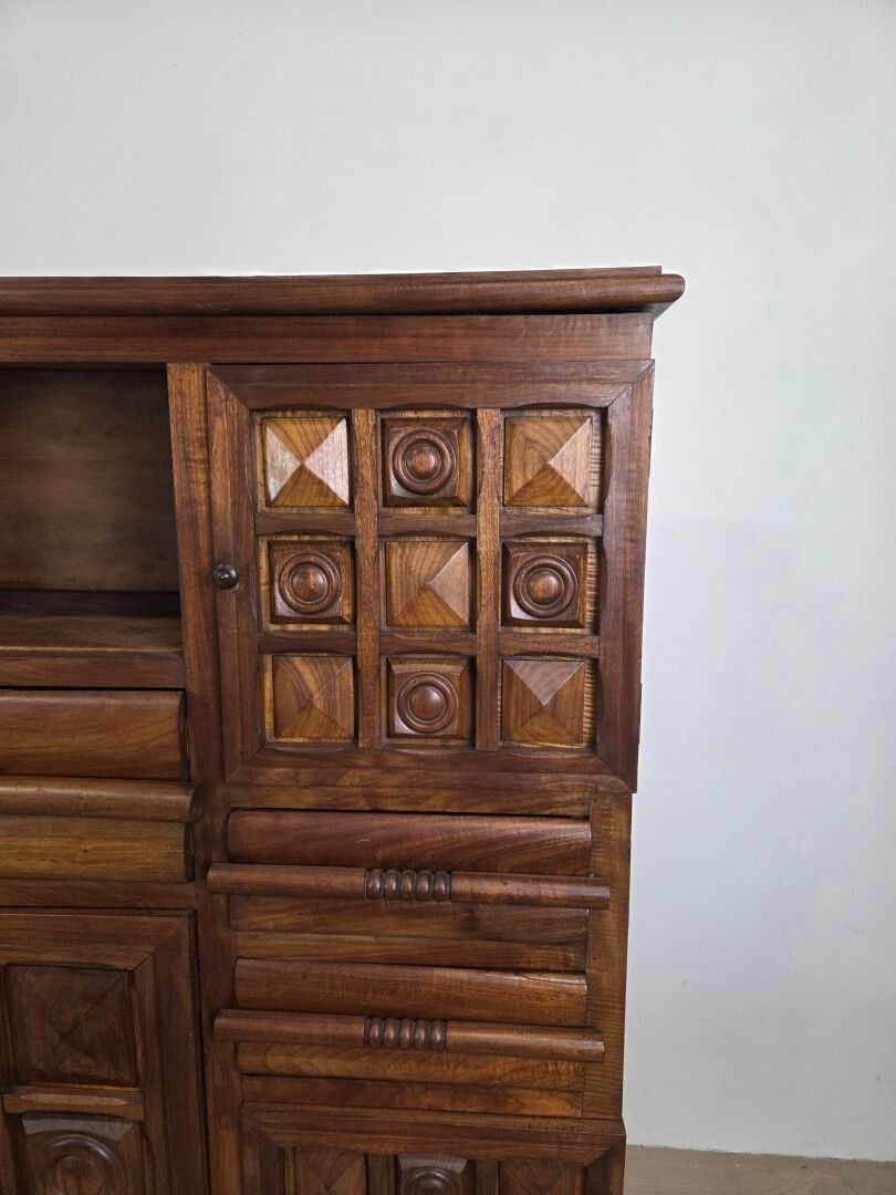 Charles DUDOUYT (1885-1946), attributed to. Buffet in natural wood carved and moulded with diamond points, fluting and circular motifs, opening with a central niche, five doors and five drawers (one side detached) 153.5 x 146 x 40 cm
