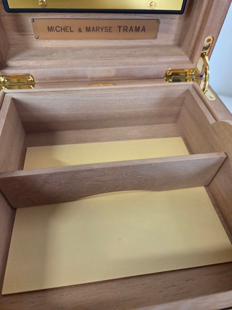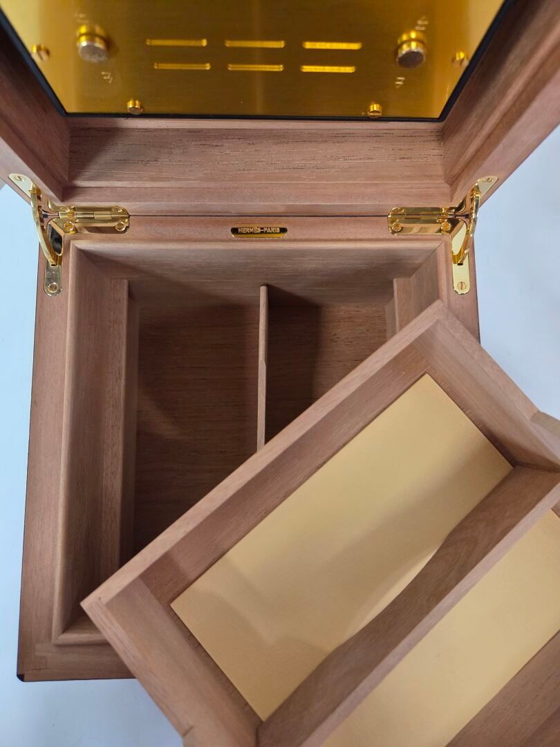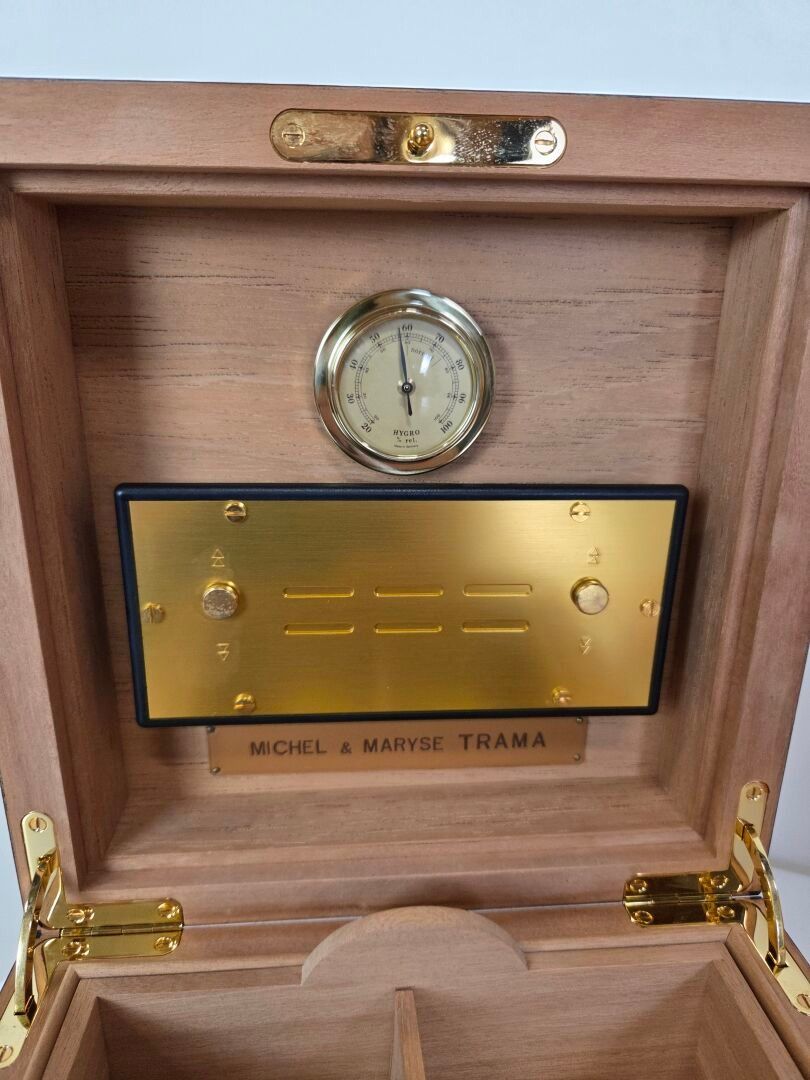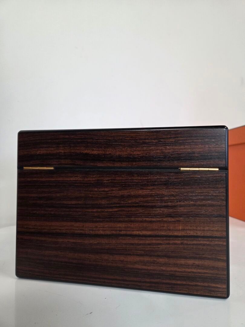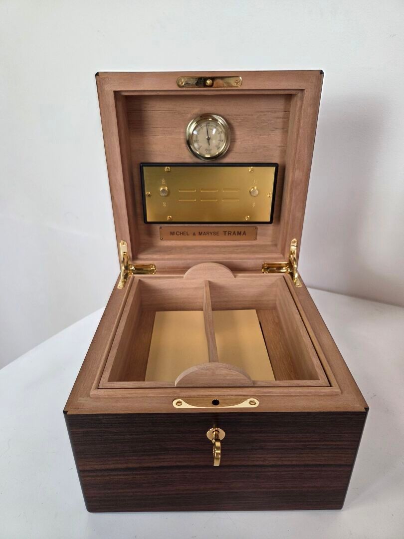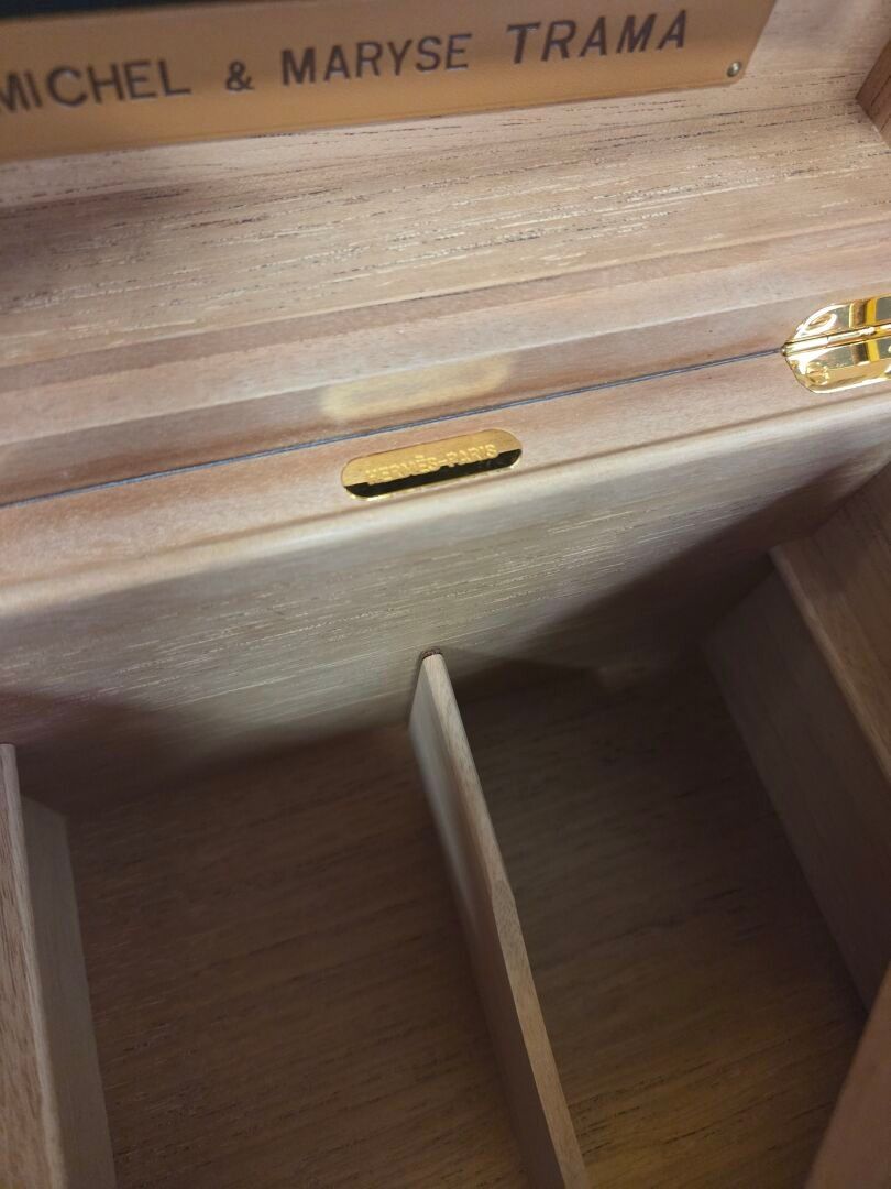 Square shape, with geometric decoration inlaid in ebony on the varnished Rio rosewood lid with red-brown and black highlights. The interior in Spanish cedar is fitted with a hygrometer with a gilded dial and a gilded humidifier. Removable compartmented top tray, gilt brass lock. Inner plate engraved "Michel et Maryse TRAMA", with its key in a "Hermès" pouch, special order. In its original box