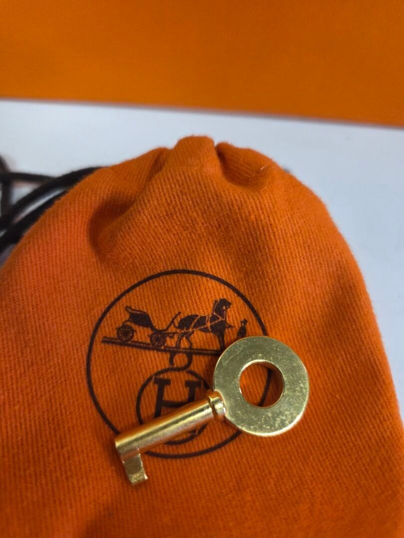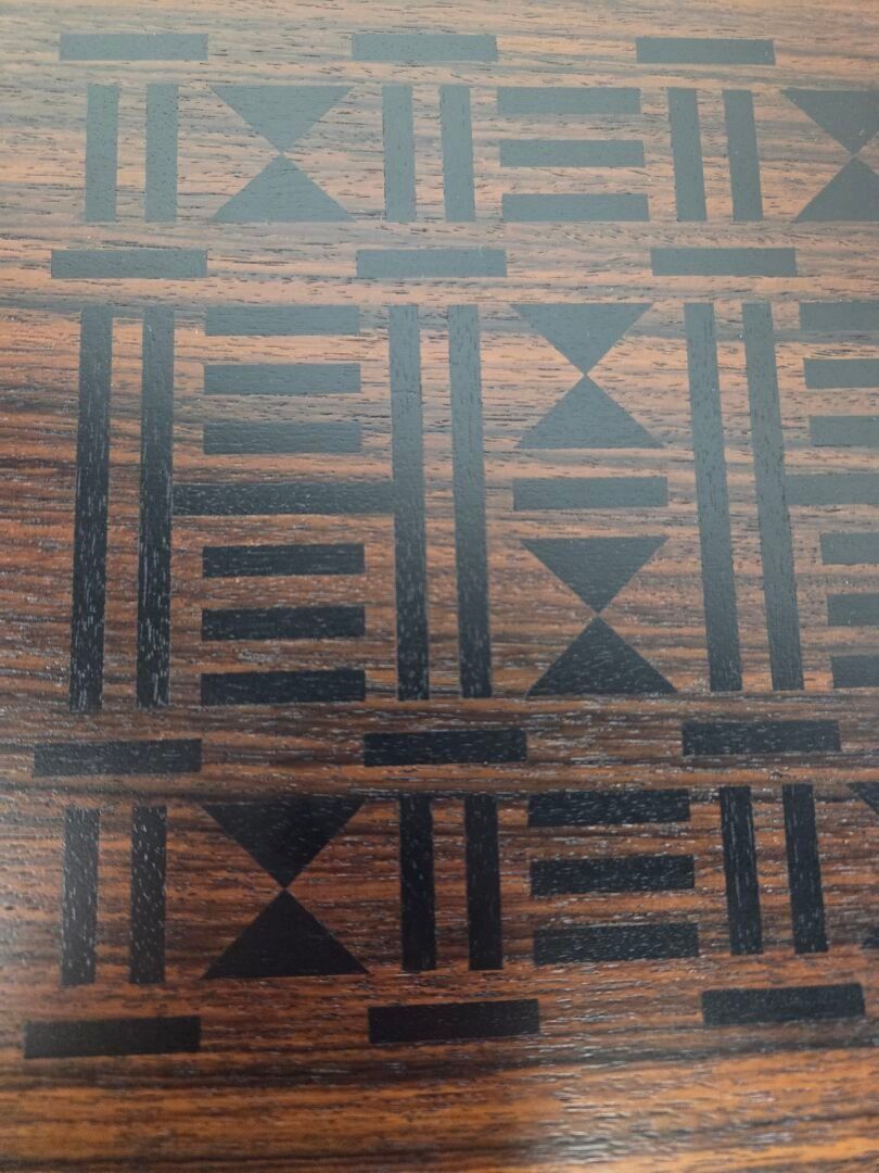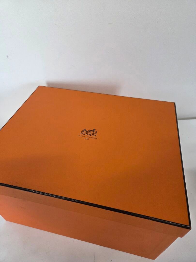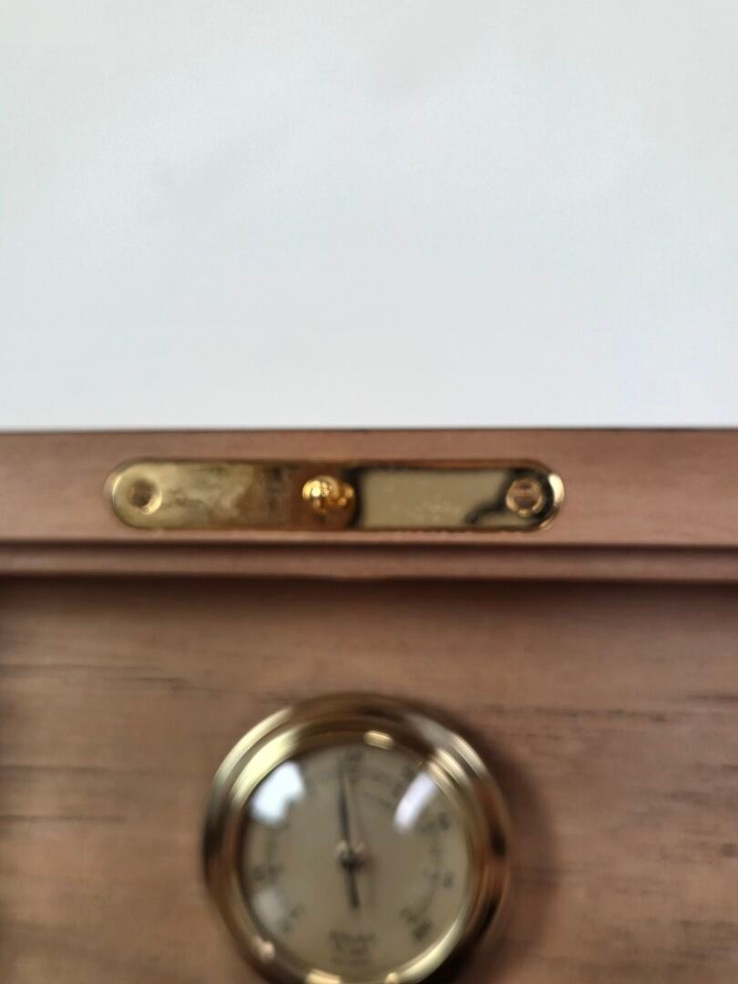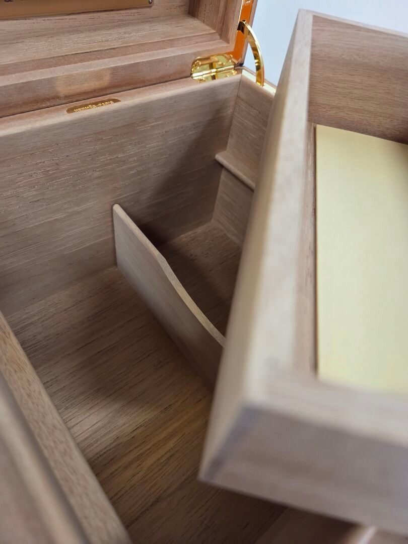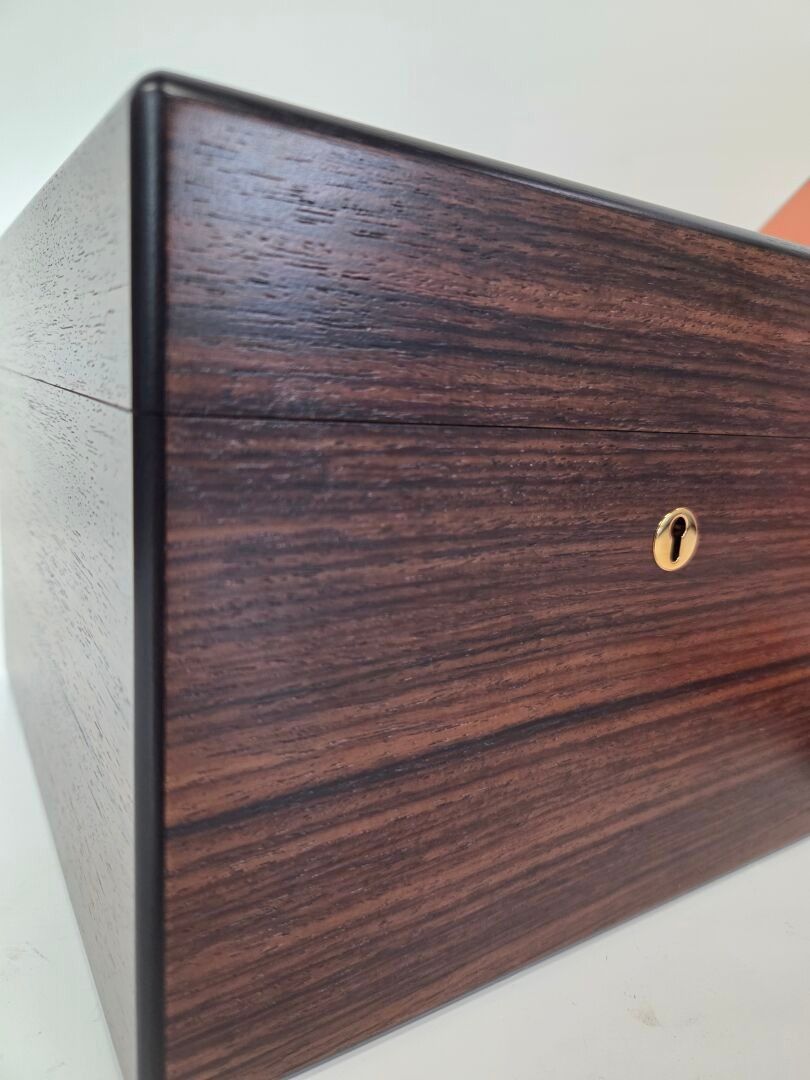 Square shape, with geometric decoration inlaid in ebony on the varnished Rio rosewood lid with red-brown and black highlights. The interior in Spanish cedar is fitted with a hygrometer with a gilded dial and a gilded humidifier. Removable compartmented top tray, gilt brass lock. Inner plate engraved "Michel et Maryse TRAMA", with its key in a "Hermès" pouch, special order. In its original box