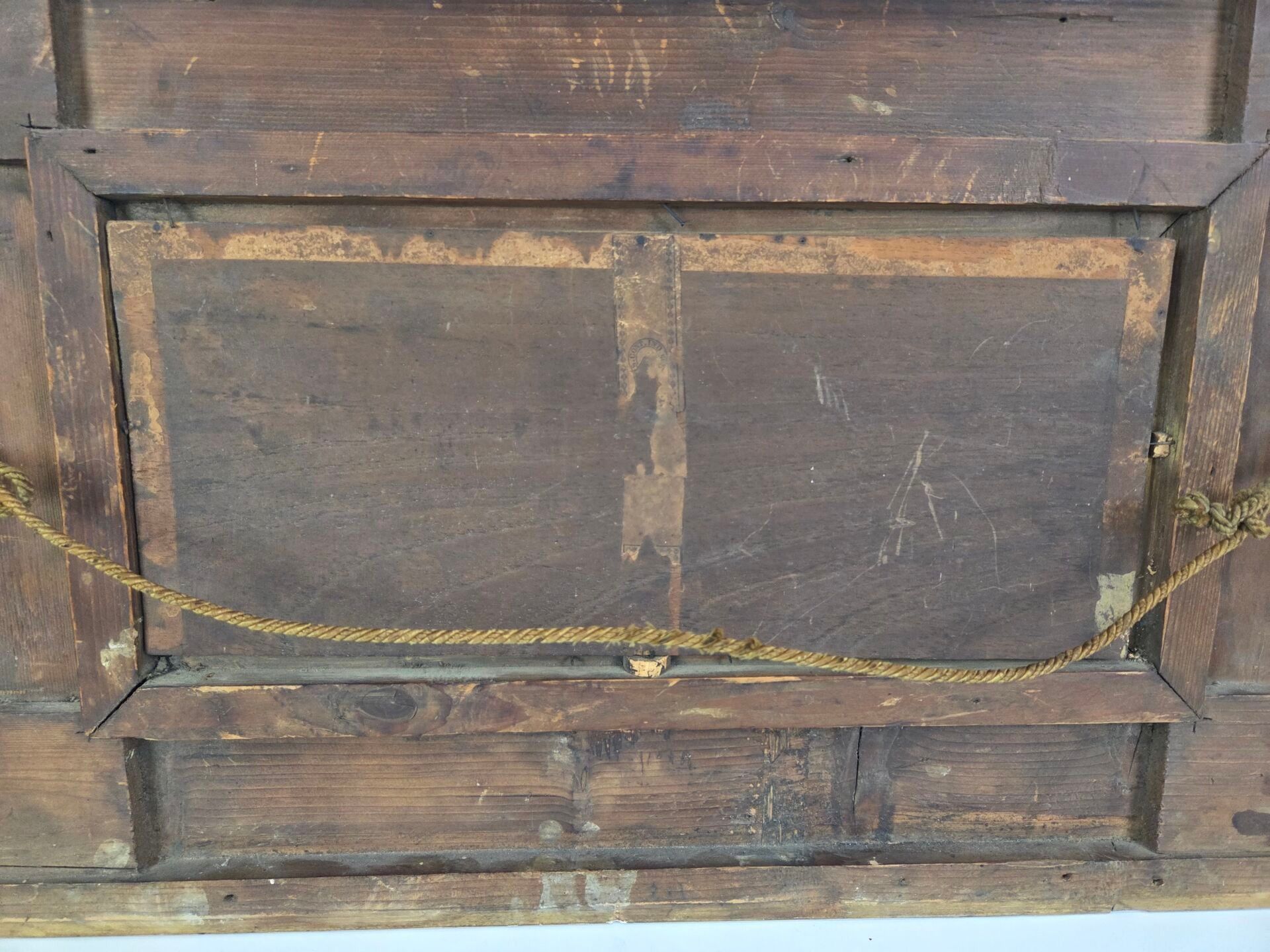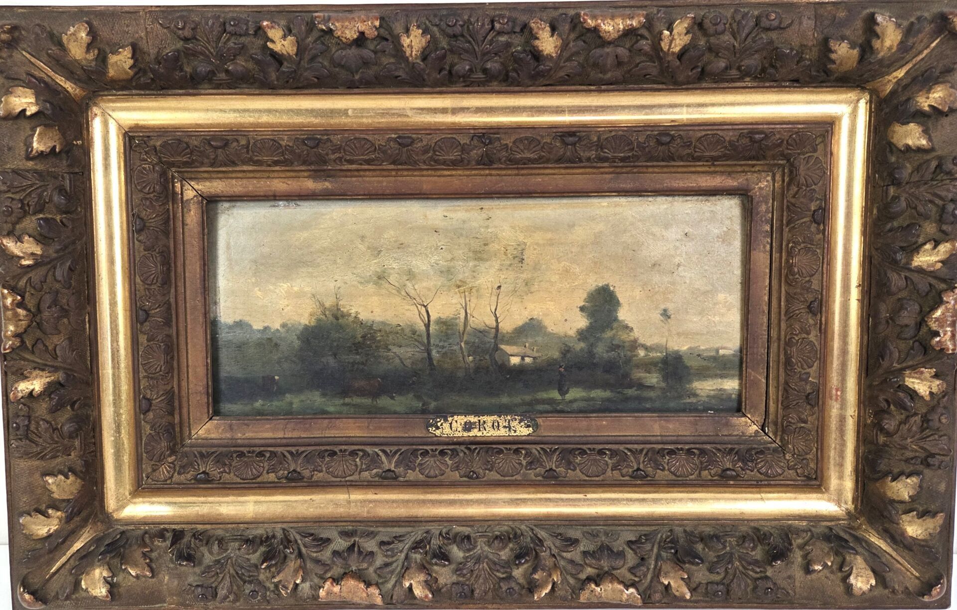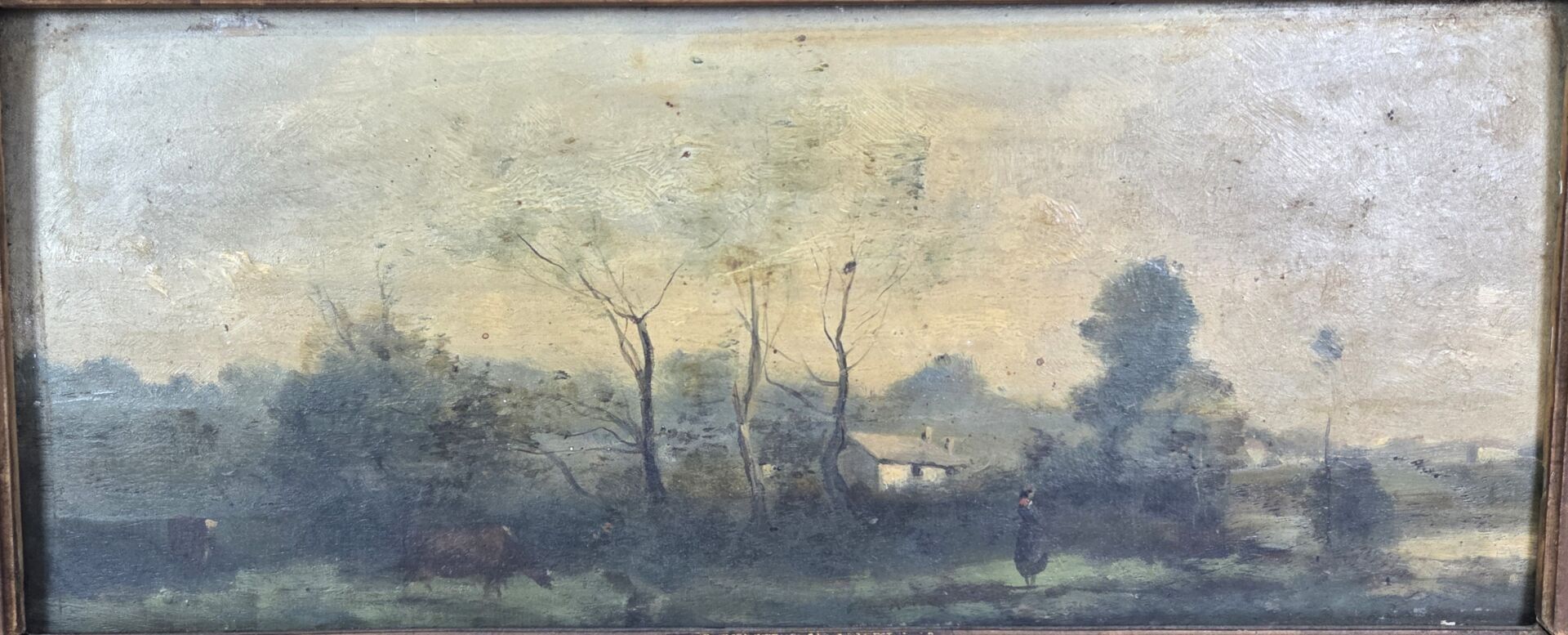 Follower of Corot, animated landscape, oil on panel, frame with Corot cartouche, 39 x 16 cm