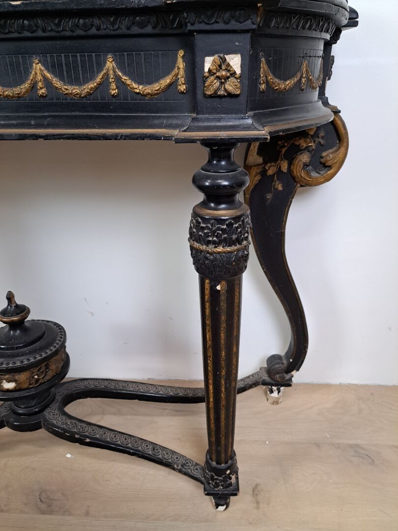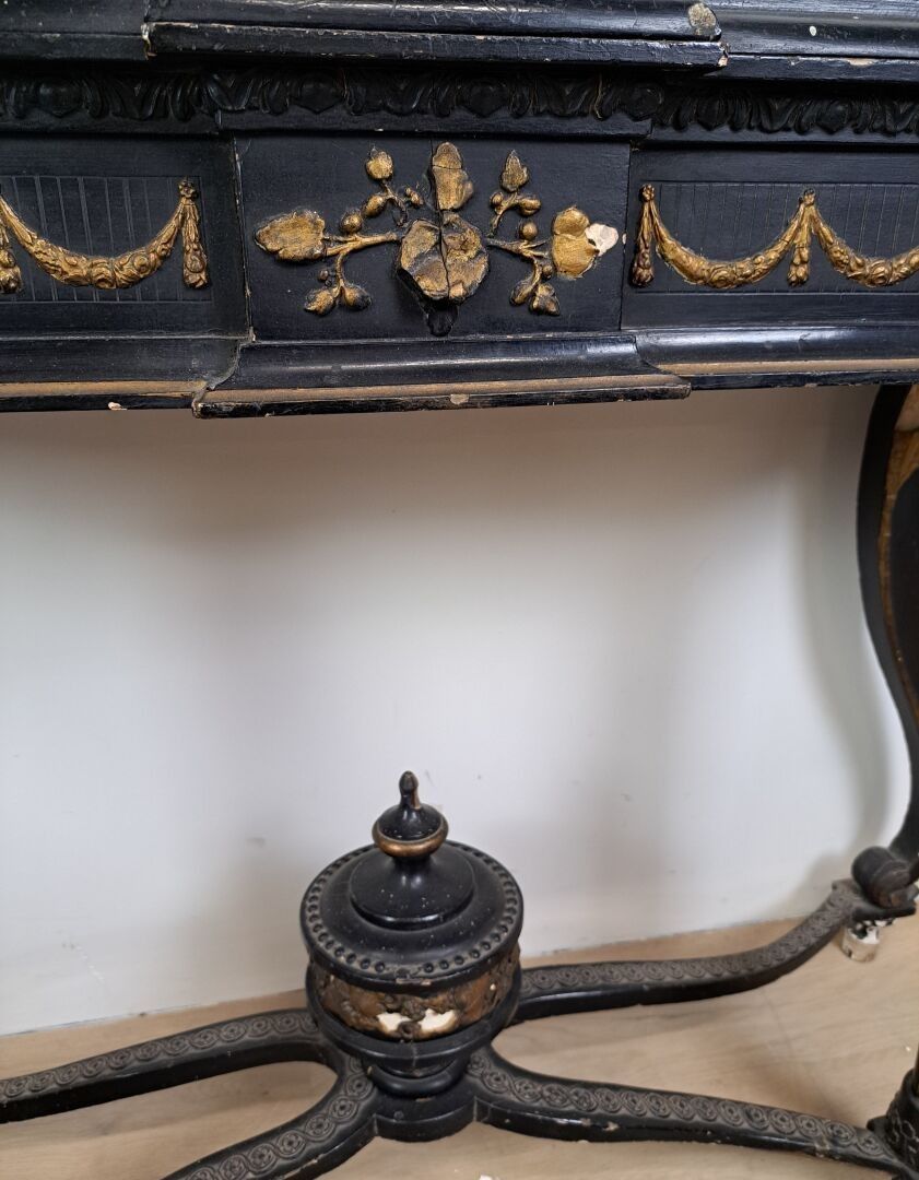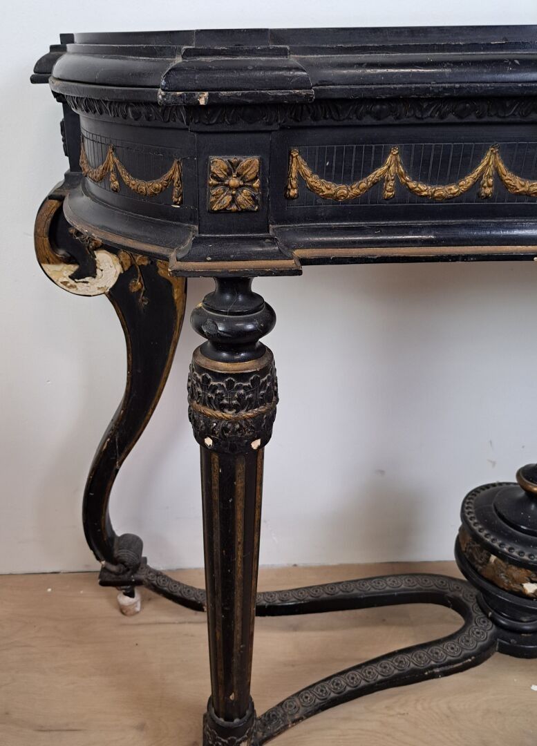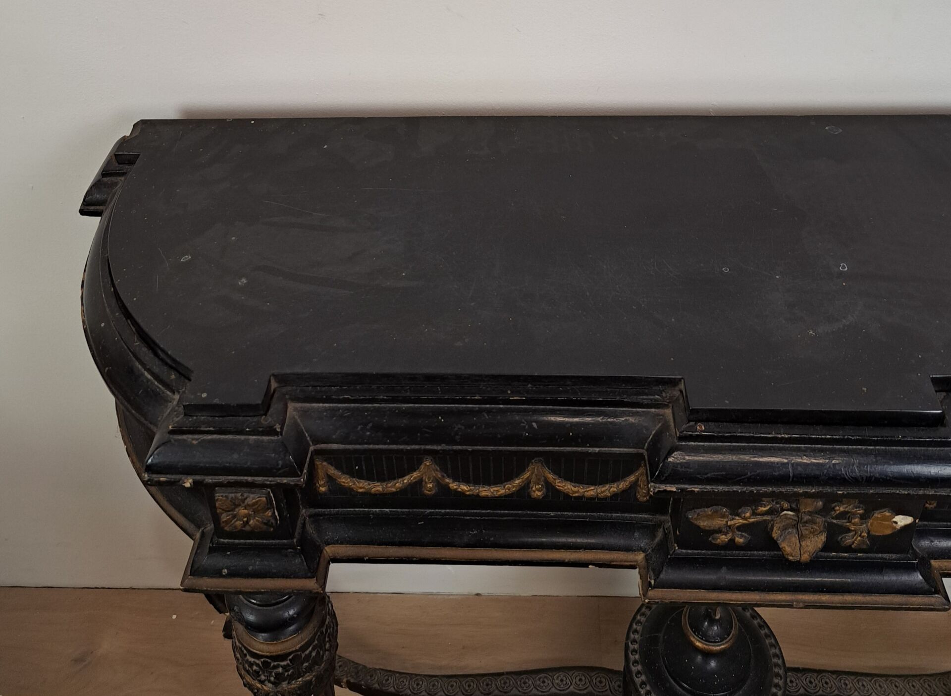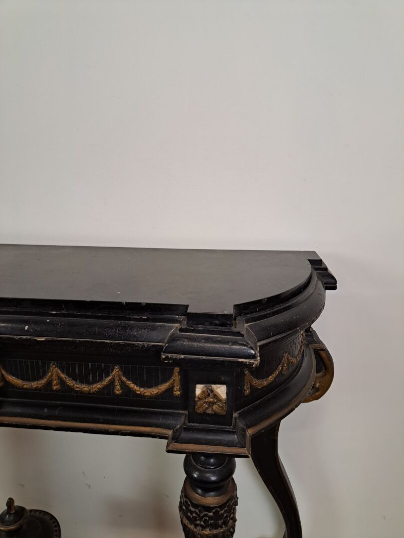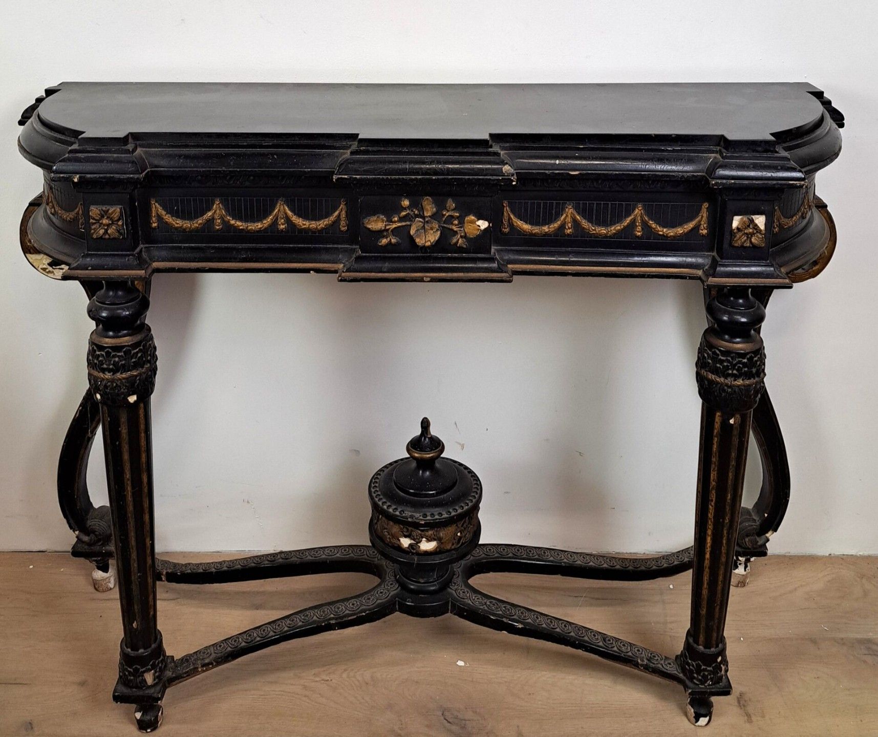 Blackened wood console table, stretcher decorated with a cassolette, black marble top, Napoleon III period - 119 x 83 x 35 cm ( chips and accidents )