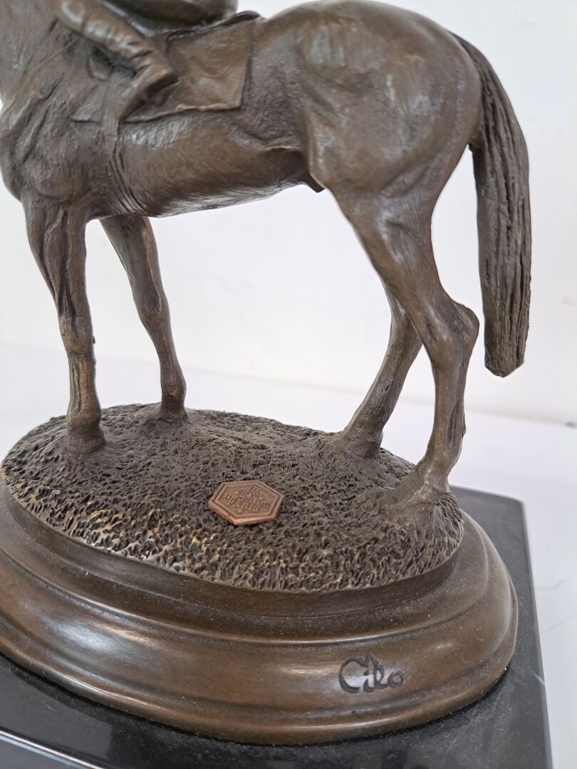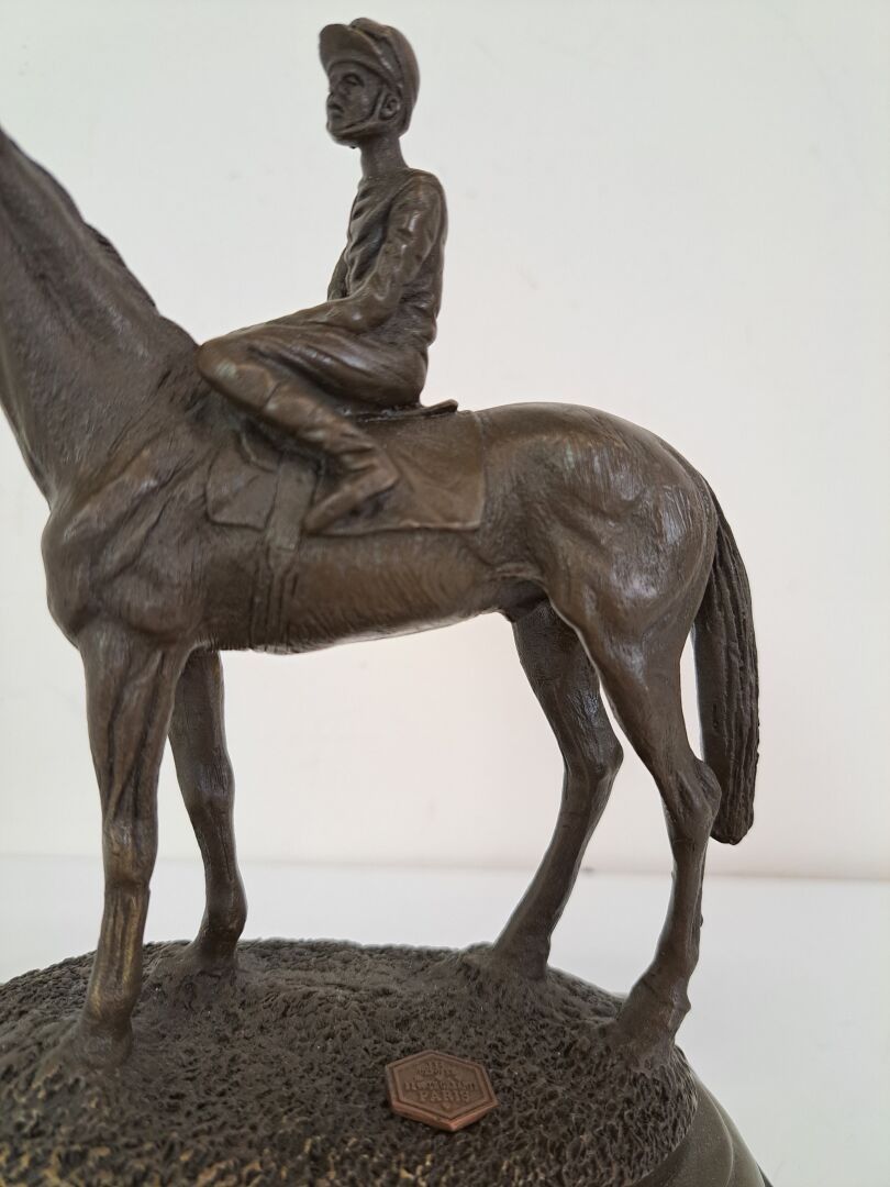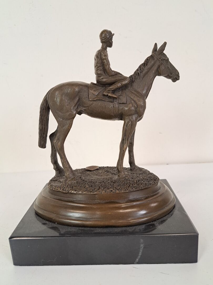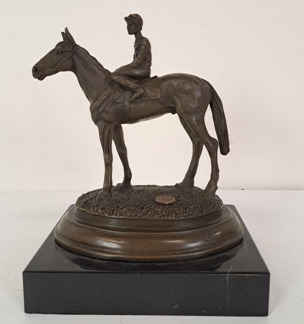 Miguel Fernando LOPEZ known as MILO (born 1955). Jockey in the saddle, medal patina on a marble base, stamped JB - Height: 19 cm