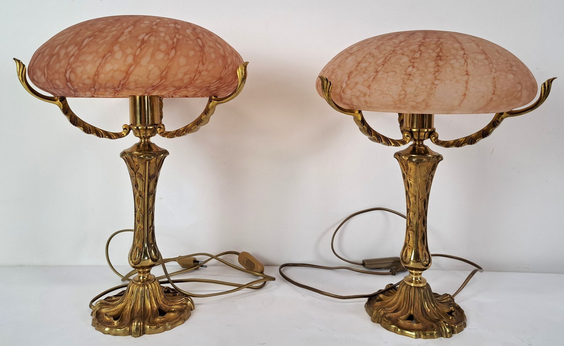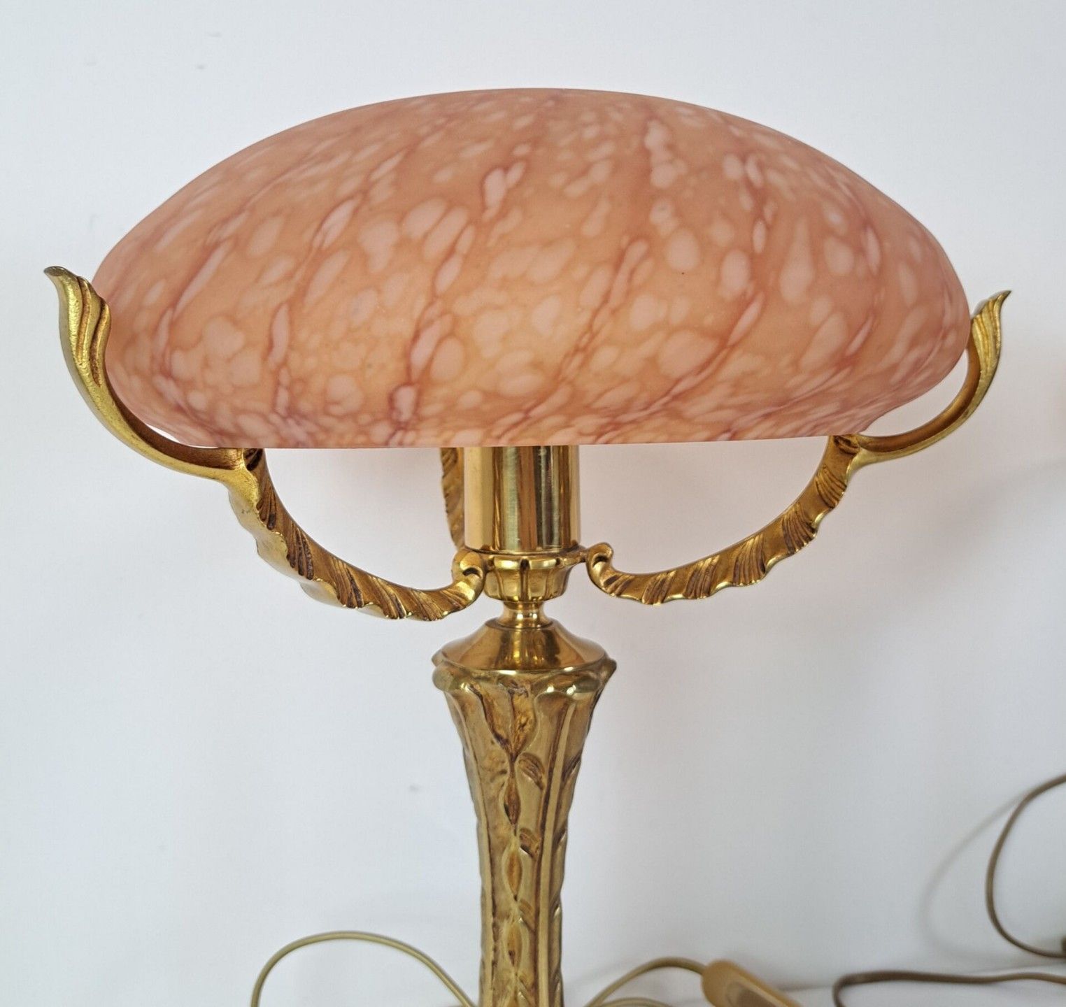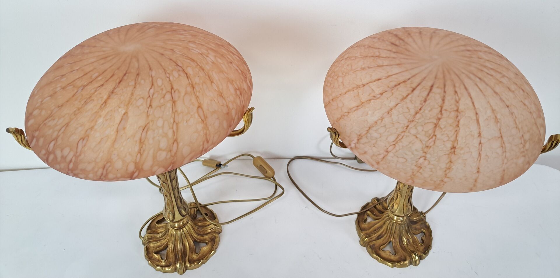 Pair of Art Deco ormolu lamps with pink pâte de verre shades - Height: 44 cm