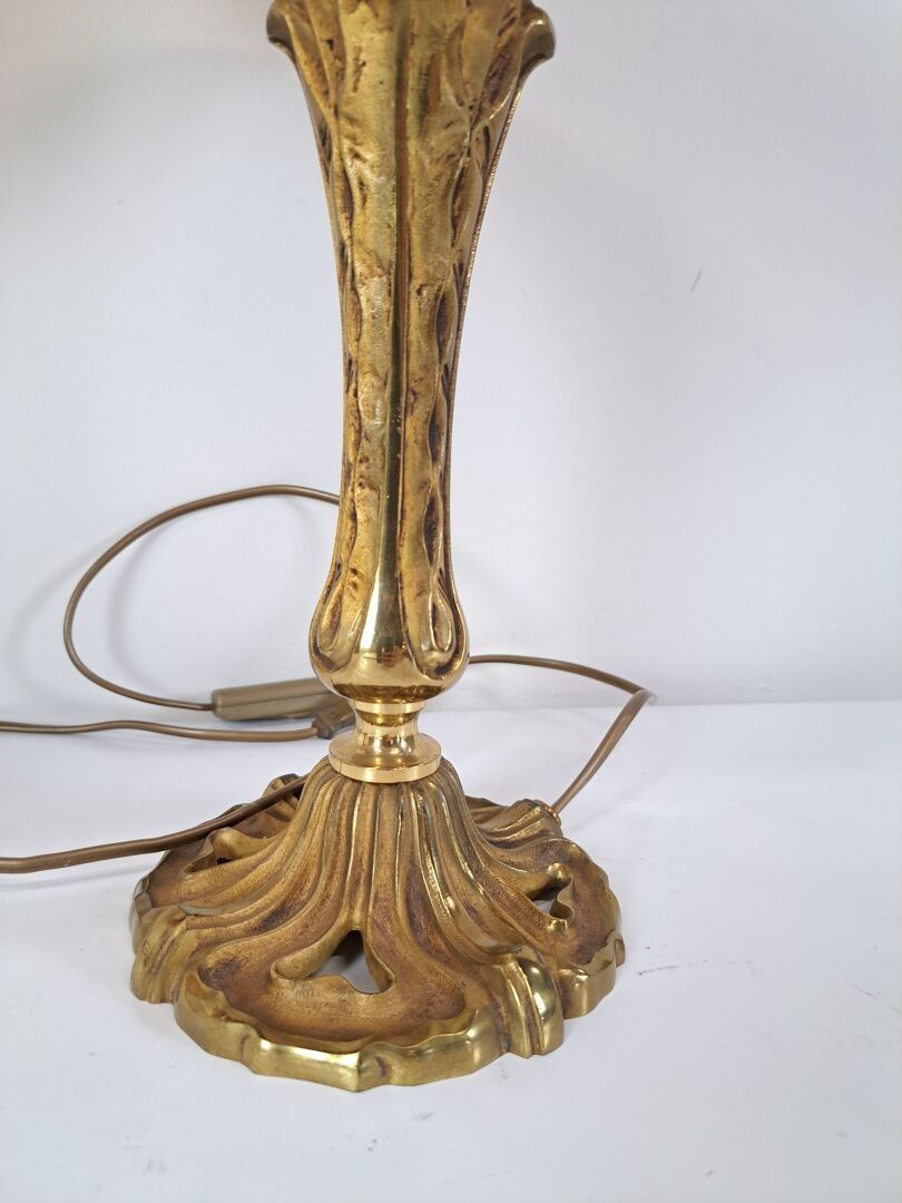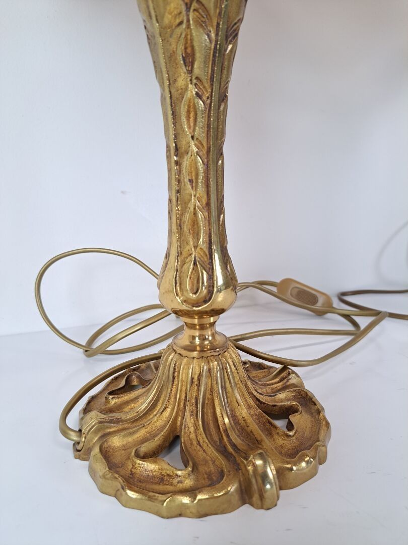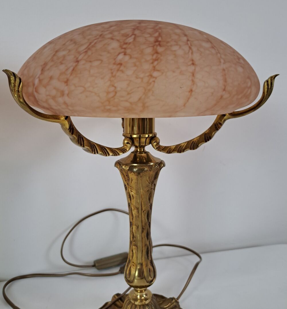 Pair of Art Deco ormolu lamps with pink pâte de verre shades - Height: 44 cm