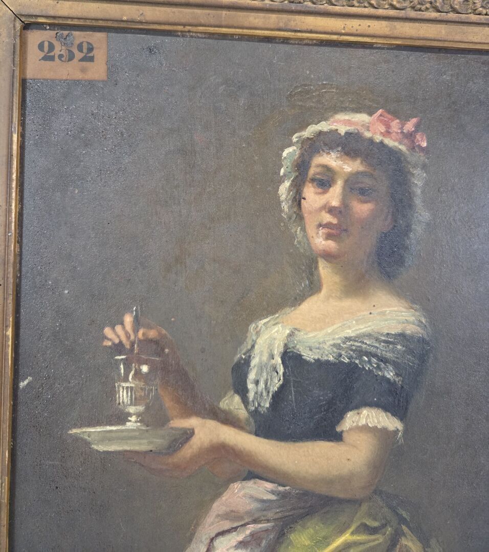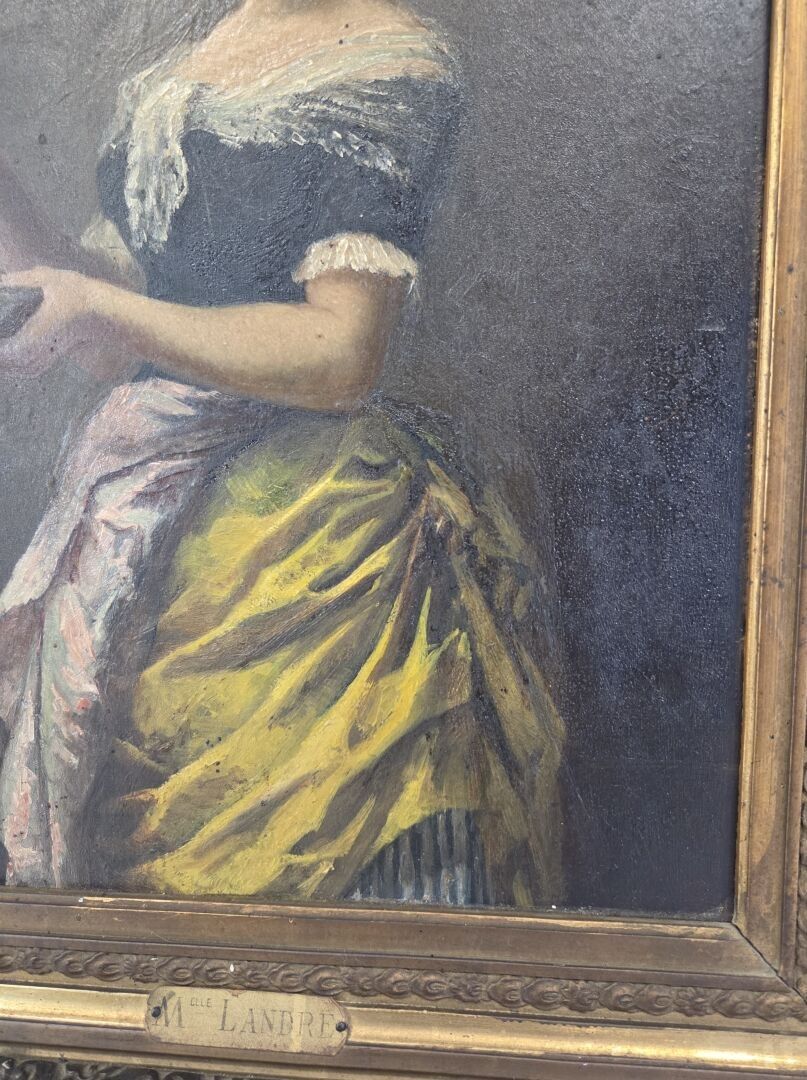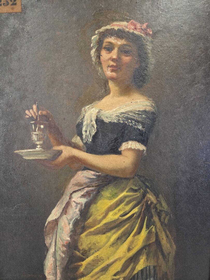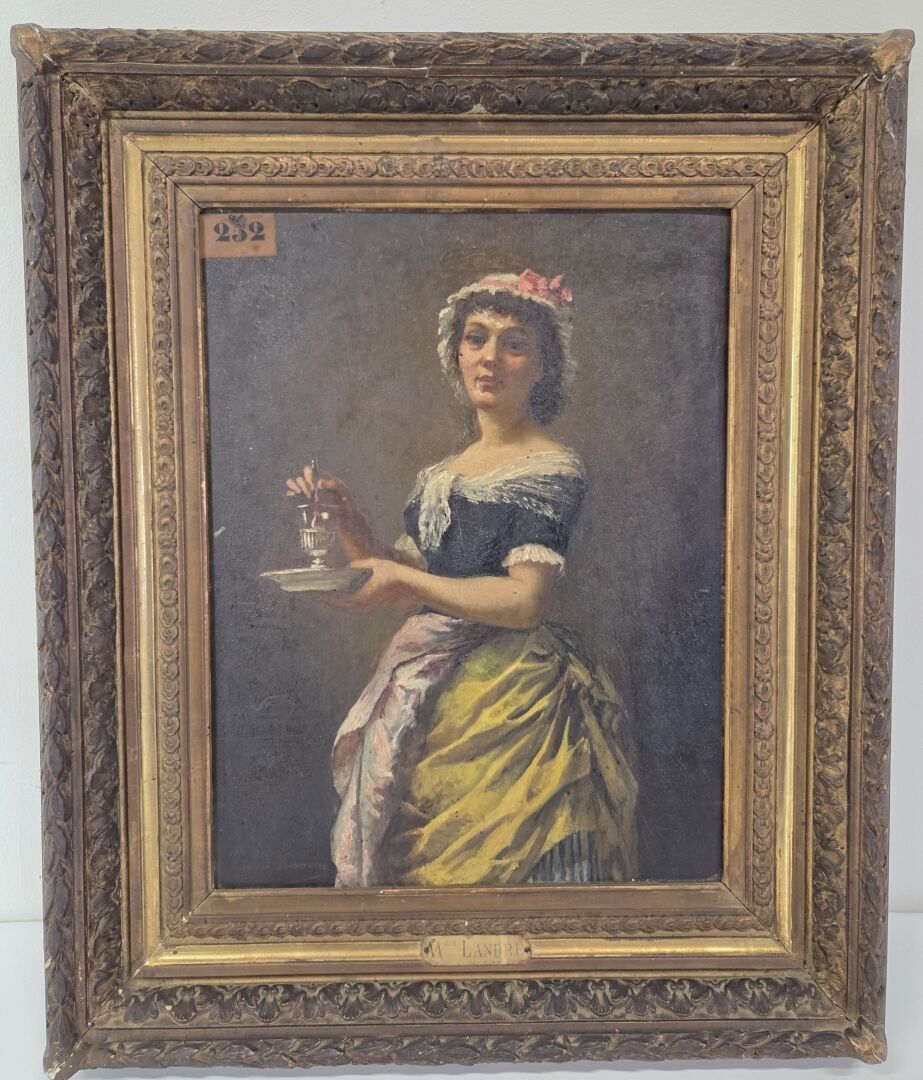 19th century school, Young woman serving tea, oil on canvas - 40 x 30 cm. Carries on the frame a cartouche engraved "Mlle Landre".