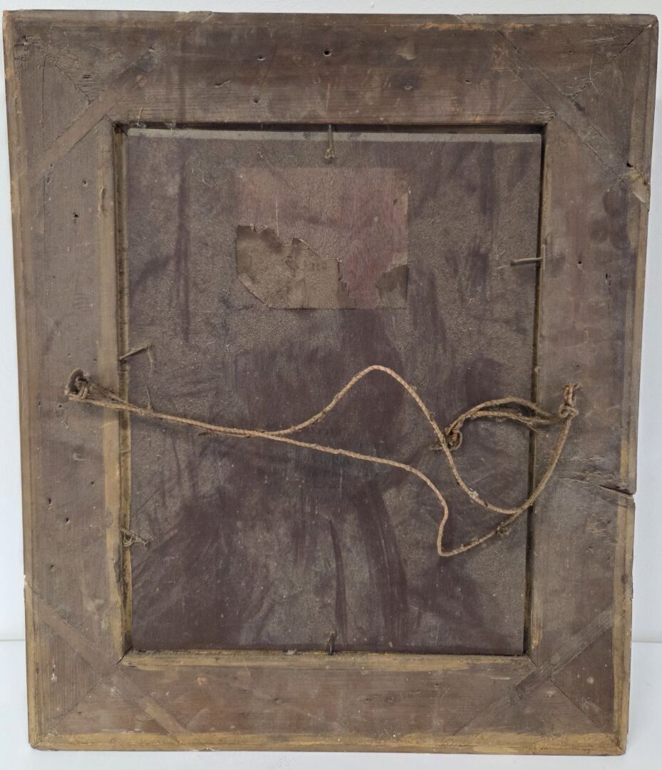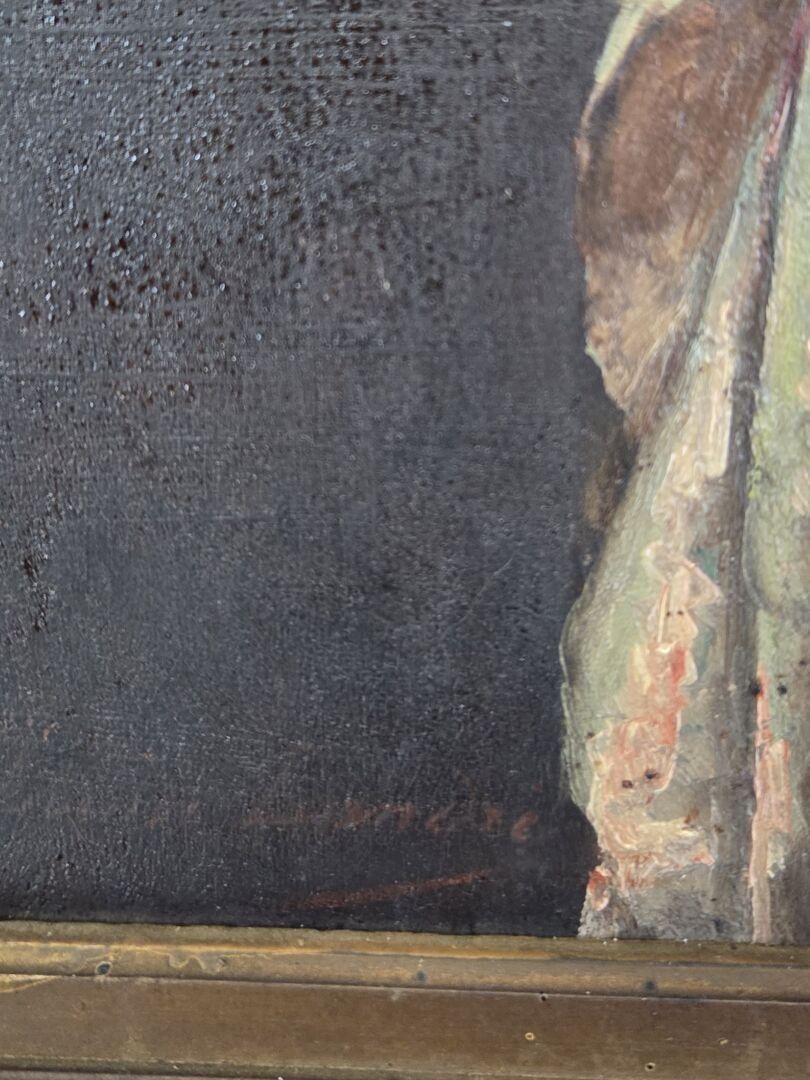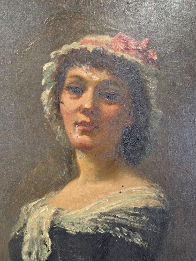 19th century school, Young woman serving tea, oil on canvas - 40 x 30 cm. Carries on the frame a cartouche engraved "Mlle Landre".