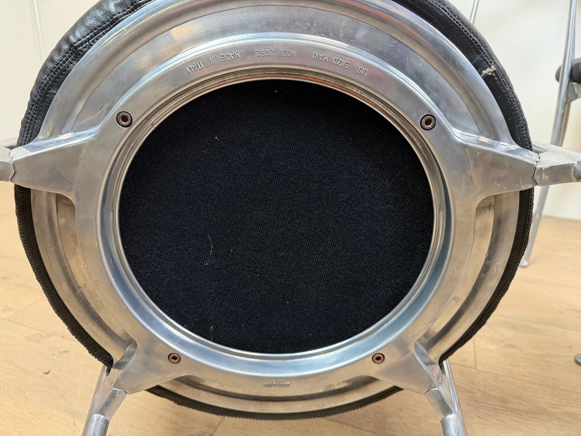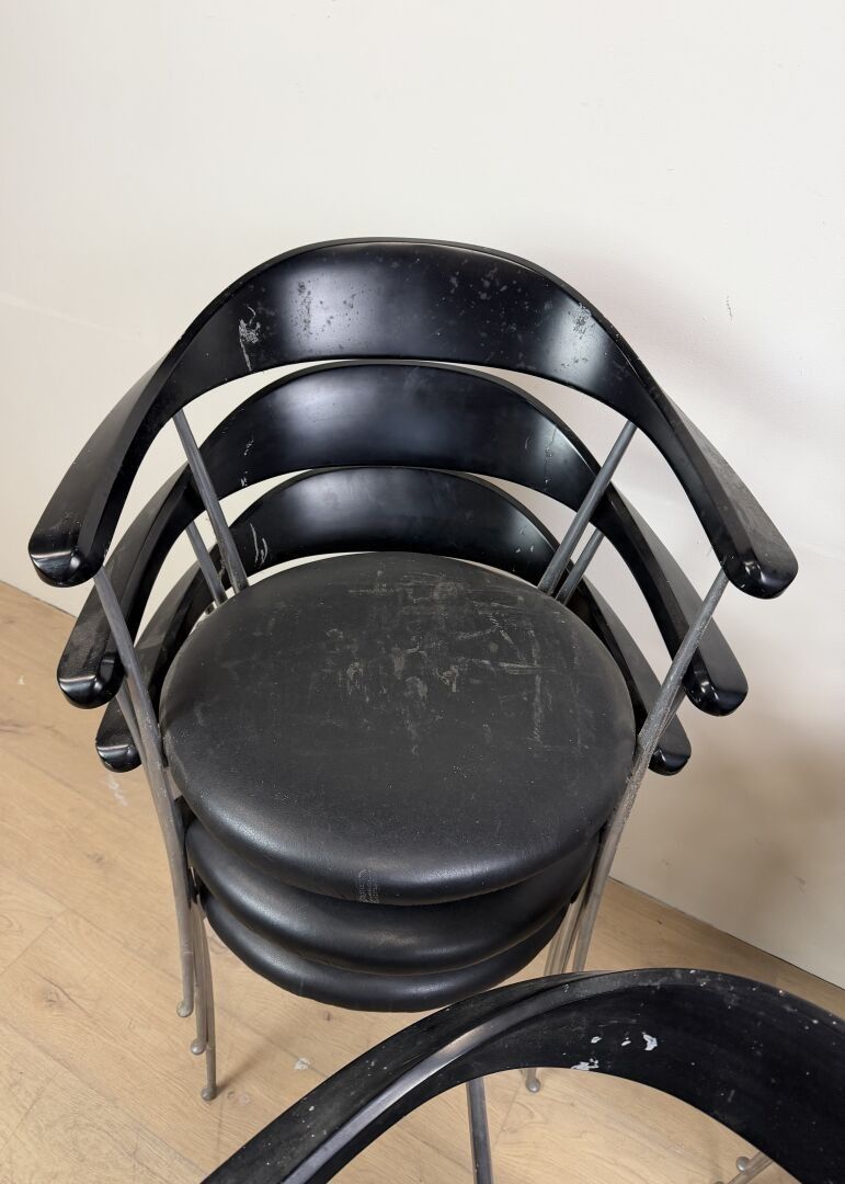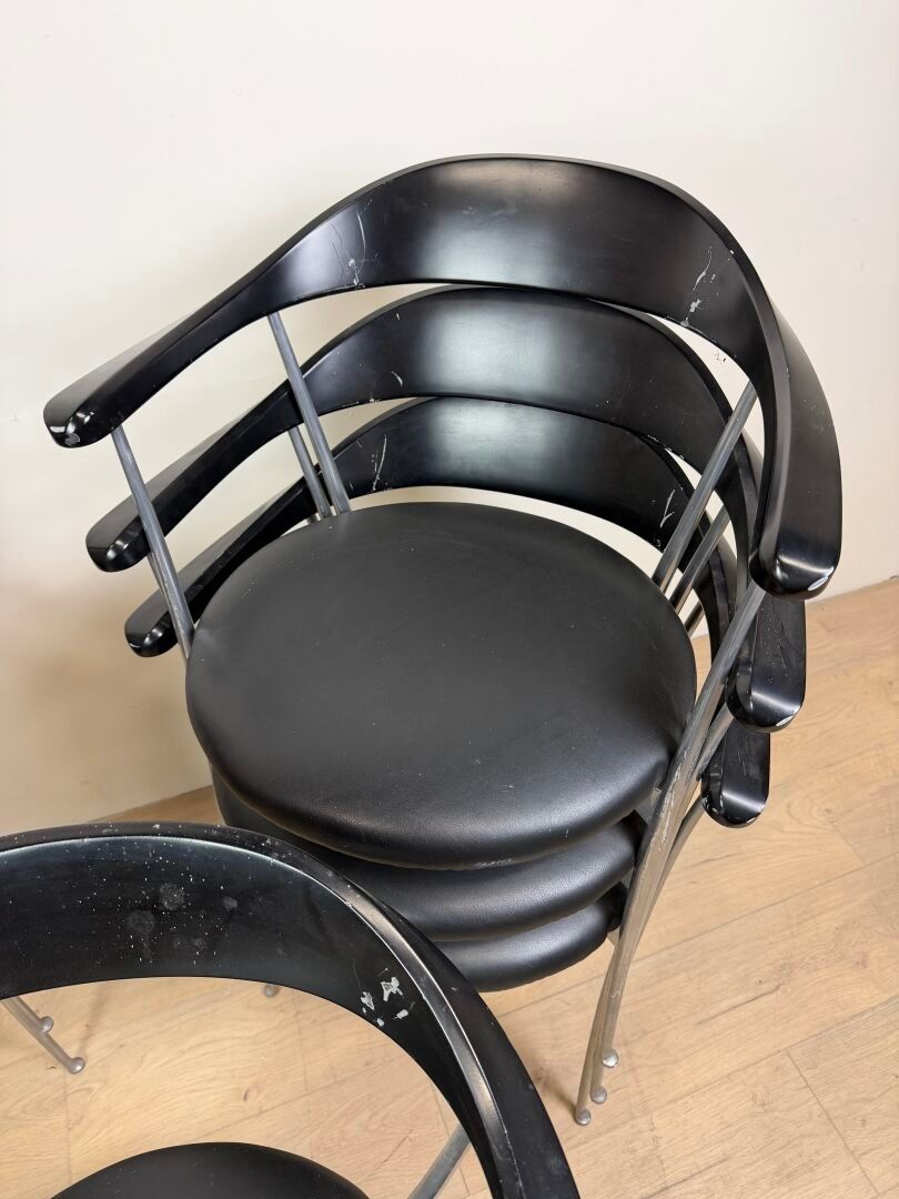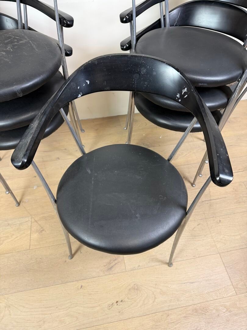 Enzo MARI for ZANOTTA, design from the 80s - Eight armchairs with chromed tubular steel frame, seats in moulded polyurethane covered in black skai and black lacquered beech slatted back, classic Italian design from the 80s.