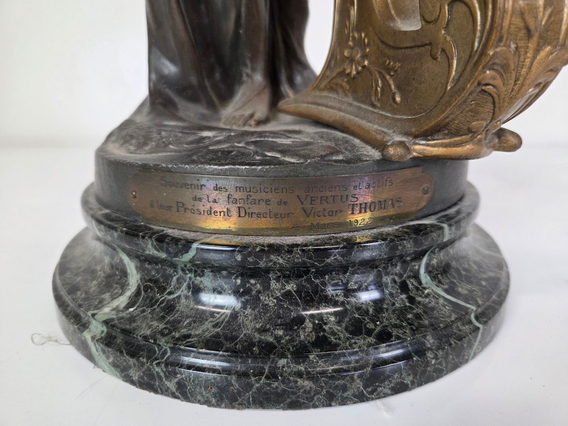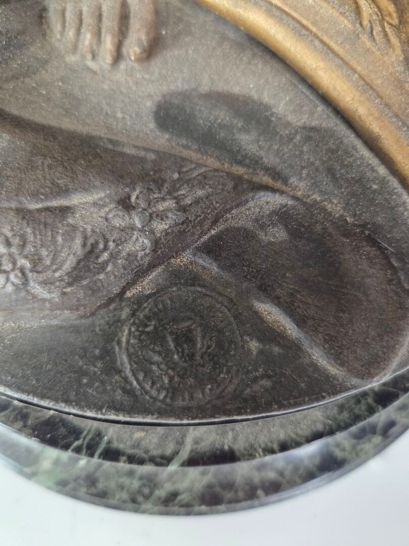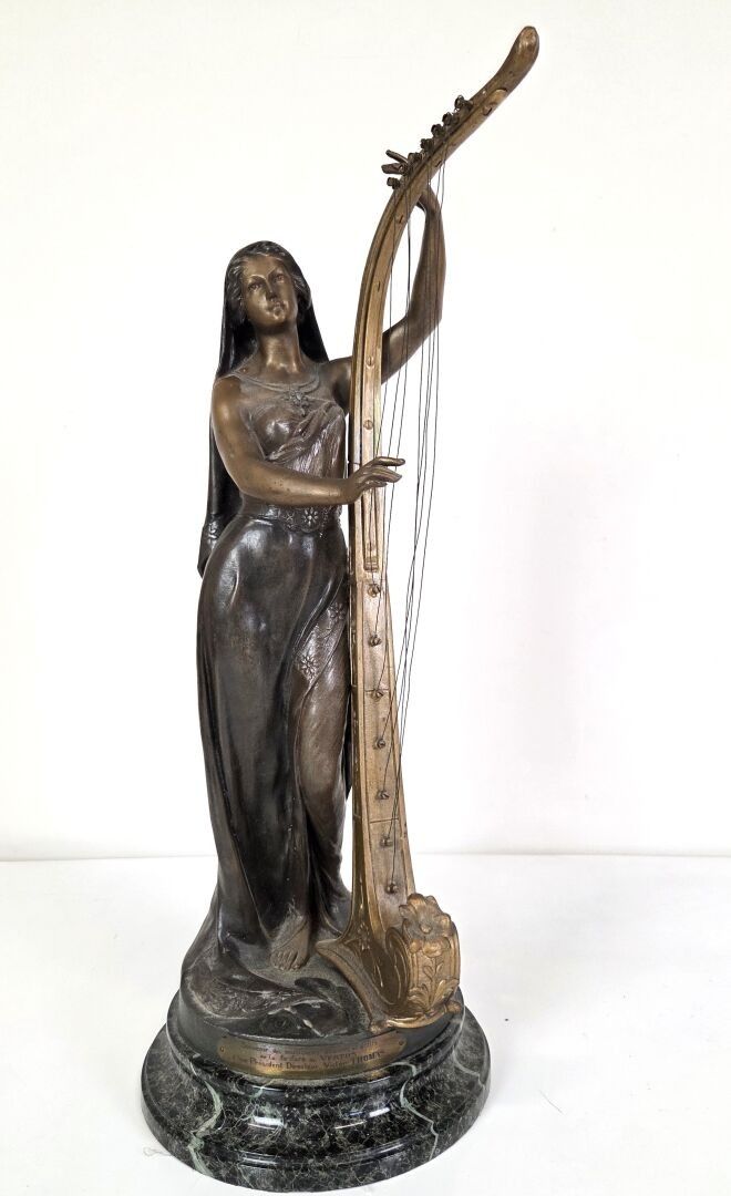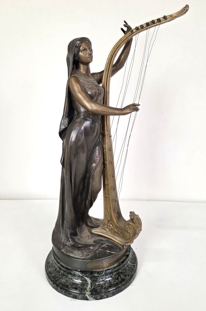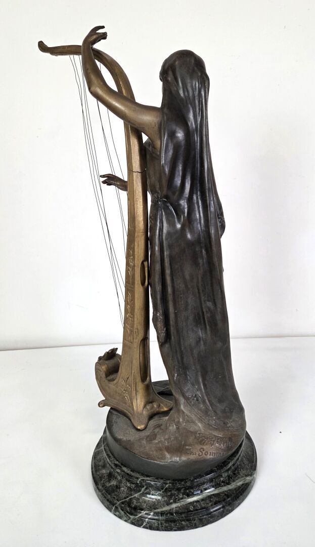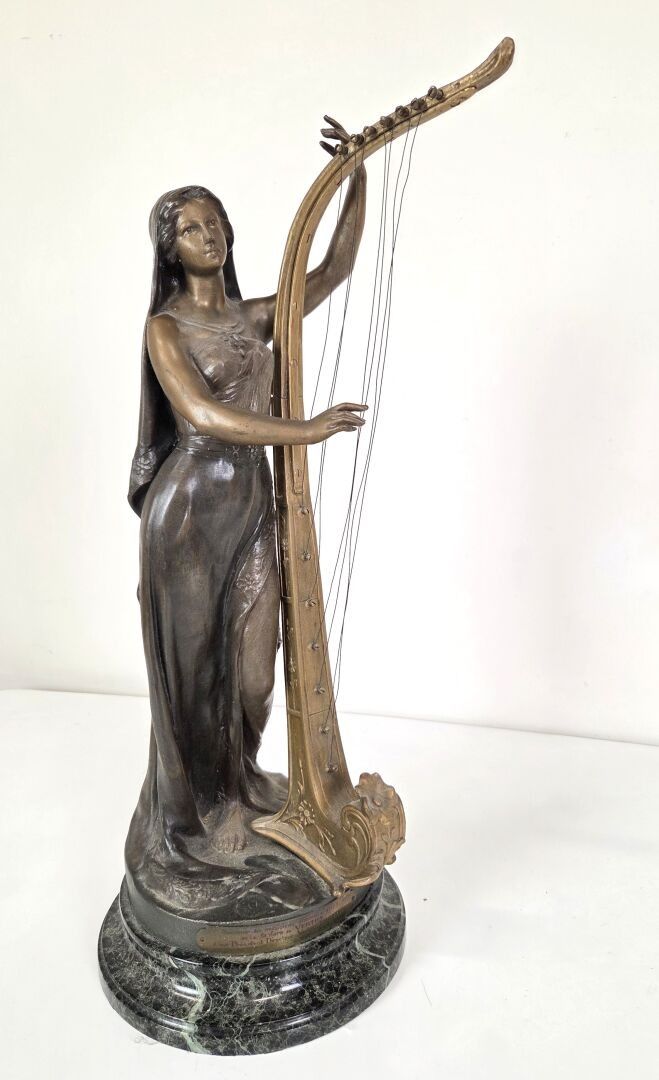 Théophile François SOMME (1871 - 1952), La Musique, a sculpture in regula with a medallion patina depicting a draped young woman playing a harp. Base in circular veined marble. Signed. Height : 61 cm