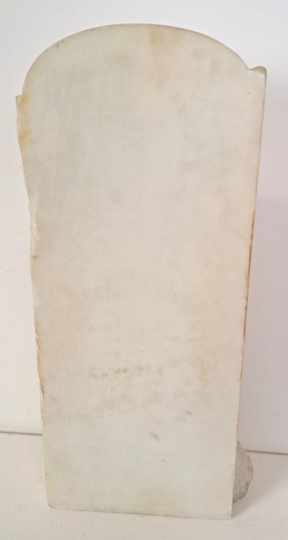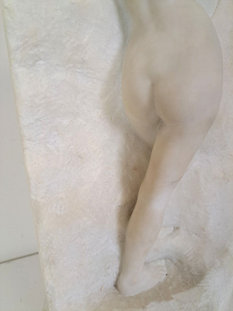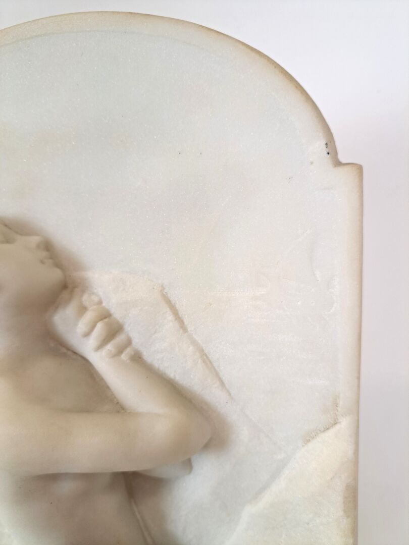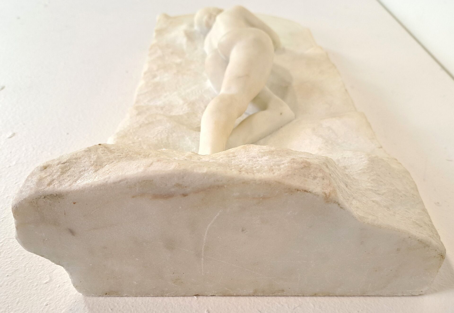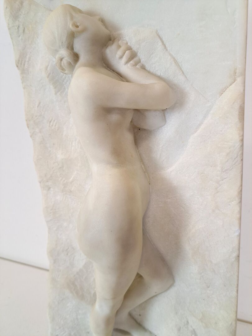 Alfred BOUCHER (1850-1934) - 19th century carved Carrara marble sculpture representing a nude woman in relief admiring a Mediterranean landscape with a sailboat from a rocky valley - Height: 49 cm